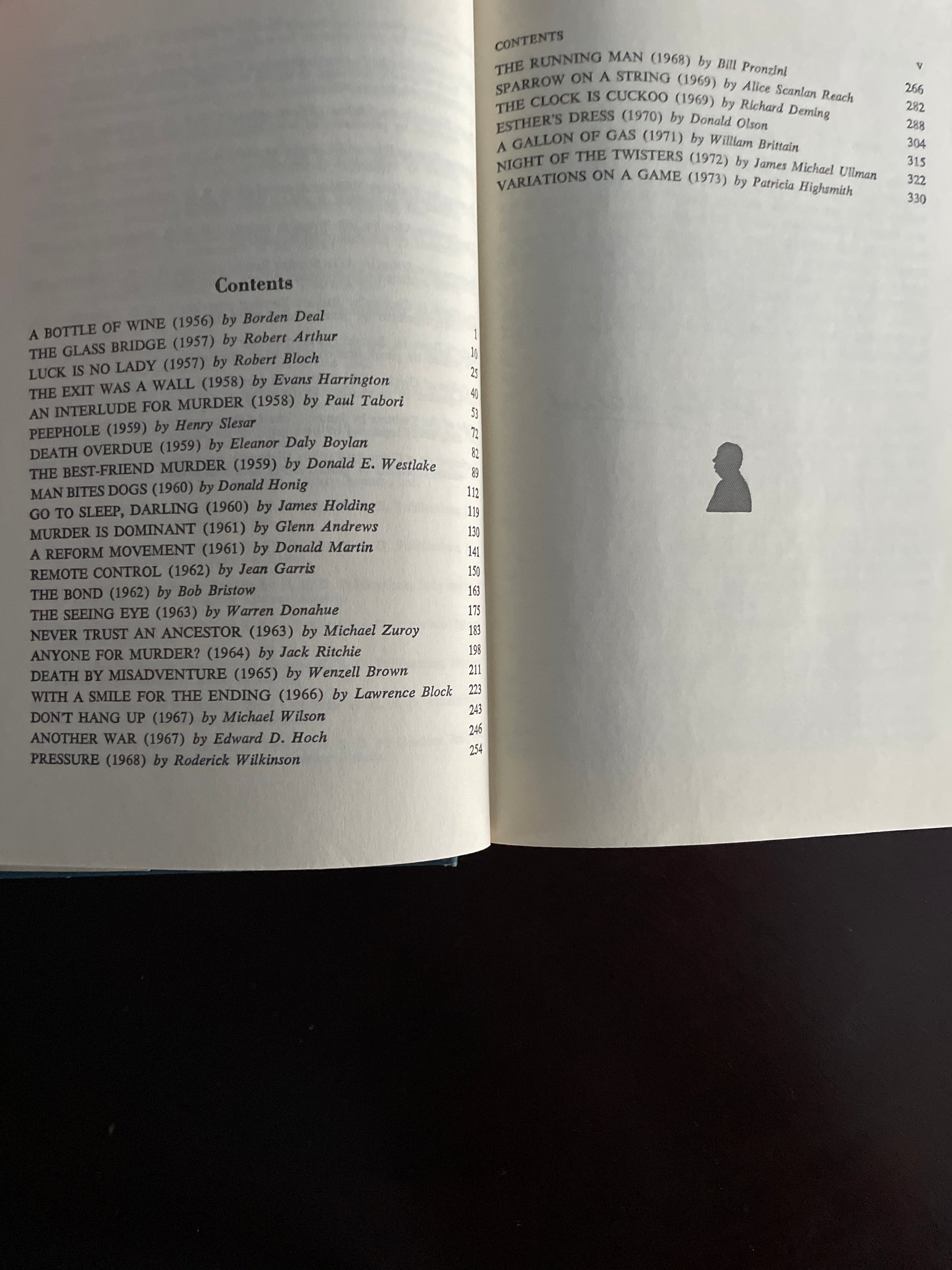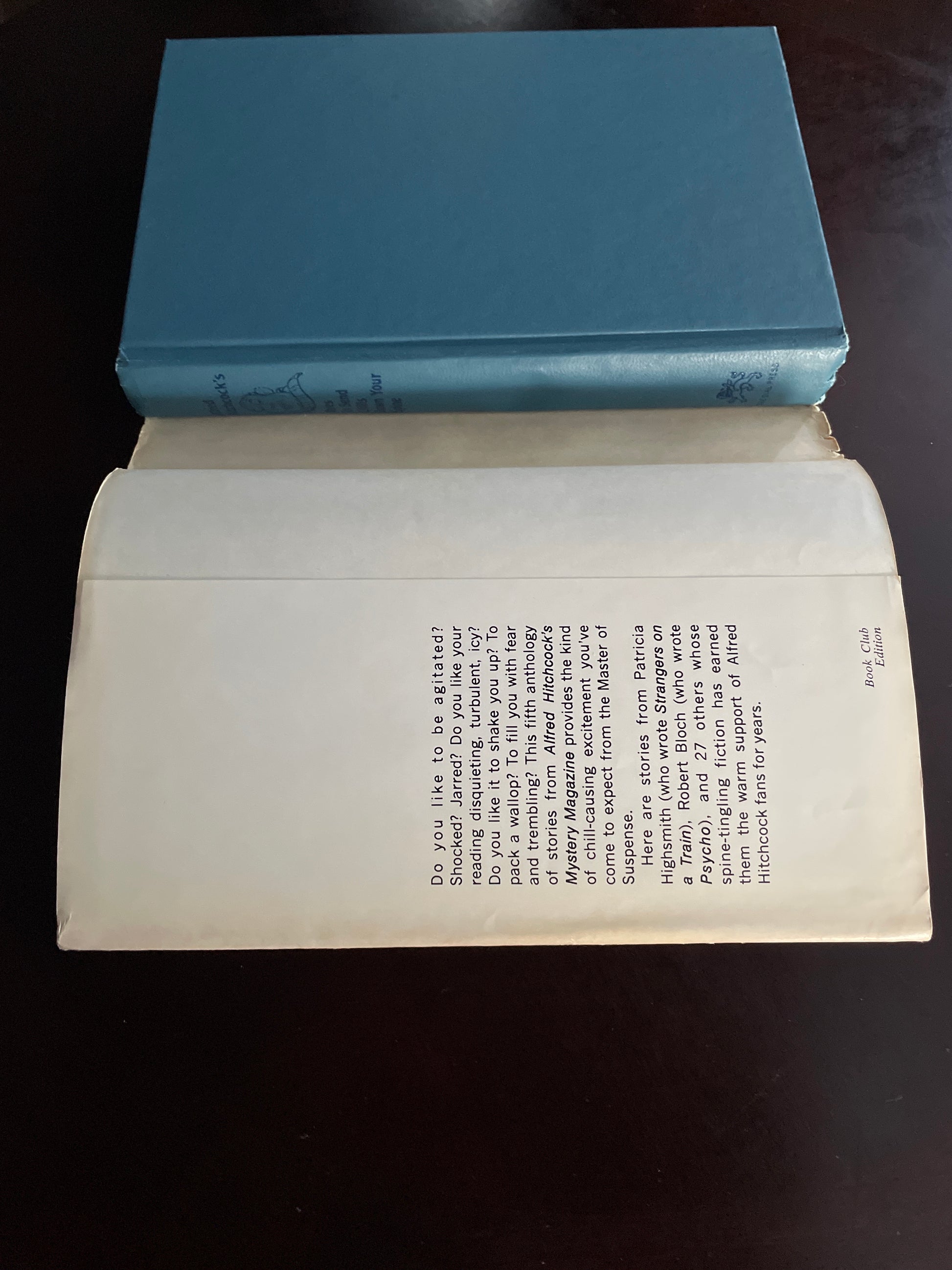 Clean, tight, unmarked; light wear to edges of dust jacket with some light rubbing and age tanning; blue cloth covers with navy titles and design; light bump to spine edge; otherwise very minimal wear; This fifth anthology of stories from Alfred Hitchcock's Mystery Magazine provides the kind of chill-causing excitement you've come to expect from the Master of Suspense. Hers are stories from Patricia Highsmith, Robert Bloch, and 27 others whose spine-tingling fiction has earned them the warm support of Alfred Hitchcock fans for years.
