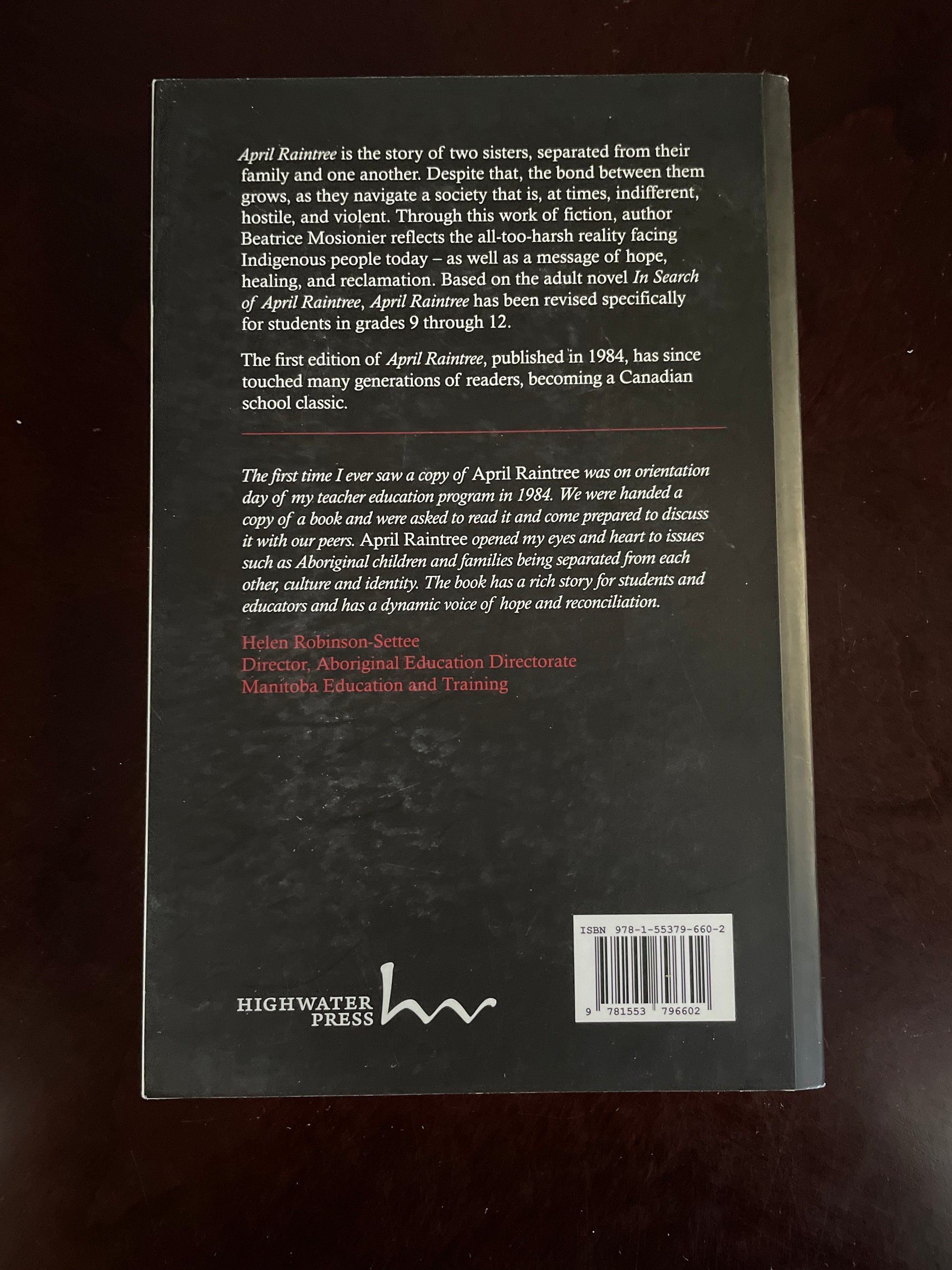 Clean, tight, unmarked; two creases to spine; otherwise very minimal wear; Based on the adult novel "In Search of April Raintree, April Raintree has been revised specifically for students in grades 9 through 12. April Raintree is the story of two sisters separated from their family and one another. Despite that, the bond between them grows, as they navigate a society that is, at times, indifferent, hostile, and violent. Through this work of fiction, author Beatrice Mosionier reflects the all-too-harsh reality facing Indigenous people today - as well as a message of hope, healing, and reclamation.