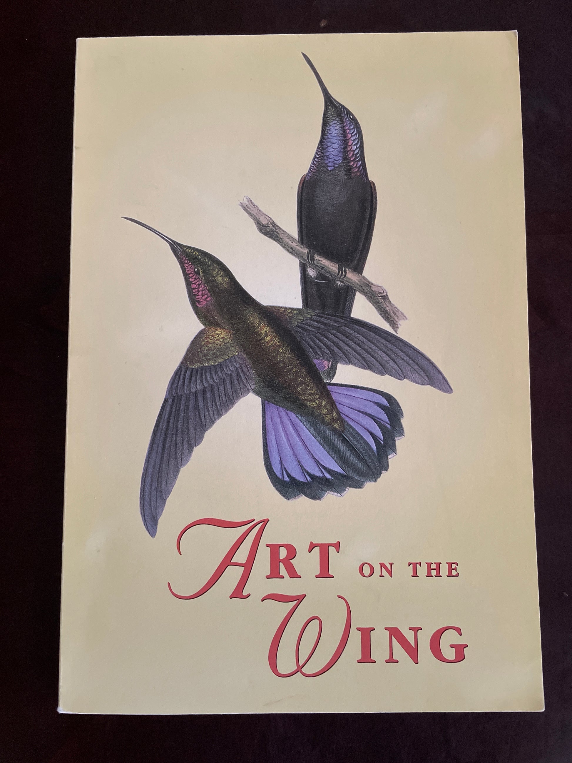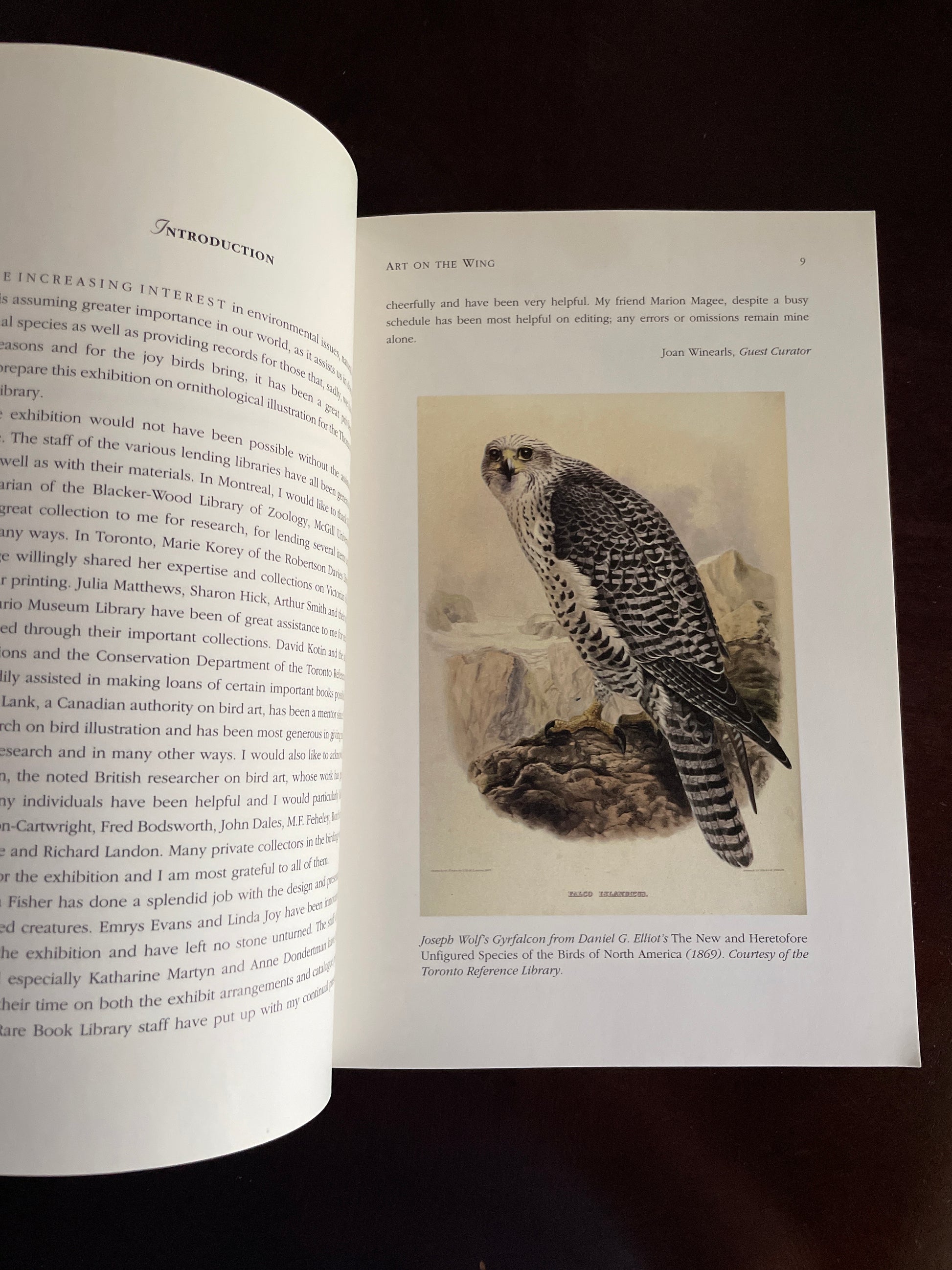 Clean, tight, unmarked; some light fading to upper back corner of paper covers close to spine; otherwise very minimal wear; appears unread; "Art on the Wing" is an exhibition curated by Joan Winearls that explores the evolution of bird art from the 18th to the 20th century. It showcases changing styles and techniques in avian illustration, including etching, engraving, wood-engraving, lithography, chromolithography, and photographic reproduction. The exhibition features works by notable artists like Gould, Lear, Wolf, Audubon, Fuertes, Brooks, and Shortt." - Thomas Fisher Rare Book Library