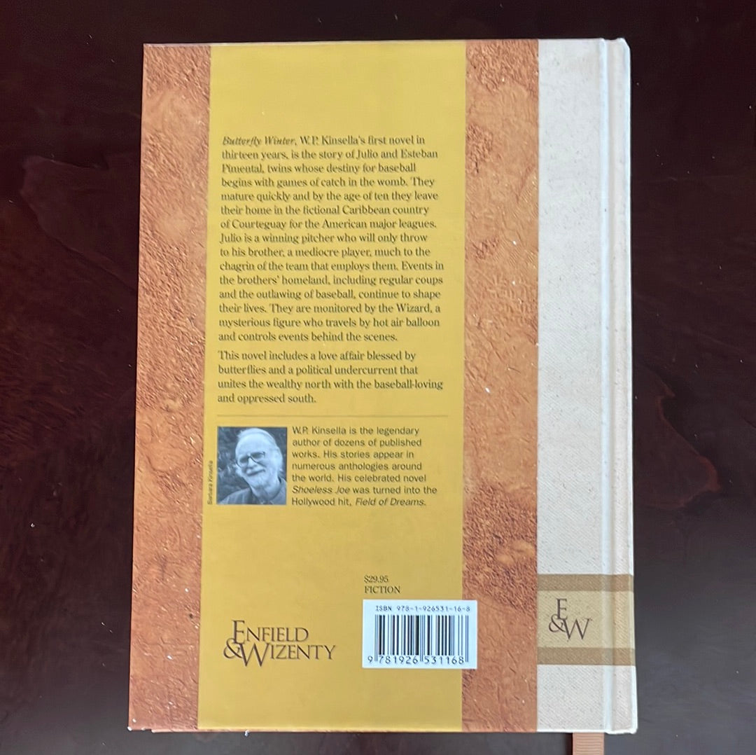 As New; first edition; brown sewn-in ribbon bookmark; W.P. Kinsella's first novel in 13 years, is the story of Julio and Esteban Pimental, twins whose destiny for baseball begins with games of catch in the womb. They mature quickly end by the age of ten they leave their home in the fictional Caribbean country of Courteguay for the American major leagues. Julio is a winning pitcher who will only throw to his brother, a mediocre player, much to the chagrin of the team that employs them. Events in the brothers' homeland, including regular coups and the outlawing of baseball, continue to shape their lives. They are monitored by the Wizard, a mysterious figure who travels by hot air balloon and controls events behind the scenes. This novel includes a love affair blessed by butterflies and a political undercurrent that unites the wealthy north with the baseball-loving and oppressed south.