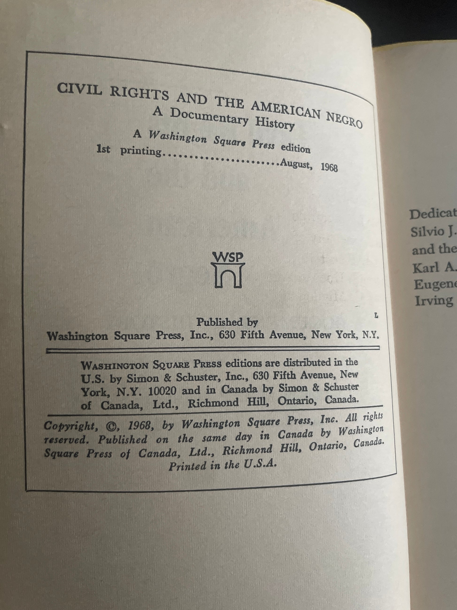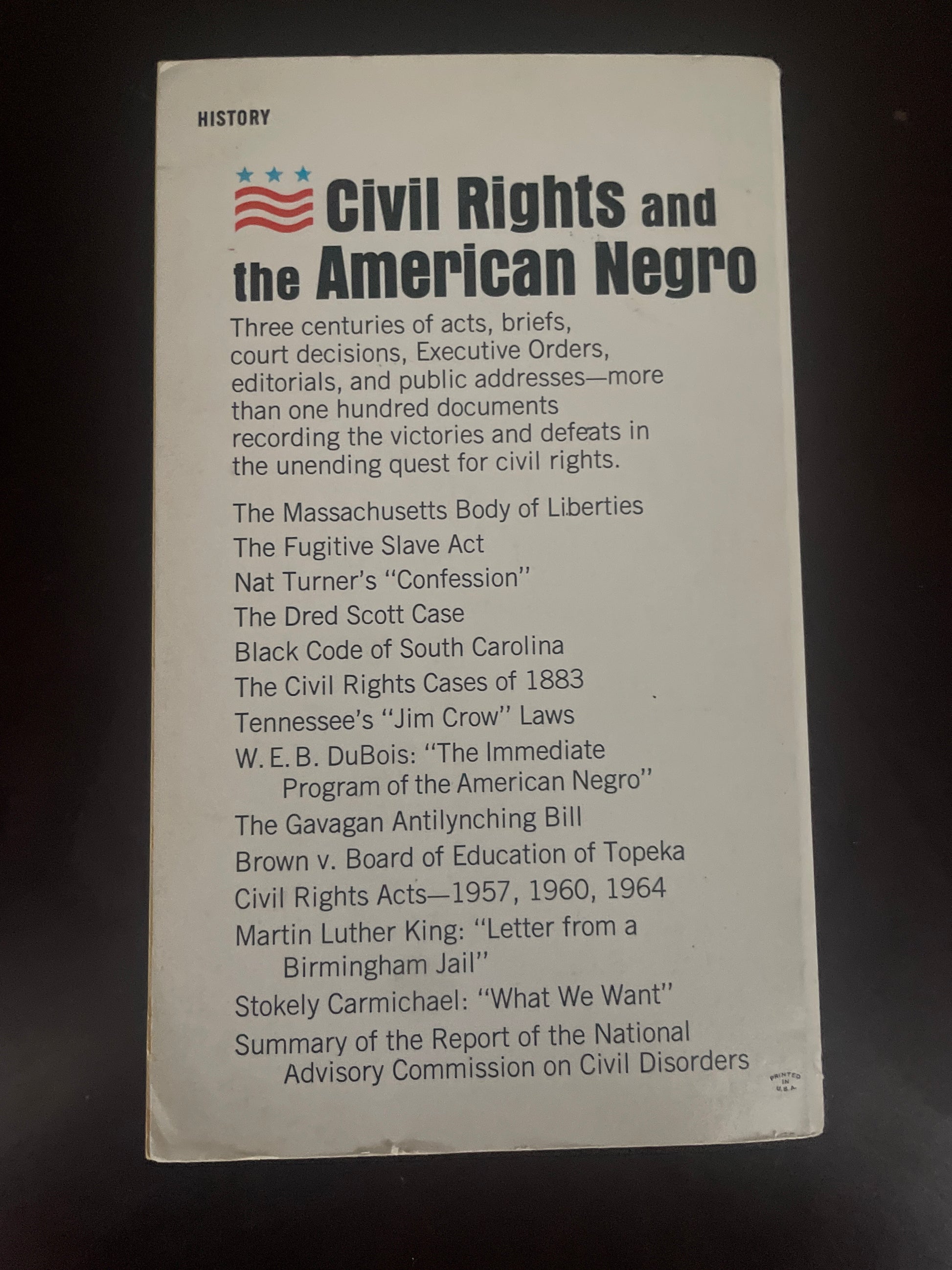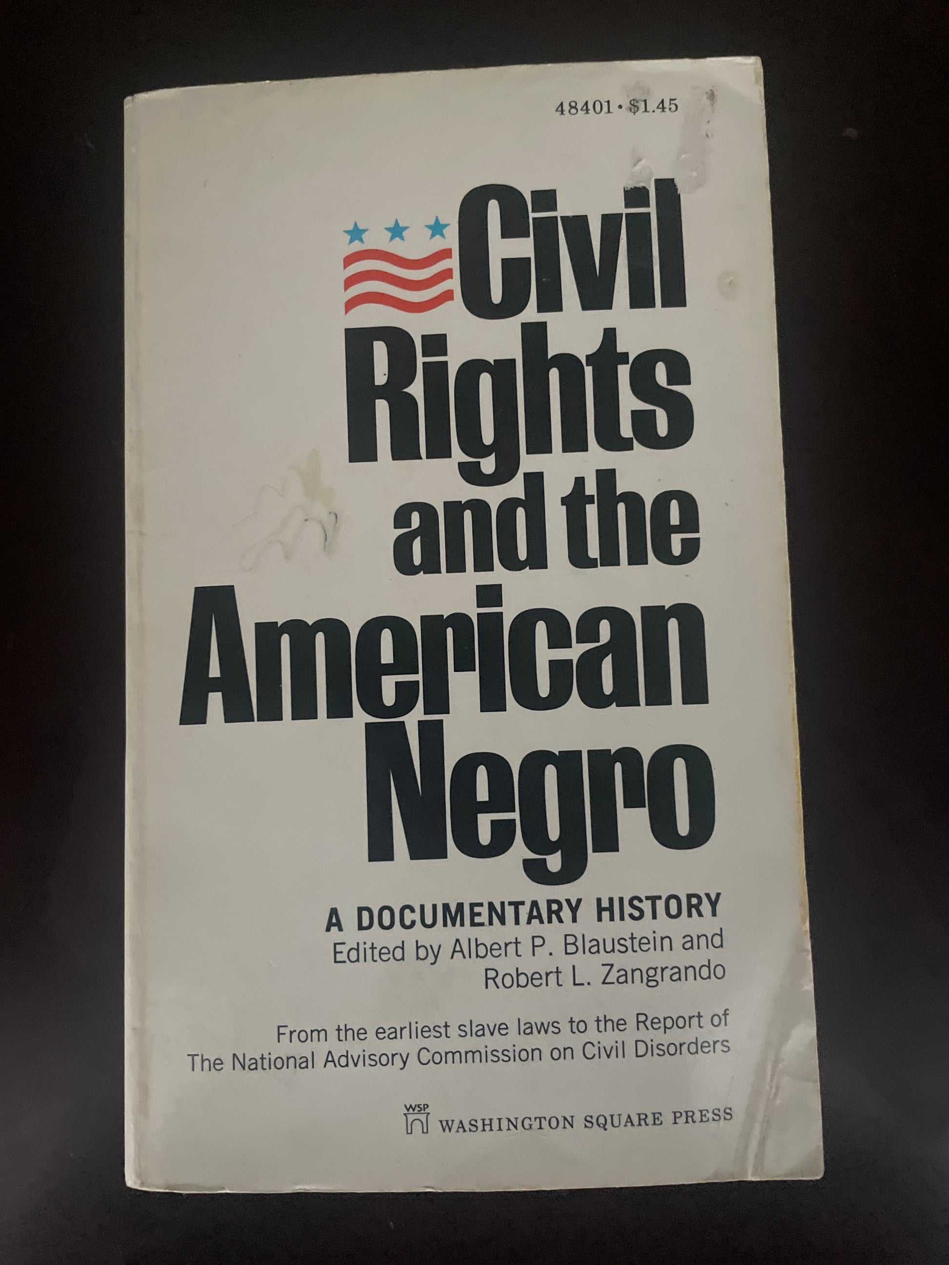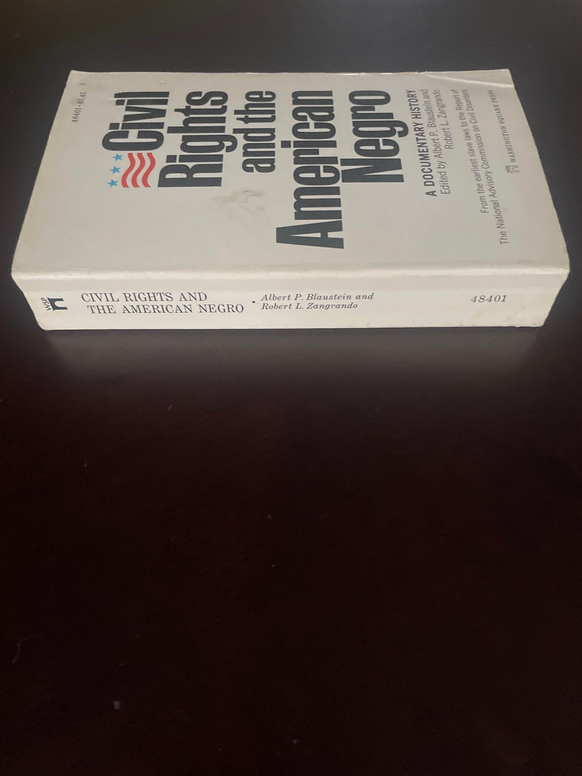 Clean, tight, unmarked; single light crease to spine; initials and number on ffep; creasing to bottom front corner; small area of price sticker removal damage to upper front corner of cover; otherwise minimal wear; From the earliest slave laws to the Report of The National Advisory Commission on Civil Disorders. Three centuries of acts, briefs, court decisions, Executive Orders, editorials, and public addresses - more than one hundred documents recording the victories and defeats in the unending quest for civil rights.