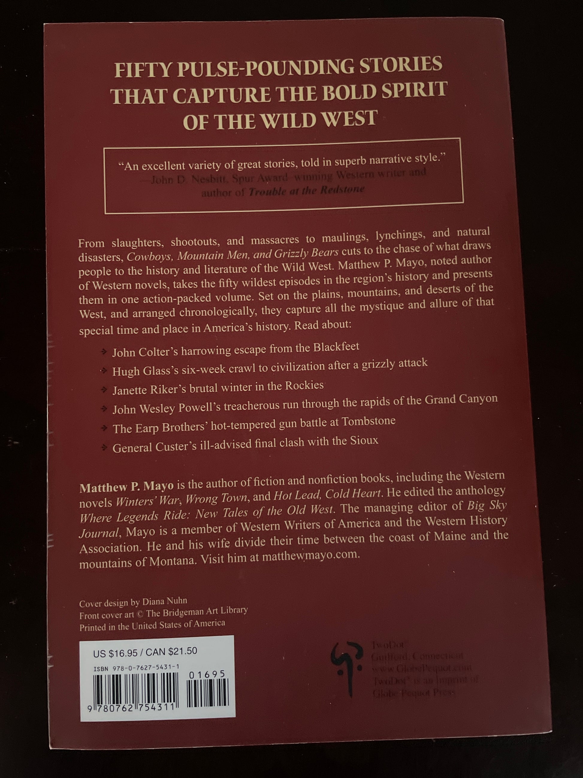 Clean, tight, unmarked; slight wear to inside corners; otherwise spine straight and uncreased; absolute minimal wear; appears unread; Fifty pulse-pounding stories that capture the bold spirit of the Wild West. Read about: John Colter's harrowing escape from the Blackfeet; Hugh Glass's six-week crawl to civilization after a grizzly attack; Janette Riker's brutal winter in the Rockies; John Wesley Powell's treacherous run through the rapids of the Grand Canyon; The Earp Brothers' hot-tempered gun battle at Tombstone; General Custer's ill-advised final clash with the Sioux ... and so much more.