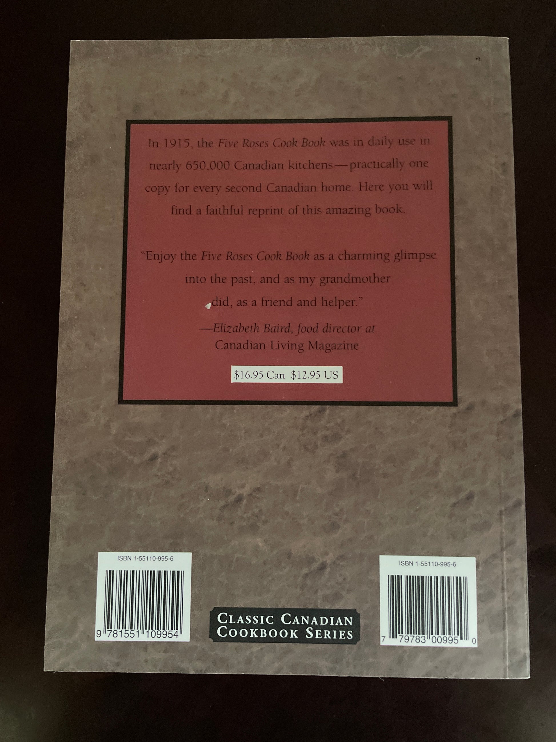 Clean, tight, unmarked; very minimal wear; appears unread; Being a manual of Good Recipes carefully chosen from the contributions of over two thousand successful users of Five Roses Flour throughout Canada." "In 1915, this cookbook was in daily use in nearly 650,000 Canadian kitchens - practically one for every second Canadian home. Here you will find a faithful reprint of this amazing book."