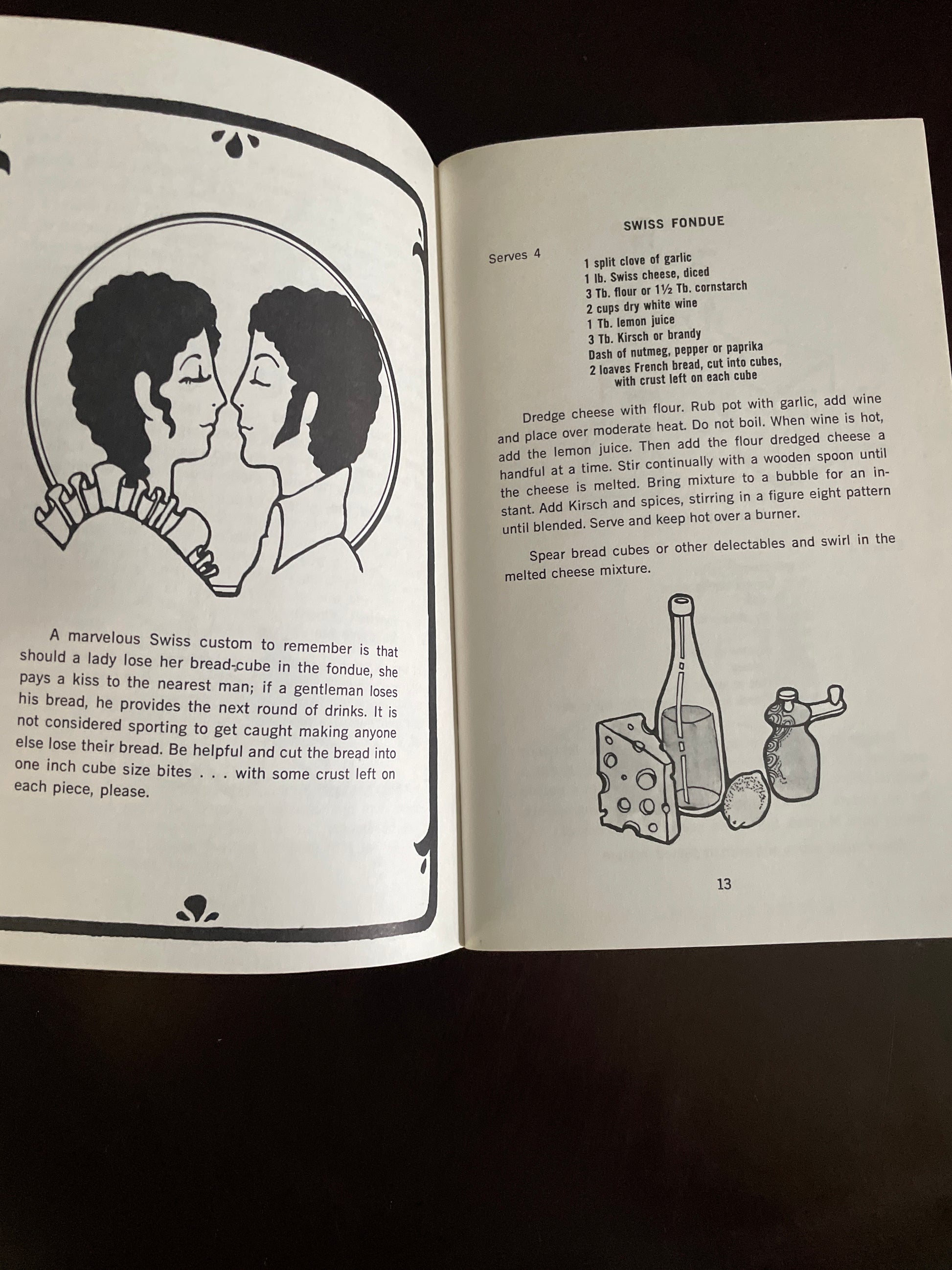 Clean, tight, unmarked; a couple of small areas of rubbing to covers; colours on covers very bright; very minimal wear; Vintage book written during the "fondue" craze in the 1970s. "Fondue cooking is perfect for today's relaxed way of living. It is easy, convenient and allows each guest to share in the creation of a delicious meal. Because nearly all preparation is made in advance, it is an ideal way to entertain. Two diners or a crowd can enjoy fonduing; and children and teenagers are wild about dunking and swirling as they smell the aroma of good things to devour." - from the Introduction