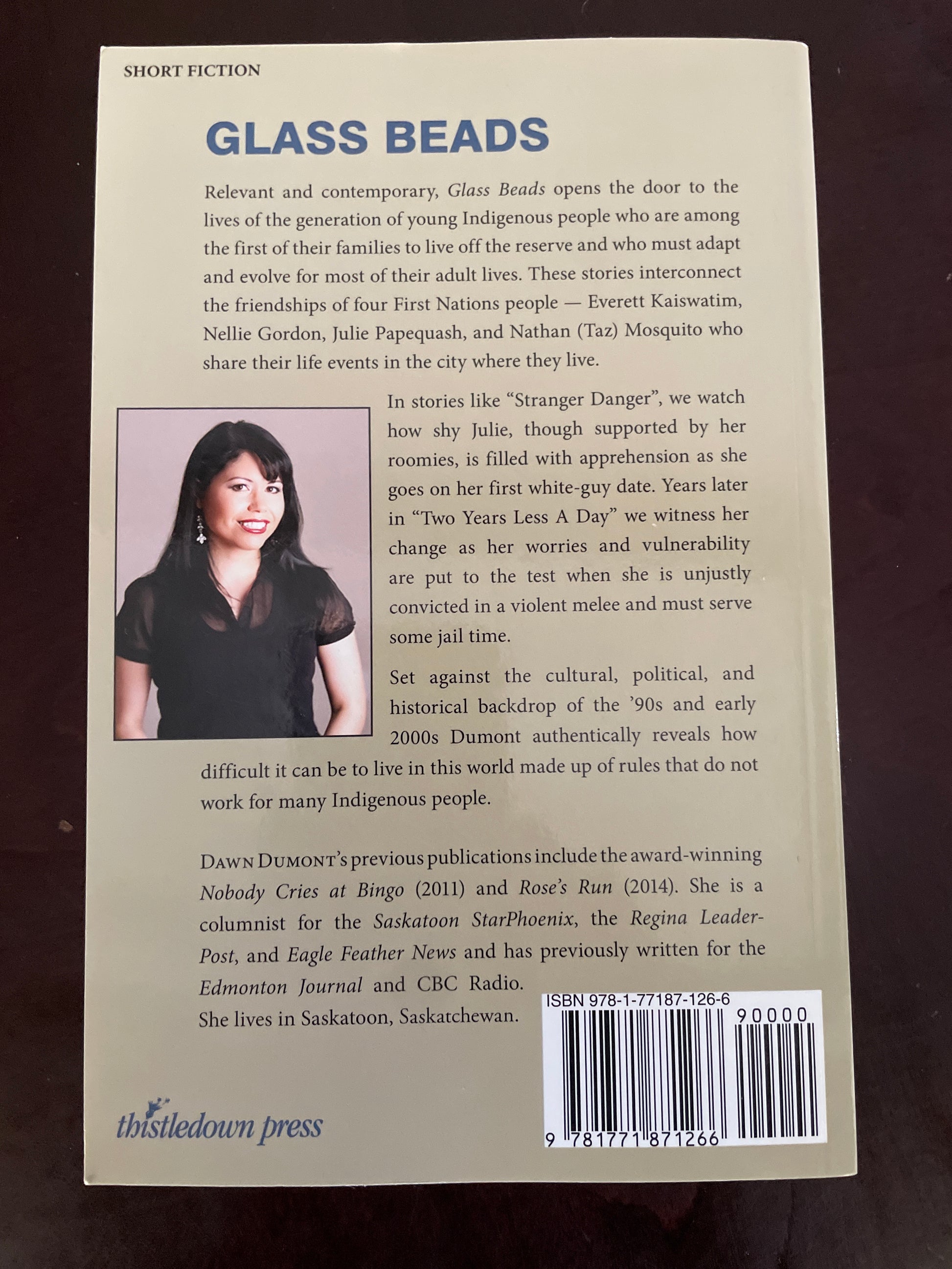 INSCRIPTION FROM DAWN DUMONT on title page; As new; Relevant and contemporary, Glass Beads opens the door to the lives of the generation of young Indigenous people who are among the first of their families to live off the reserve and who must adapt and evolve for most of their adult lives. These stories interconnect the friendships of four First Nations people who share their life events in the city where they live. Set against the cultural, political, and historical backdrop of the '90s and early 2000s. Dumont authentically reveals how difficult it can be to live this world made up of rules that do not work for many Indigenous people.