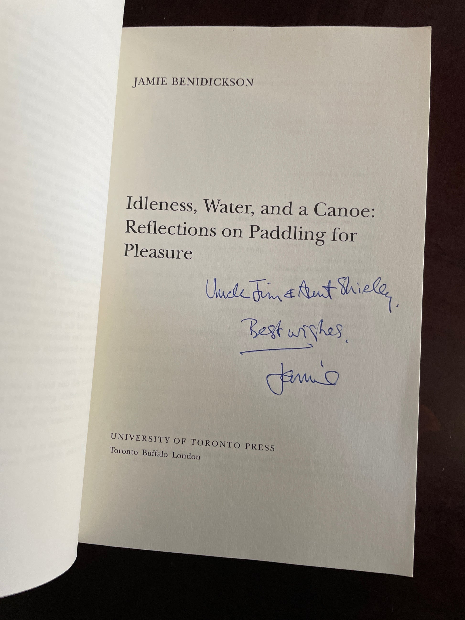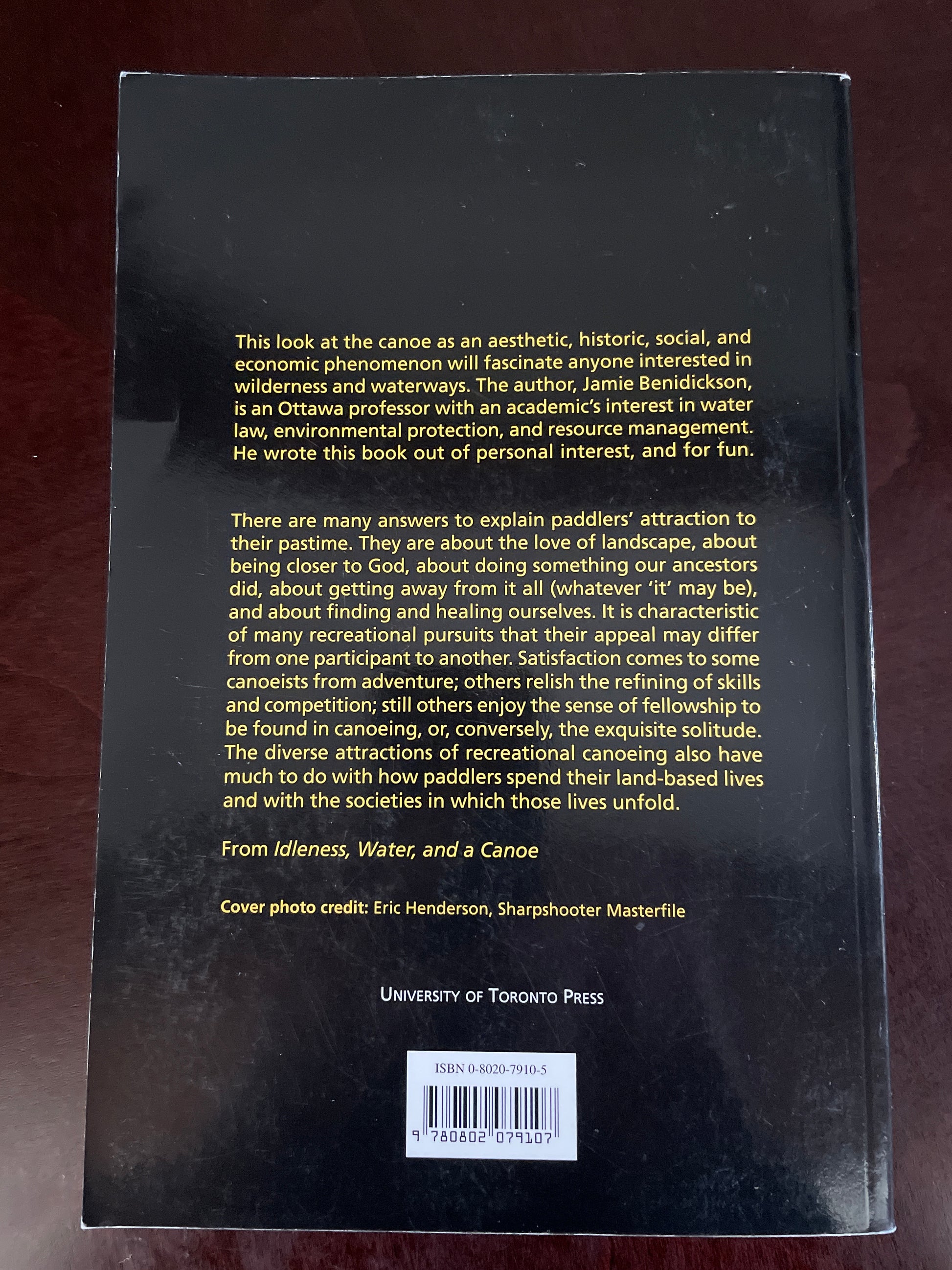 Clean, tight, unmarked; personal inscription from Jamie on title page; very light wear to back inside edge of cover; otherwise spine straight and uncreased; appears unread; This look at the canoe as an aesthetic, historic, social, and economic phenomenon will fascinate anyone interested in wilderness and waterways. The author, Jamie Benidickson, is an Ottawa professor with an academic's interest in water law, environmental protection, and resource management. He wrote this book out of personal interest, and for fun.