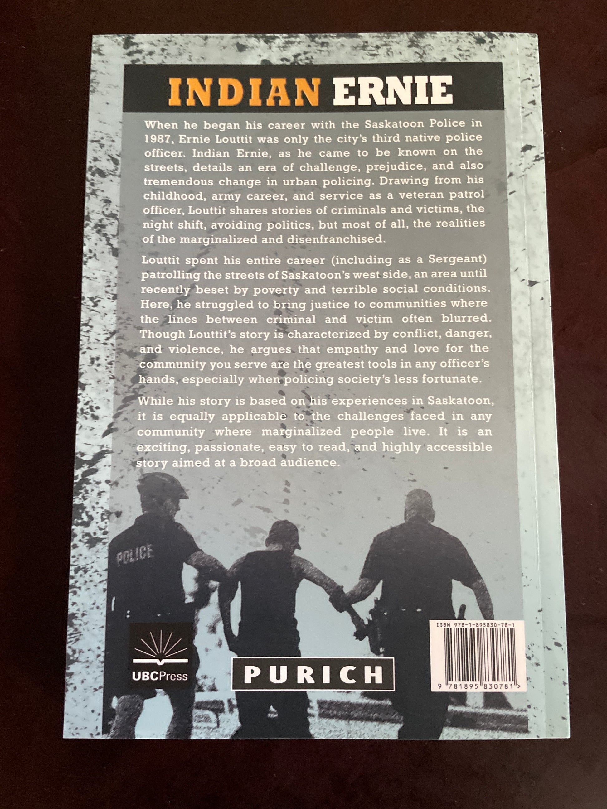 Clean, tight, unmarked; web address inside back cover; otherwise absolute minimal wear; appears unread; When he began his career with the Saskatoon Police in 1987, Ernie Louttit was only the city's third native police officer. Indian Ernie, as he came to be known on the streets, details an era of challenge, prejudice, and also tremendous change in urban policing. Drawing from his childhood, army career, and service as a veteran patrol officer, Louttit shares stories of criminals and victims, the night shift, avoiding politics, but most of all, the realities of the marginalized and disenfranchised. While his story is based on his experiences in Saskatoon, it is equally applicable to the challenges faced in any community where marginalized people live. It is an exciting, passionate, easy to read, and highly accessible story aimed at a broad audience.