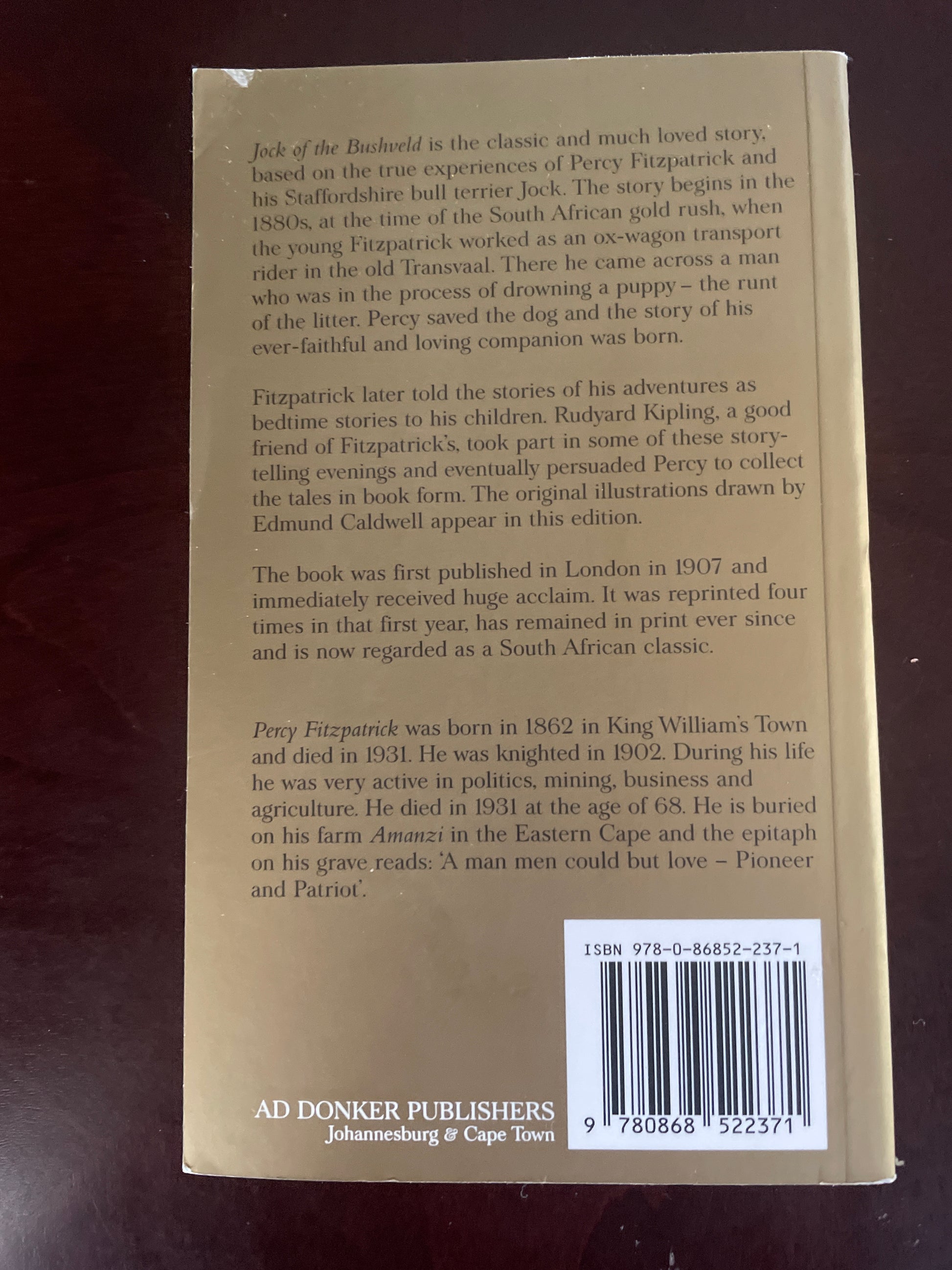 Clean, tight, unmarked; light wear to upper back inside corner; slight wear to lower spine extreme; otherwise very minimal wear; spine straight and uncreased; appears unread; The classic and much loved story, based on the true experiences of Percy Fitzpatrick and his Staffordshire bull terrier Jock. The story begins in the 1880s, at the time of the South African gold rush, when the young Fitzpatrick worked as an ox-wagon transport rider in the old Transvaal. There he came across a man who was in the process of drowning a puppy - the runt of the litter. Percy saved the dog and the story of his ever-faithful and loving companion was born. The original illustrations drawn by Edmund Caldwell appear in this edition.