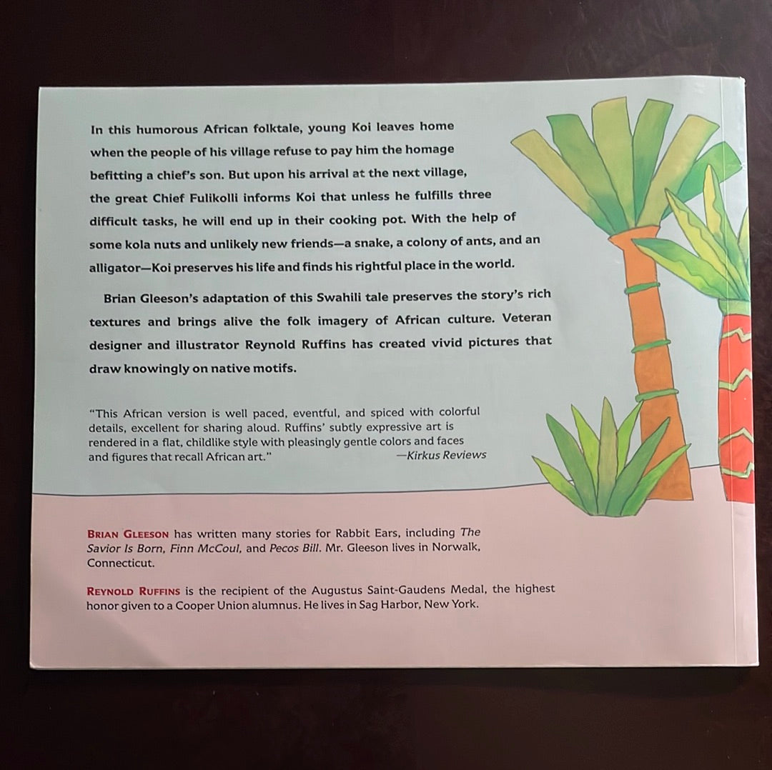 Clean, tight, unmarked; single light crease close to spine; very light wear to inner corners; otherwise very minimal wear; In this humorous African folktale, young Koi leaves home when the people of his village refuse to pay him the homage befitting a chief's son. But upon his arrival at the next village, the great Chief Fulikolli informs Koi that unless he fulfills three difficult tasks, he will end up in their cooking pot. With the help of some kola nuts and unlikely new friends - a snake, a colony of ants, and an alligator - Koi preserves his life and finds his rightful place in the world.