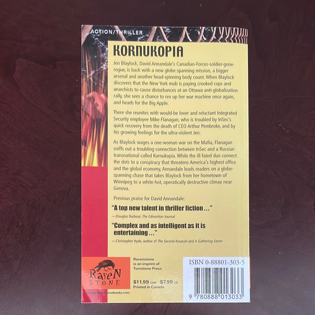 INSCRIPTION FROM DAVID ANNANDALE on title page; Clean, tight, unmarked; absolute minimal wear; appears unread; Jen Blaylock, Canadian-Forces-soldier-gone-rogue, is back with a new globe spanning mission, a bigger arsenal and another head-spinning body count. When Blaylock discovers that the New York mob is paying crooked cops and anarchists to cause disturbances at an Ottawa anti-globalization rally, she sees a chance to rev up her war machine once again, and heads for the Big Apple. There she reunites with would-be lover Mike Flanagan, who is troubled by InSec's quick recovery from the death of CEO Arthur Pembroke, and by his growing feelings for the ultra-violent Jen. As Blaylock wages a one-woman war on the Mafia, Flanagan sniffs out a troubling connection between InSec and a Russian transnational called Kornukopia. While the ill-fated duo connect the dots to a conspiracy that threatens America's highest office and the global economy, Annandale leads readers on a globe-spanning chase that takes Blaylock from her hometown of Winnipeg to white-hot, operatically destructive climax near Geneva.