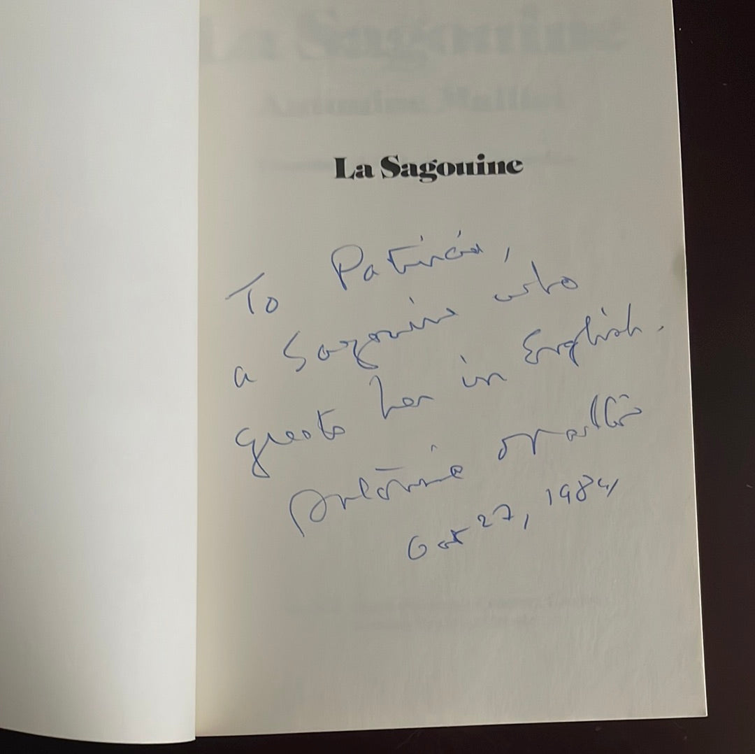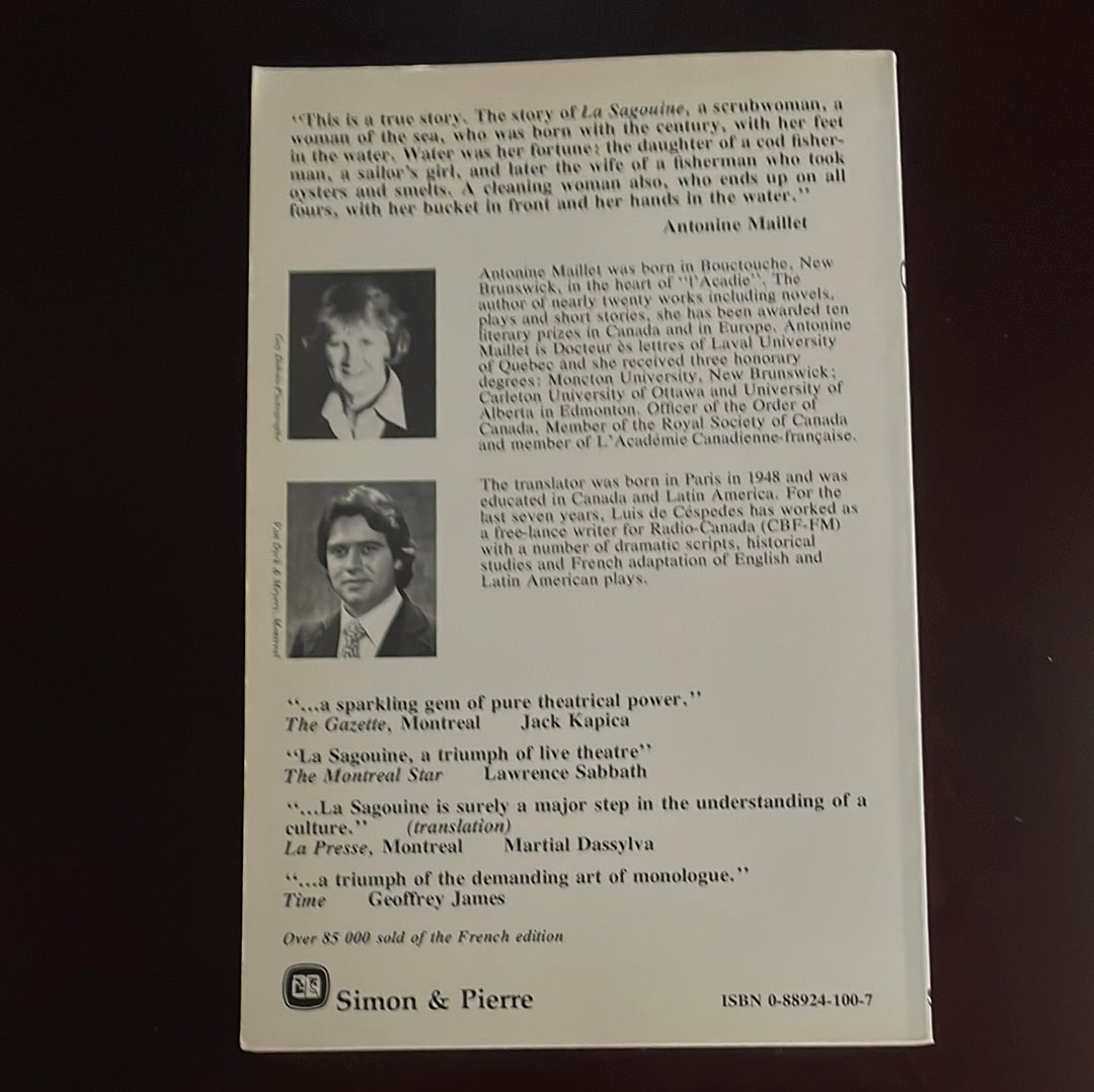 INSCRIBED BY ANTONINE MAILLET on ffep; Translation by Luis de Cespedes; Clean, tight, unmarked; very minimal wear; appears unread; "This is a true story. The story of La Sagouine, a scrubwoman, a woman of the sea, who was born with the century, with her feet in the water. Water was her fortune: the daughter of a cod fisherman, a sailor's girl, and later the wife of a fisherman who took oysters and smelts. A cleaning woman also, who ends up on all fours, with her bucket in front and her hands in the water." - Antonine Maillet