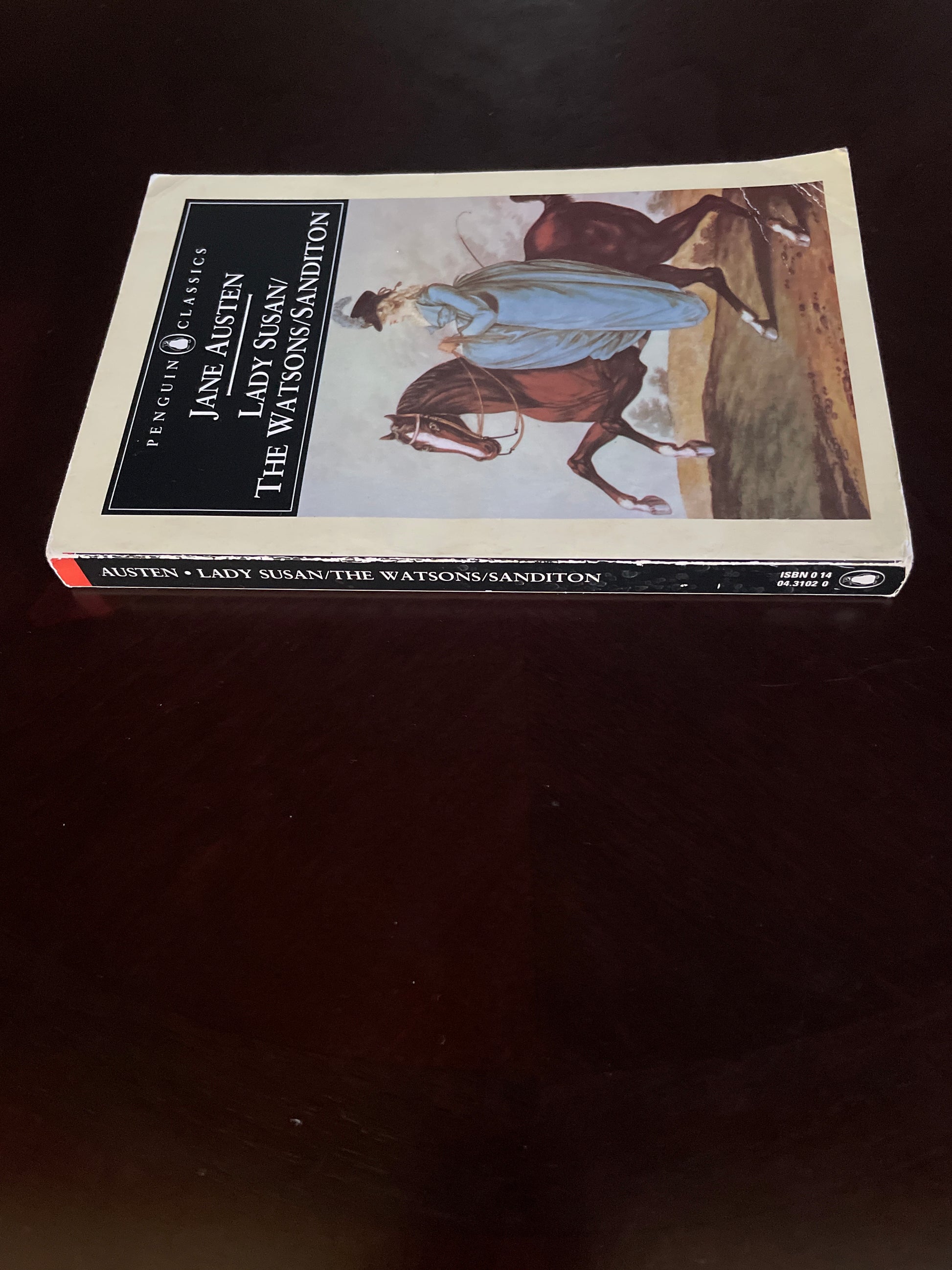Clean, tight, unmarked; some wear with creasing to inside front corners; previous owner's name on ffep; otherwise very minimal wear; Collected here are Jane Austen's three unfinished works: Sanditon; The Watsons; and Lady Susan. Sanditon is the story of the idyllic modern seaside town and its inhabitants. The Watsons is the story of Mr. Watson, a widowed clergyman, and his two sons and four daughters. Lady Susan, the complete of the three, is an epistolary novel; the story of its title character, a woman who engages in affairs and searches for suitable husbands for herself and her young daughter. Also included here is a short essay on the Plan of a Novel.
