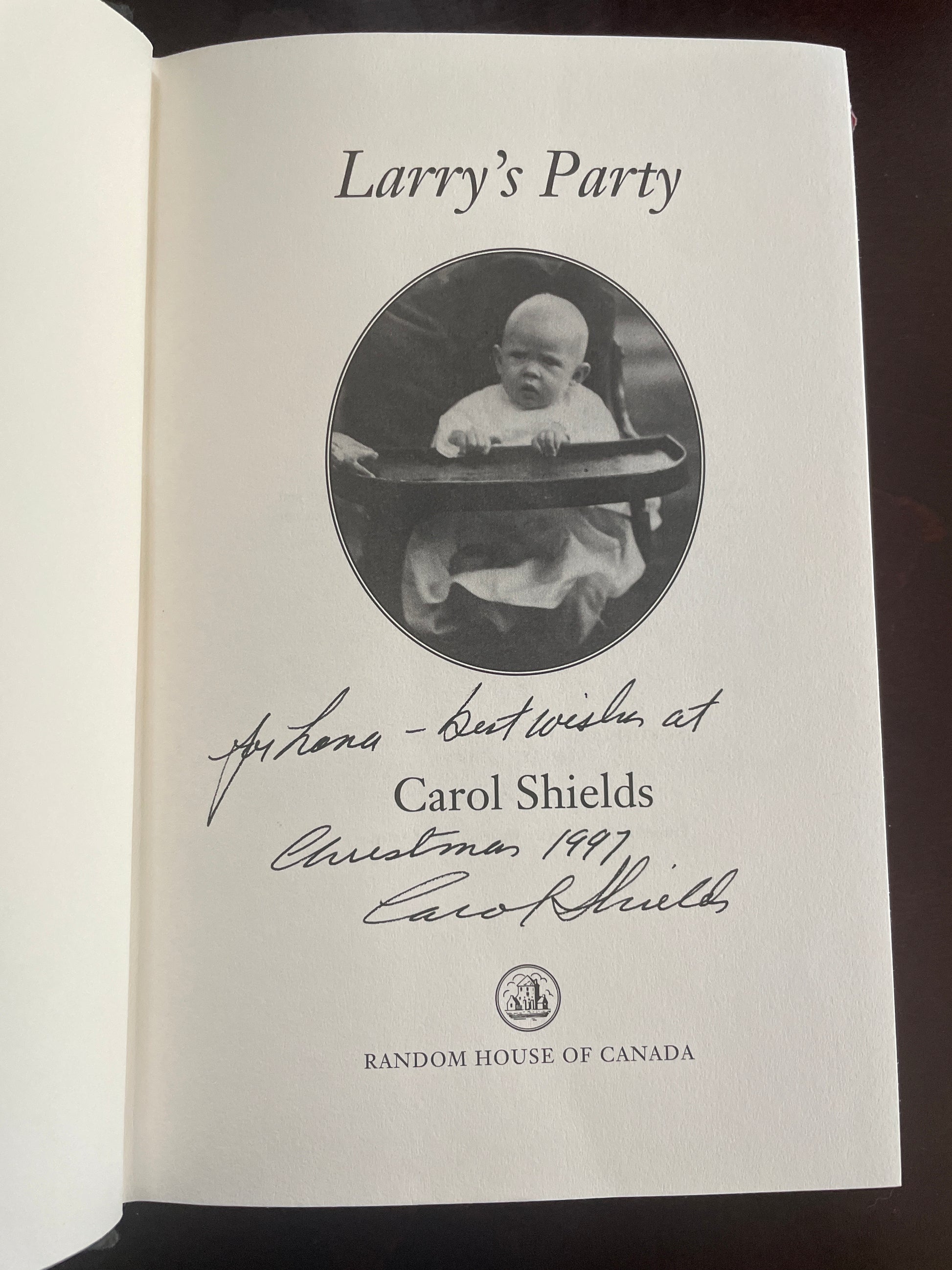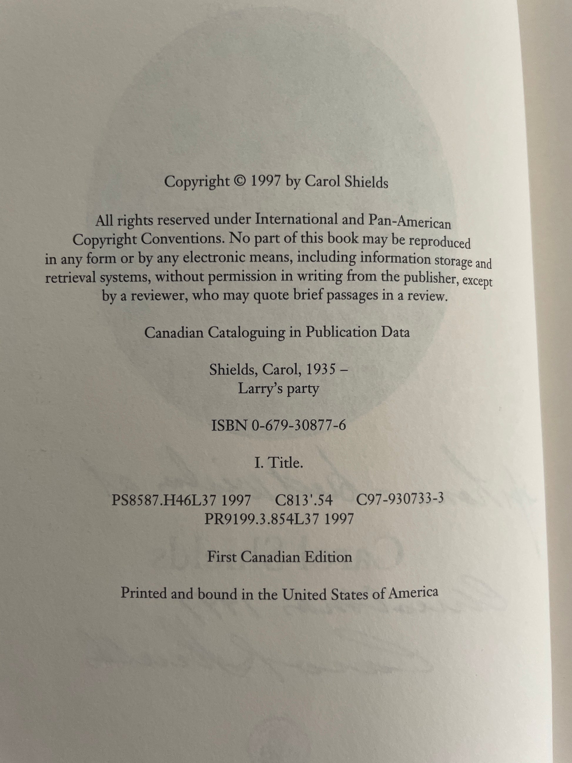 PERSONAL INSCRIPTION FROM CAROL SHIELDS on title page; Clean, tight, unmarked; absolute minimal wear; Shields deals in profound issues of human experience, drawing them from everyday existence with vulnerable honesty and a good dose of painkilling humor. Larry's odyssey mirrors the male condition at the end of our century with targeted wit; unerring poignancy and faultless wisdom.