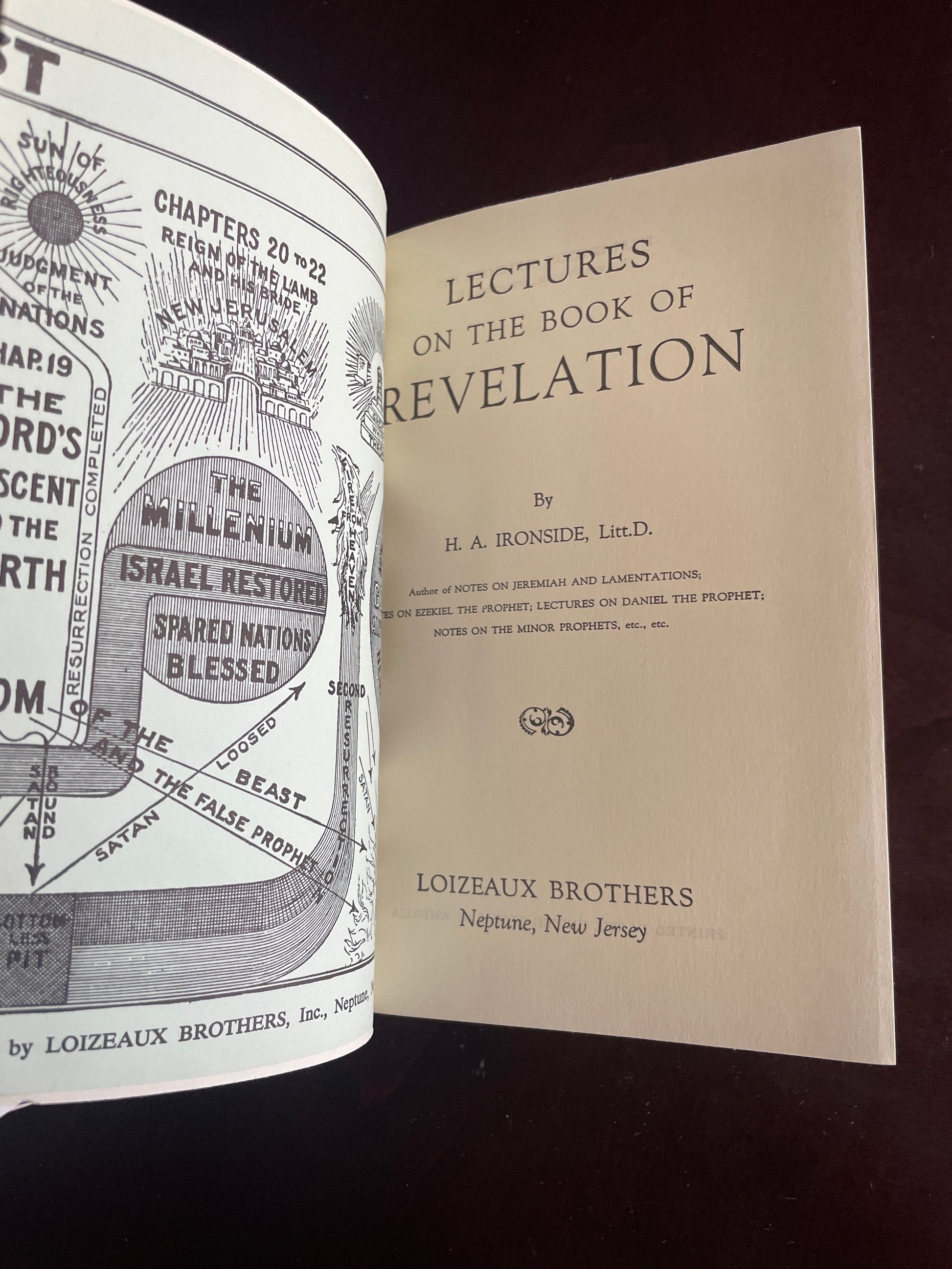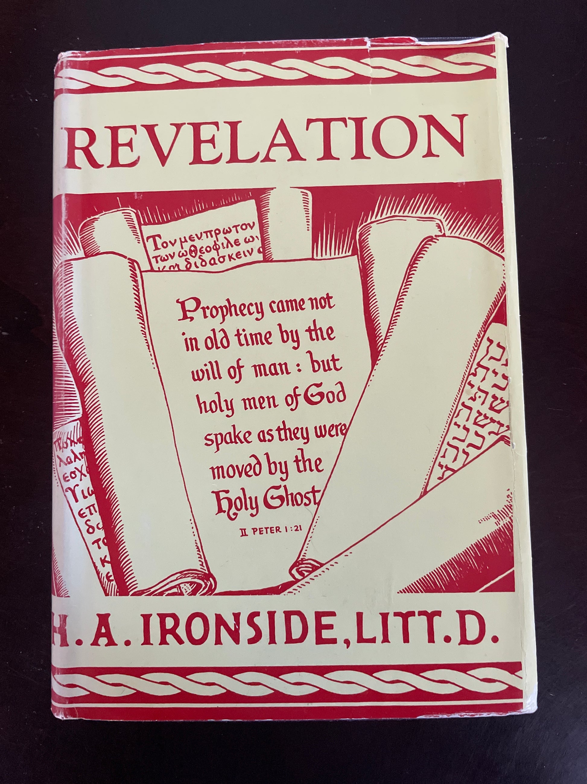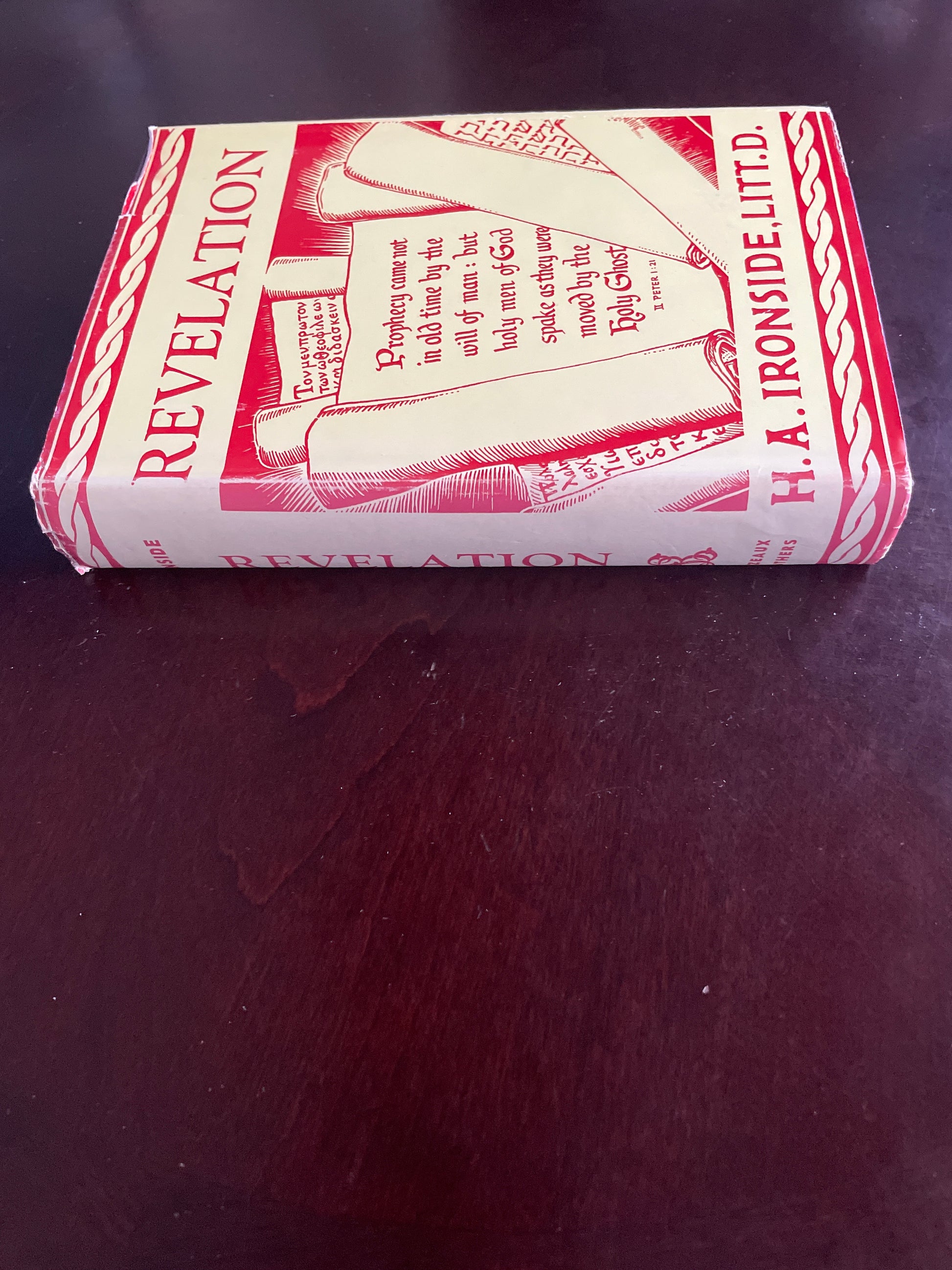 30th Printing; Clean, tight, unmarked; light wear with a few closed tears to upper edge of dust jacket; dj is bright red and yellow with slight fading to spine; burgundy cloth covers with gilt title to spine; otherwise minimal wear; "The Revelation of Jesus Christ is the only book of the Bible which begins and ends with God's blessing pronounced on those who read and keep its words. The author shows remarkable insight into the significance of the Apocalyptic symbols, all of which he has found explained or alluded to elsewhere in the Bible. A concise and orderly chart thoroughly diagrams the prophecies of this unique book. Ironside's exposition of Revelation will be found profitable for stimulating interest in prophetic study, awakening believers to the imminent return of the Lord, and arousing the unsaved to come to Christ before the door of the grace is closed.