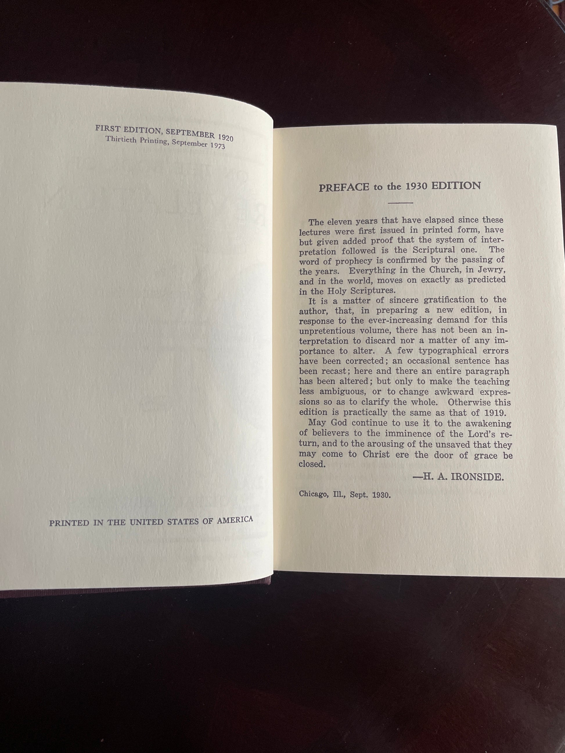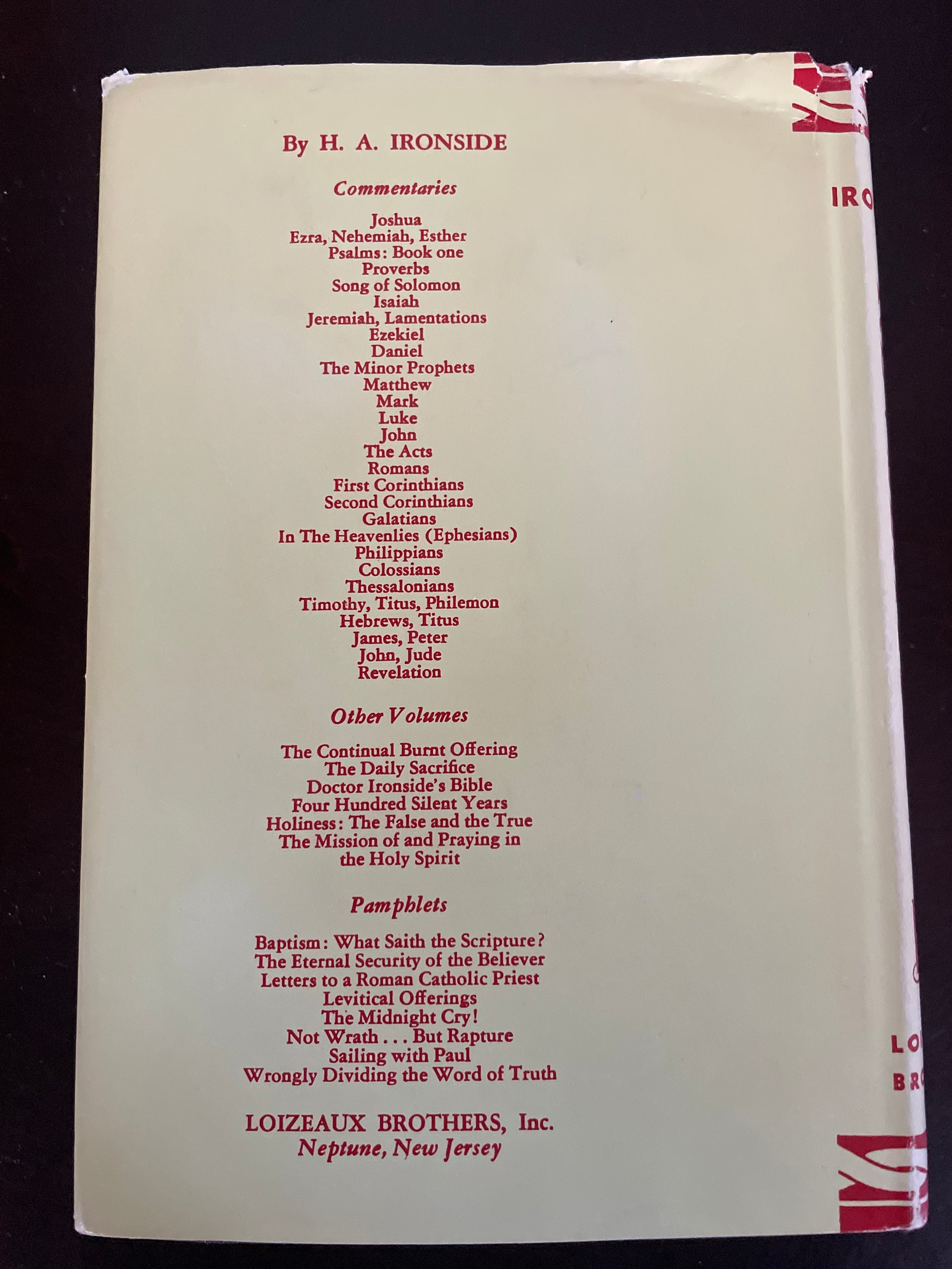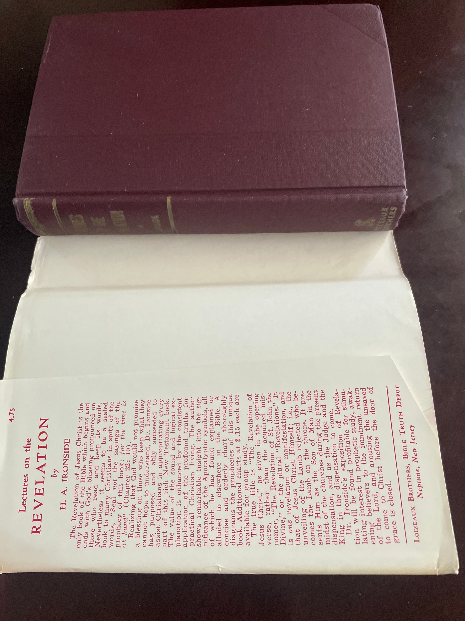 30th Printing; Clean, tight, unmarked; light wear with a few closed tears to upper edge of dust jacket; dj is bright red and yellow with slight fading to spine; burgundy cloth covers with gilt title to spine; otherwise minimal wear; "The Revelation of Jesus Christ is the only book of the Bible which begins and ends with God's blessing pronounced on those who read and keep its words. The author shows remarkable insight into the significance of the Apocalyptic symbols, all of which he has found explained or alluded to elsewhere in the Bible. A concise and orderly chart thoroughly diagrams the prophecies of this unique book. Ironside's exposition of Revelation will be found profitable for stimulating interest in prophetic study, awakening believers to the imminent return of the Lord, and arousing the unsaved to come to Christ before the door of the grace is closed.