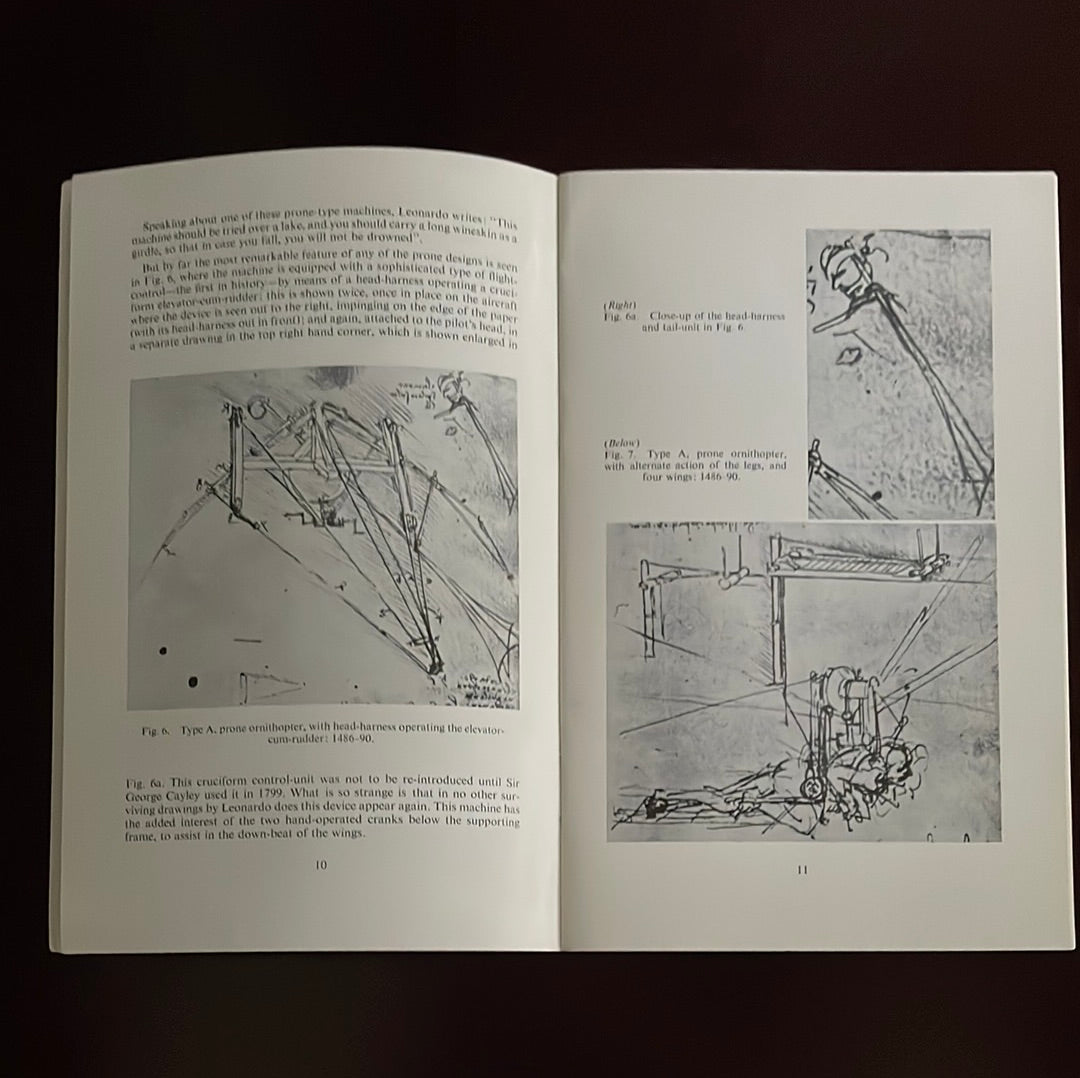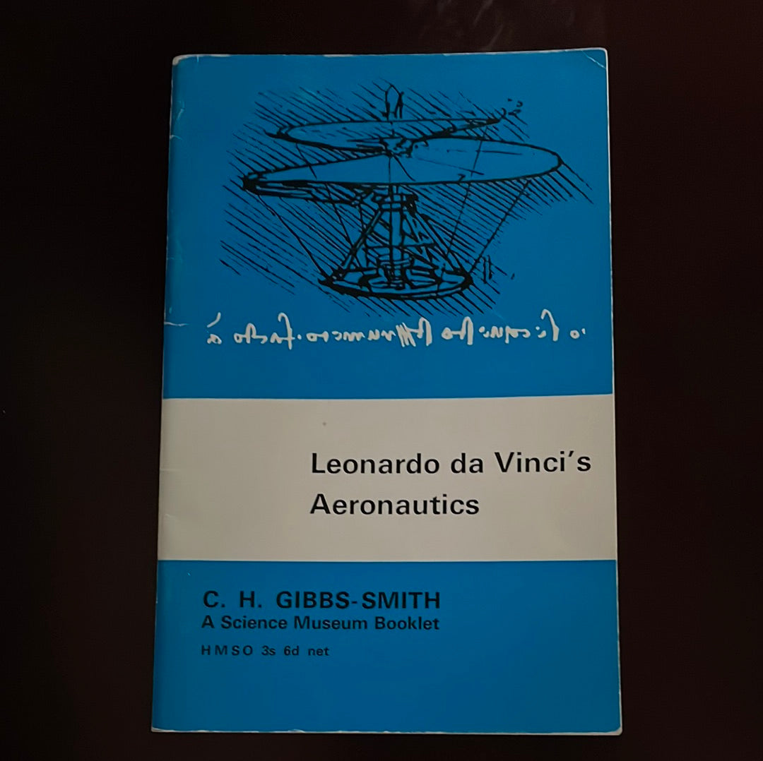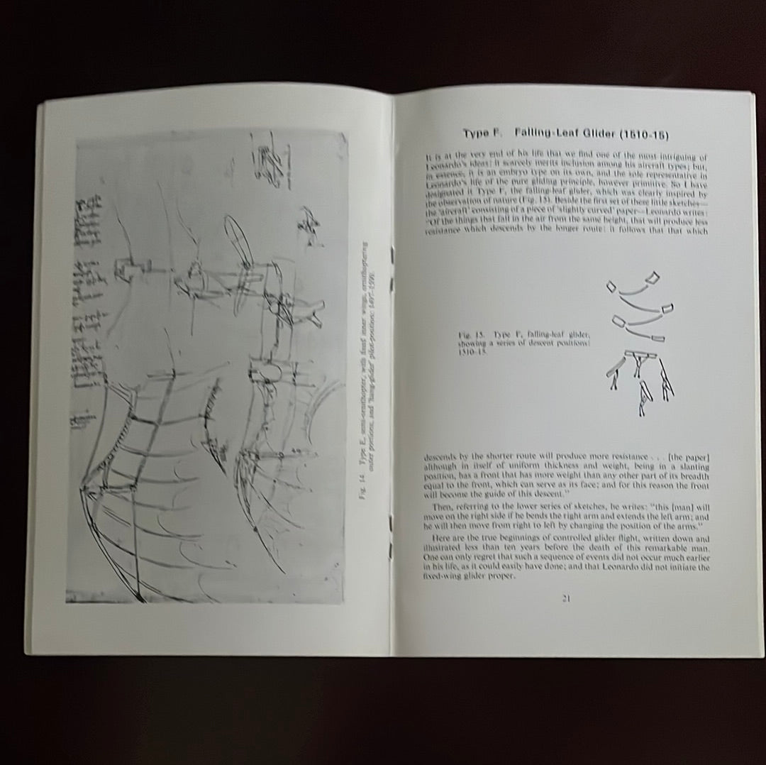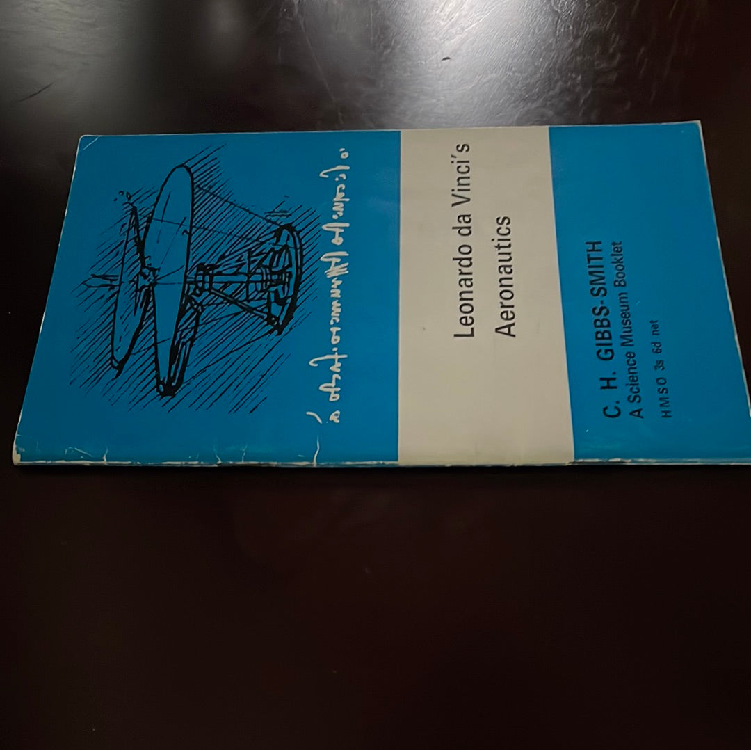 A Science Museum Booklet; 40 pp; Clean, tight, unmarked; some wear to edges; colours bright and unfaded; very minimal wear; Perhaps the greatest universal genius of history, Leonardo da Vinci provides an absorbing chapter in aeronautical history. He was the first man of high scientific attainments to investigate the problems of flight. Over the whole of the span of his aeronautical activities, Leonardo's aircraft may be divided into nine main types. The machines are dealt in this booklet in this order: Type A - prone ornithopter; Type B - Boat-shaped ornithopter; Type C - Standing ornithopter; Type D - Powered ornithopter; Type E - Semi-ornithopter; Type F - Falling-leaf glider. After Type F will come a brief discussion of Leonardo's flap-valve wings, wing construction, flight control, and wing testing rigs; then notes on his finned projectiles, parachute, helicopter, and inclinometer, followed by notes on his work on bird flight and other matters.