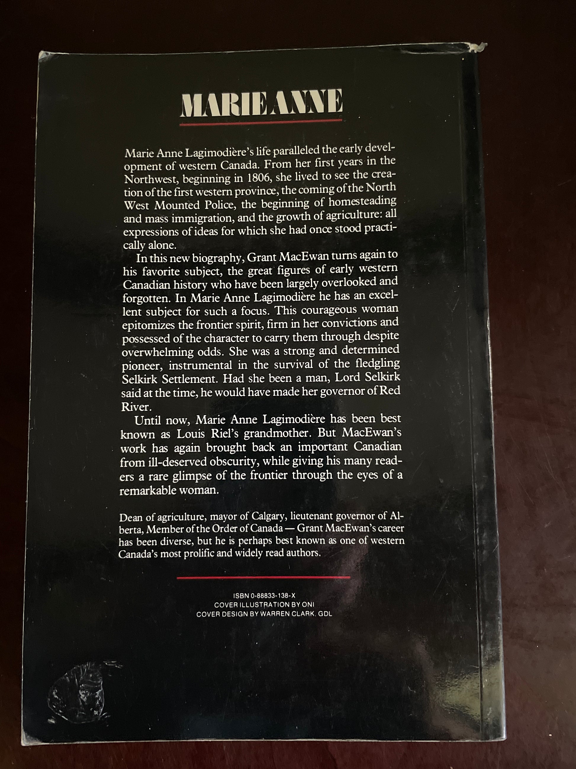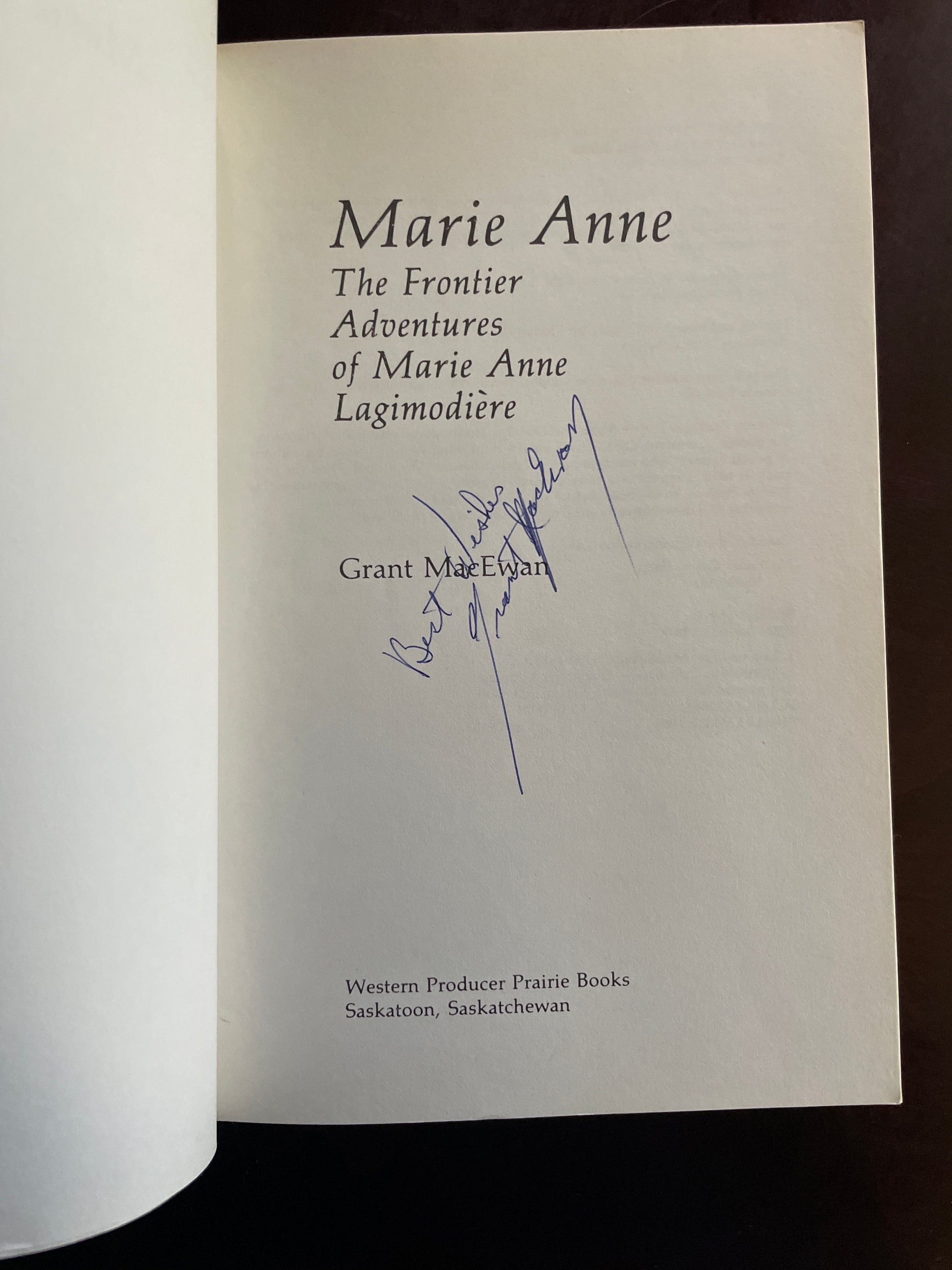 SIGNED BY GRANT MacEWAN on title page; Clean, tight, unmarked; light wear to corners; sticker removal damage to bottom back inside corner; otherwise minimal wear; Marie Anne Lagimodiere is best known as Louis Riel's grandmother. But MacEwan's work has again brought back an important Canadian from ill-deserved obscurity, while giving his many readers a rare glimpse of the frontier through the eyes of this remarkable woman.