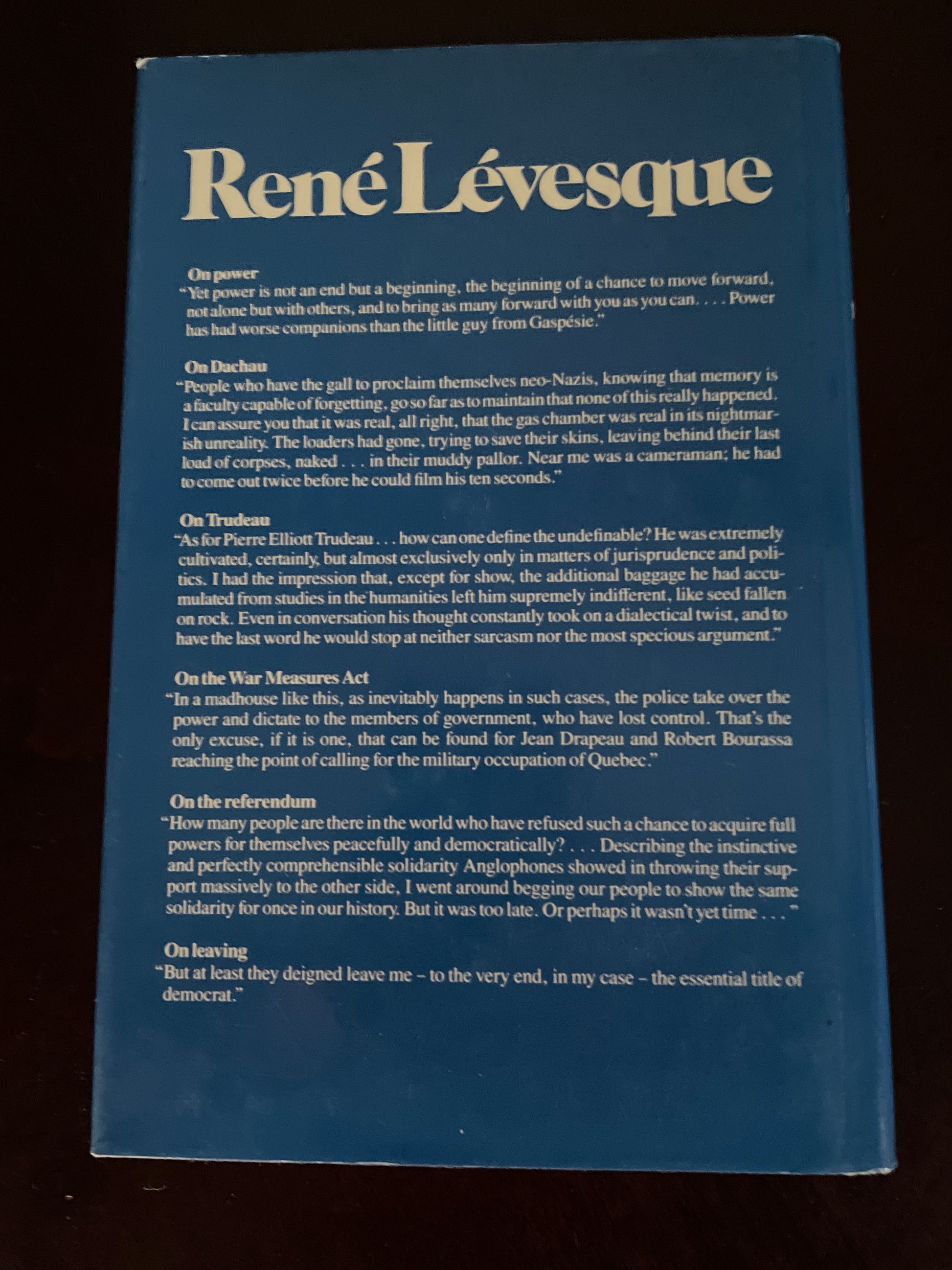 SIGNED BY RENE LEVESQUE on half-title page; Clean, tight, unmarked; price clipped; otherwise very minimal wear; No individual has had a greater impact on the historical evolution of Quebec, and Canada, than René Lévesque. In this book, the former Quebec Premier and founder and leader of the Parti Québécois describes in telling detail the behind-the-scenes experiences of his time of influence and power in the Lesage government of 1960-1966. This book is an important achievement, both for the insights it provides on Quebec, Canada, and world leaders, and for the insider's view it offers of the events that have shaped Canada. Lévesque tells his story with humour, humility, and honesty that make this the political memoir.
