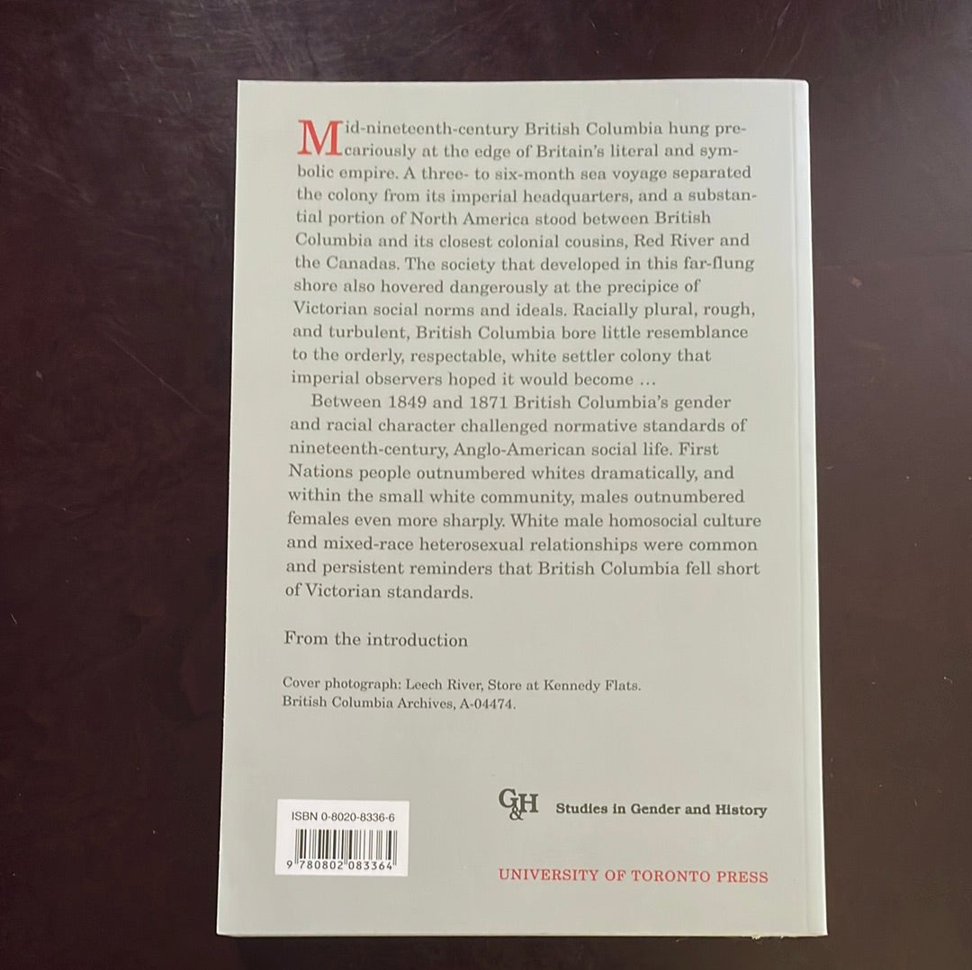 As New; Mid-19th century BC hung precariously at the edge of Britain's literal and symbolic empire. Between 1849 and 1871 BC's gender and racial character challenged normative standards of 19th century, Anglo-American social life. First Nations people outnumbered whites dramatically, and within the small white community, males outnumbered females even more sharply. White male homosocial culture and mixed-race heterosexual relationships were common and persistent reminder that British Columbia fell short of Victorian standards.