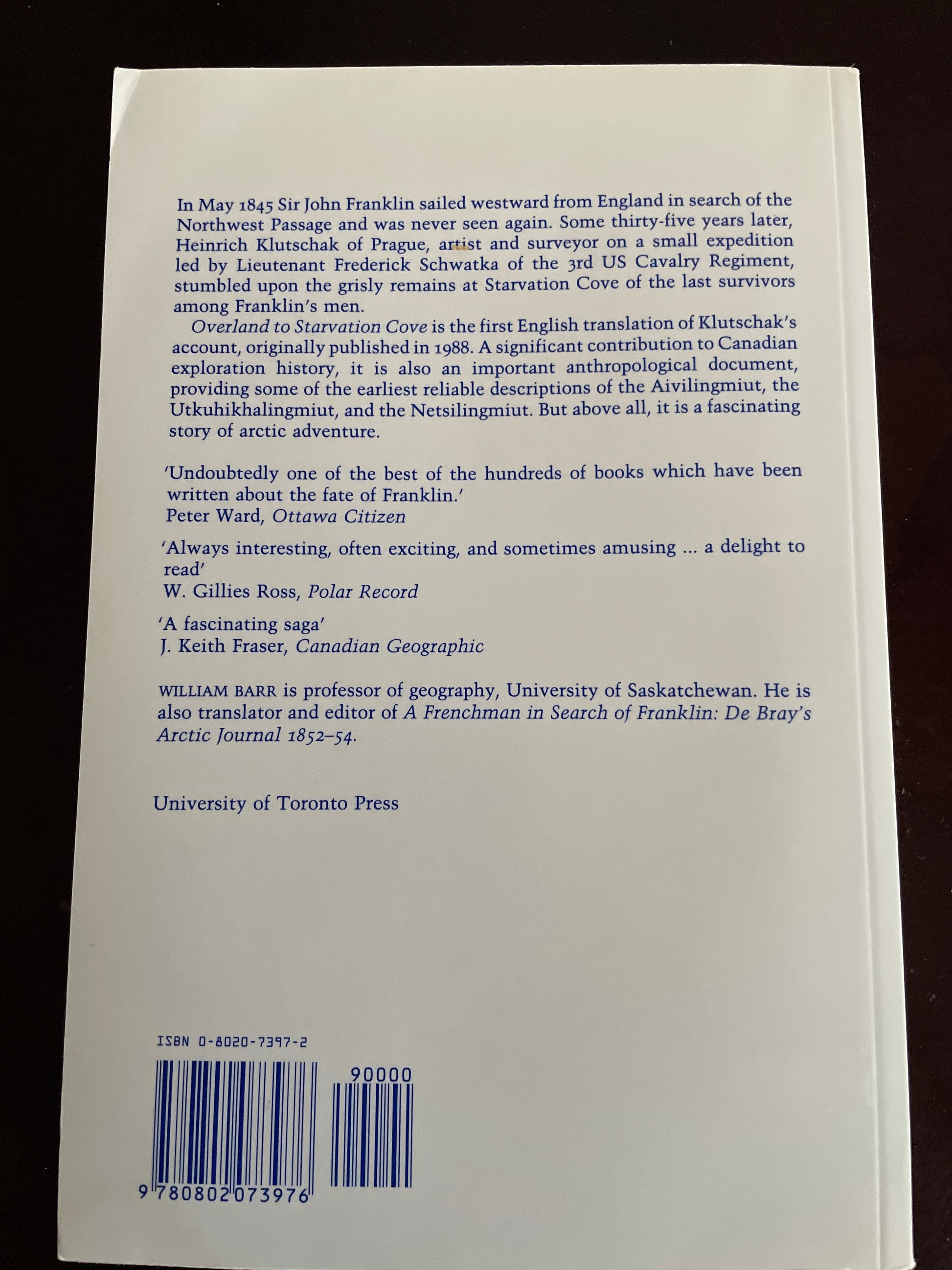 Clean, tight, unmarked; slight wear to upper inside back corner of cover; otherwise absolute minimal wear; appears unread; In May 1845 Sir John Franklin sailed westward from England in search of the Northwest Passage and was never seen again. Some 35 years later, Klutschak of Prague, artist and surveyor on a small expedition led by Schwatka, stumbled upon the grisly remains at Starvation Cove of the last survivors among Franklin's men. This is the first English translation of Klutschak's account, originally published in 1988. A significant contribution to Canadian exploration history, it is also an important anthropological document, providing some of the earliest reliable descriptions of the Aivilingmiut, the Utkuhikhalingmiut, and the Netsilingmiut. But above all, it is a fascinating story of Arctic adventure.