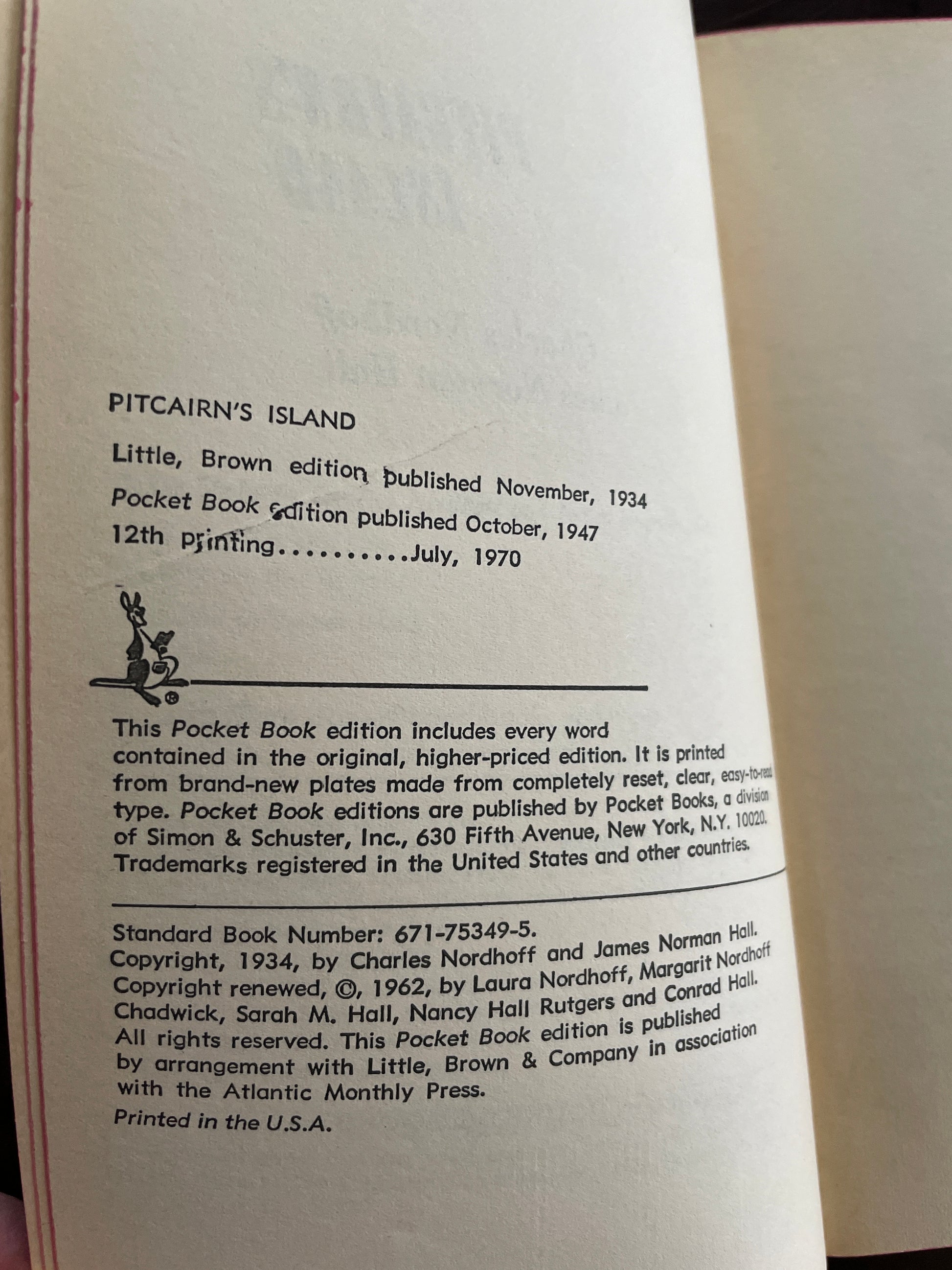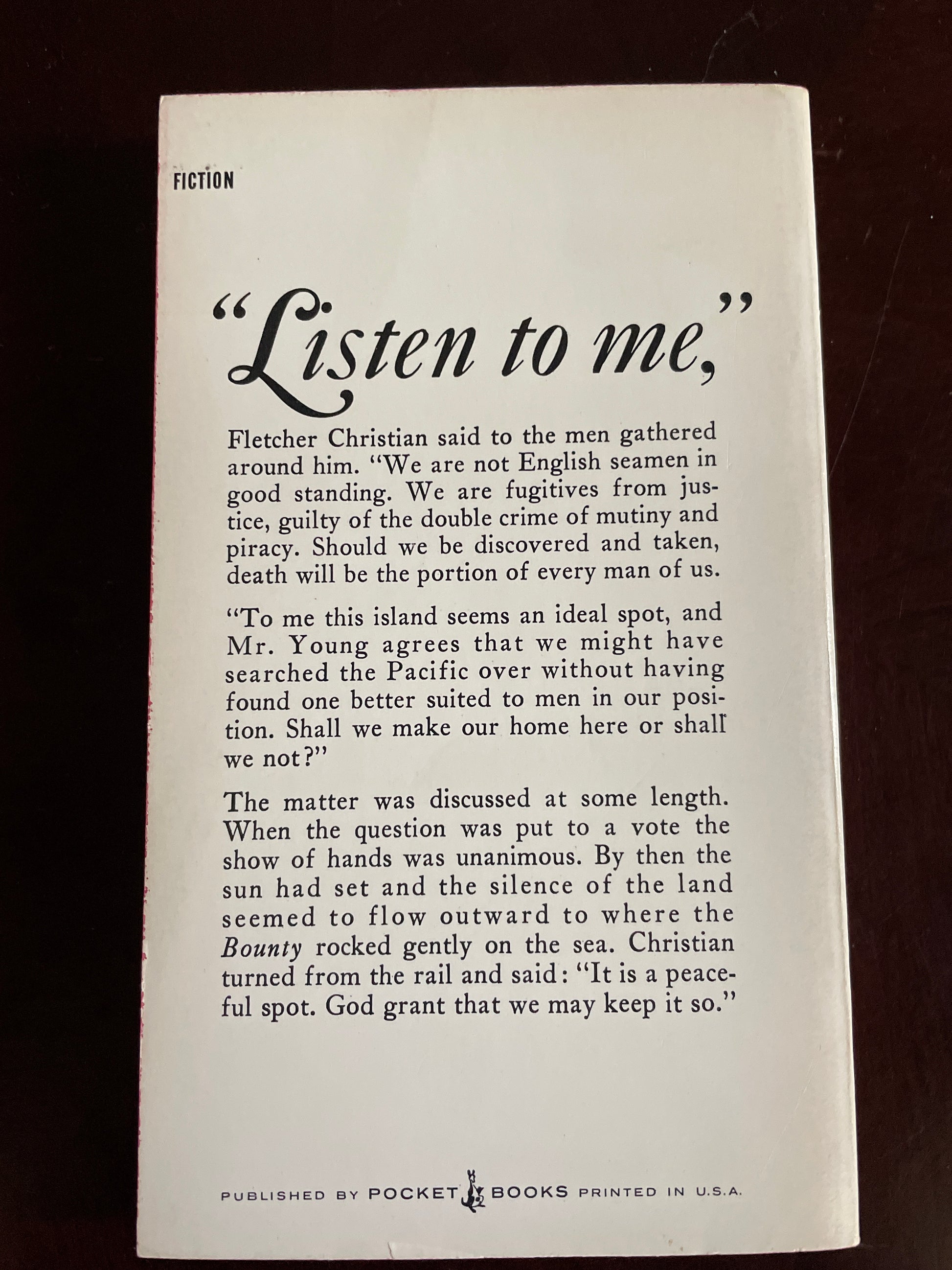 12th printing; Clean, tight, unmarked; very small nick to bottom back edge; single light crease to edge; otherwise very minimal wear; pink edges; cover shows a captain with a sword amongst Pacific Island Native peoples. "Listen to me," Fletcher Christian said to the men gathered around him. "we are not English seamen in good standing. We are fugitives from justice, guilty of the double crime of mutiny and piracy. Should we be discovered and taken, death will be the portion of every man of us. "To me this island seems an ideal spot, and Mr. Young agrees that we might have searched the Pacific over without having found one better suited to men in our position. Shall we make our home here or shall we not?" The matter was discussed at some length. When the question was put to a vote the show of hands was unanimous. By then the sun had set and the silence of the land seemed to flow outward to where the Bounty rocked gently on the sea. Christian turned from the rail and said: "It is a peaceful spot. God grant that we may keep it so."