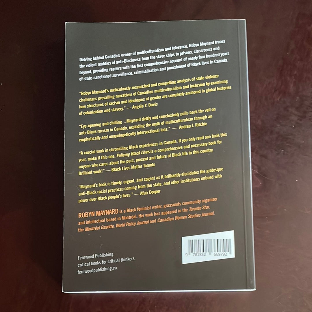 As New; Delving behind Canada's veneer of multiculturalism and tolerance. Robyn Maynard traces the violent realities of anti-Blackness from the slave ships to prisons, classrooms and beyond, providing readers with the first comprehensive account of nearly four hundred years of state-sanctioned surveillance, criminalization and punishment of Black lives in Canada. "Robyn Maynard's meticulously-researched and compelling analysis of state violence challenges prevailing narratives of Canadian multiculturalism and inclusion by examining how structures of racism and ideologies of gender are complexly anchored in global histories of colonization and slavery." - Angela Y. Davis