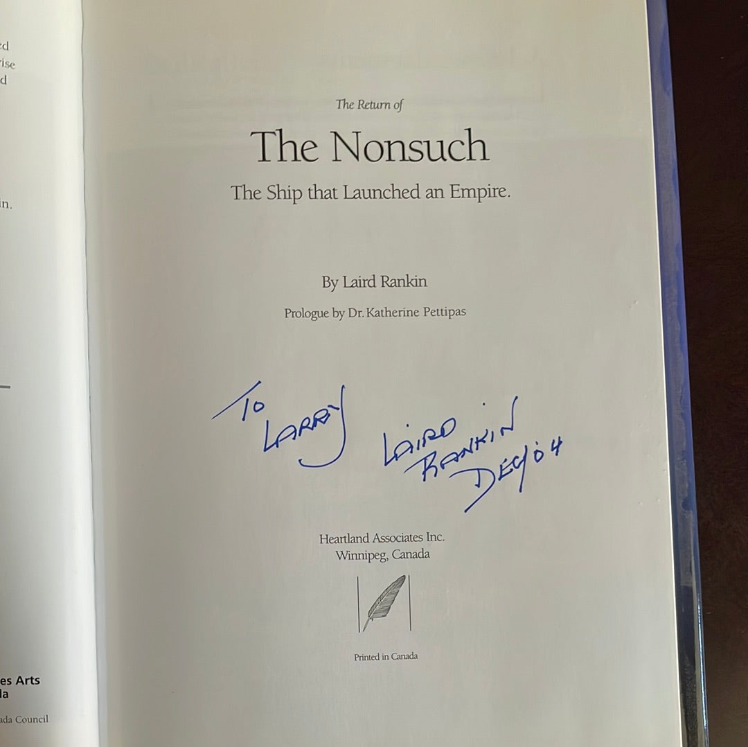 INSCRIBED BY LAIRD RANKIN on ffep; Clean, tight, unmarked; absolute minimal wear; appears unread; More than 330 years ago, a sturdy little ship, crewed by stalwart group of adventurers, sealed deep into Canada's heartland through Hudson Bay. The ship was the Nonsuch and the voyage inspired the Hudson's Bay Company and a fur trade empire. Thee hundred years later, a replica of the Nonsuch was created and sailed for four years in the waters of three nations. During that time, and in the years since, in her permanent home in the Manitoba Museum, she has illuminated the past for hundreds of thousands of people. This is her remarkable story.