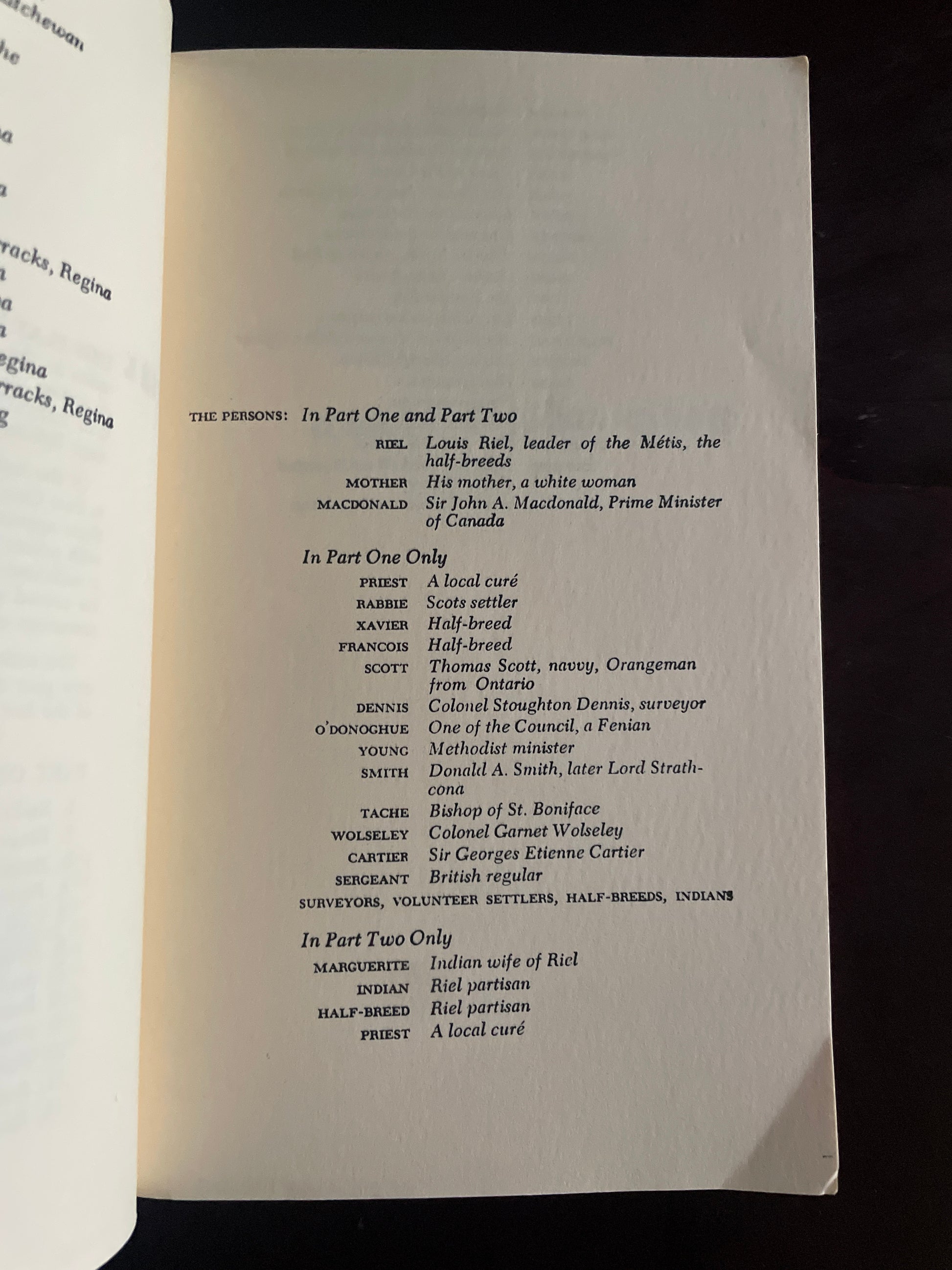 Clean, tight, unmarked; light wear to edges of covers; otherwise brights with very minimal wear; Riel is an ambitious epic drama in thirty scenes covering the significant events in Riels life from 1869 to 1870, the 1885 Metis rebellion, and Riels trial and execution in 1886.