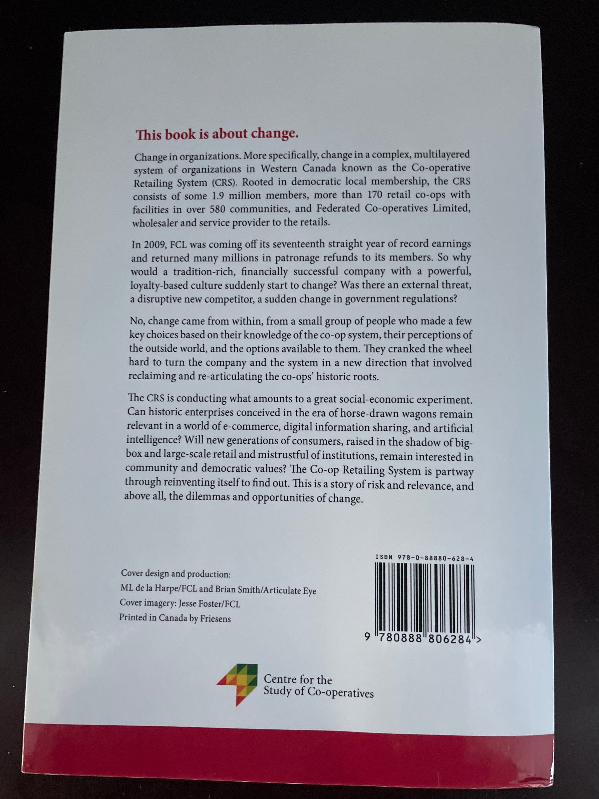 Clean, tight, unmarked; some handling to bottom edge near spine; otherwise spine straight and uncreased; very minimal wear; appears unread; This book is about change. Change in organizations. More specifically, change in a complex, multilayered system of organizations in Western Canada known as the Co-operative Retailing System (CRS). . Why would a tradition-rich, financially successful company suddenly start to change? The CRS is conducting what amounts to a great social-economic experiment. Will new generations of consumers, raised in the shadow of big-box and large-scale retail and mistrustful of institutions, remain interested in community and democratic values? The CRS is partway through reinventing itself to find out. This is a story of risk and relevance, and above all, the dilemmas and opportunities of change.