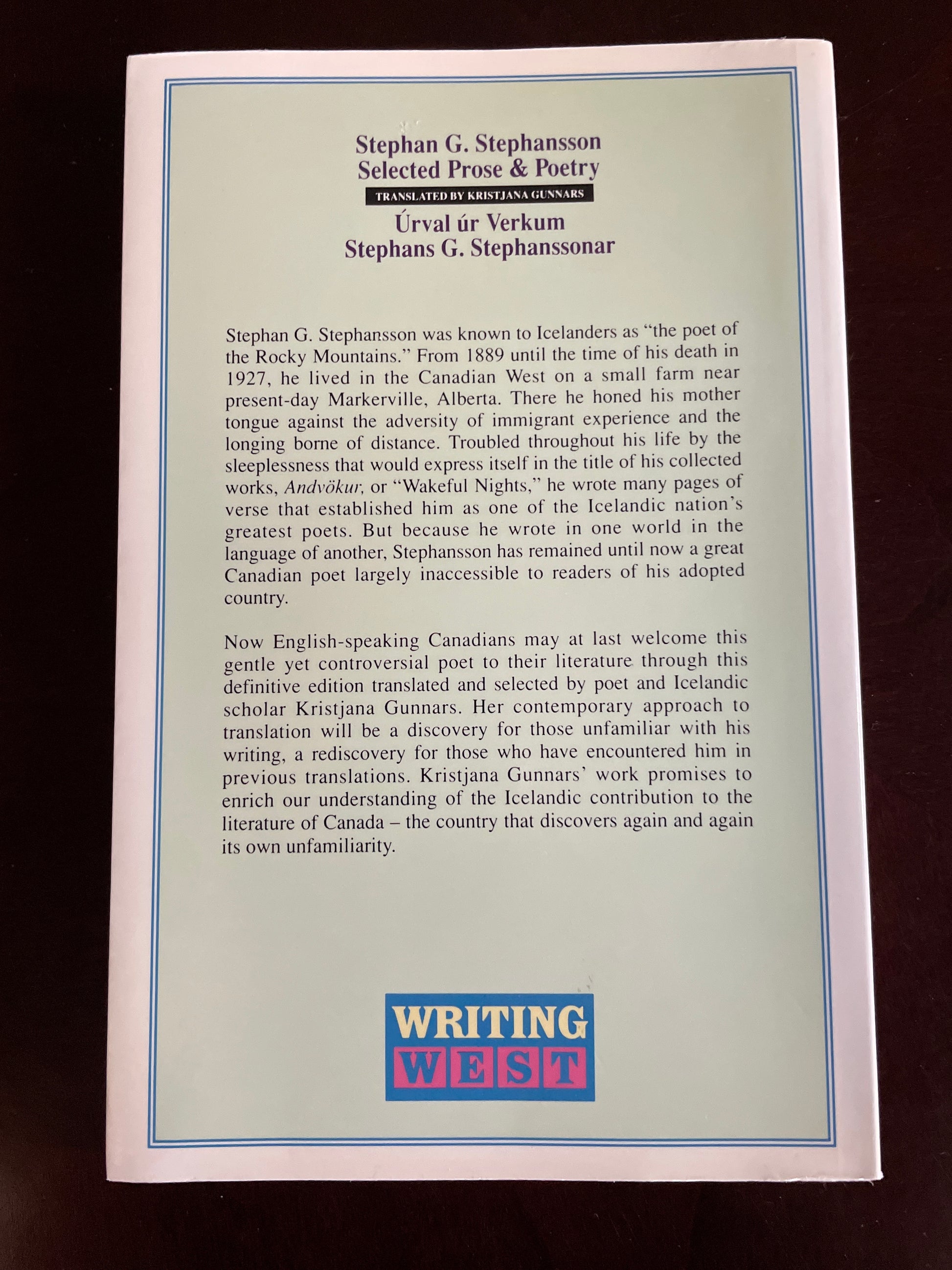 Written in English and Icelandic; Clean, tight, unmarked; light tanning to edges; otherwise very minimal wear; appears unread; Stephansson was known to Icelanders as "the poet of the Rocky Mountains." From 1889 until the time of his death in 1927, he lived in the Canadian West on a small farm near present-day Markerville, AB. There he honed his mother tongue against the adversity of immigrant experience and the longing borne of distance. Troubled throughout his life by the sleeplessness that would express itself in the title of his collected works, Andvokur, or "Wakeful Nights," he wrote many pages of verse that established him as one of the Icelandic nation's greatest poets.