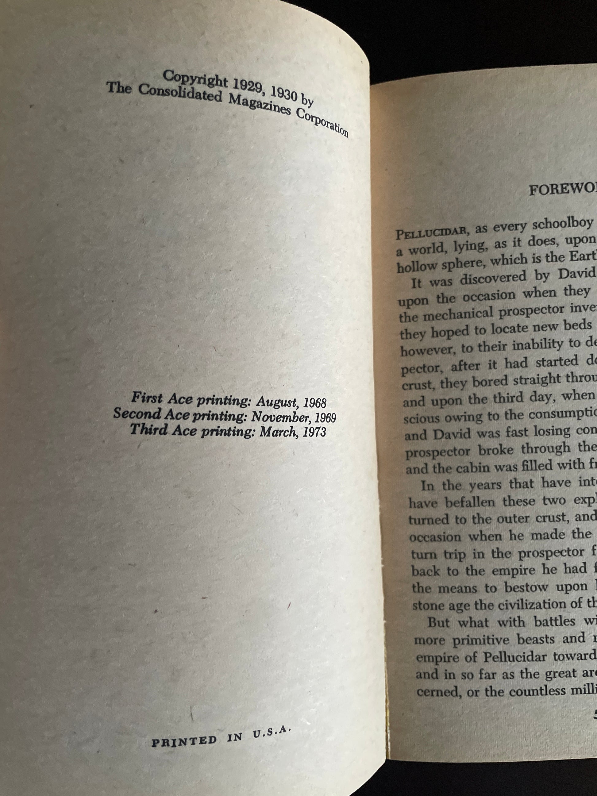 Clean, tight, unmarked; two light creases to spine; age tanned; otherwise very minimal wear; lightly read; An urgent message from Pellucidar, the mysterious land of eternal sunshine and primeval monsters at the Earth's core, called on Tarzan of the Apes for assistance - a mission that would tax the Ape Man to the utmost.