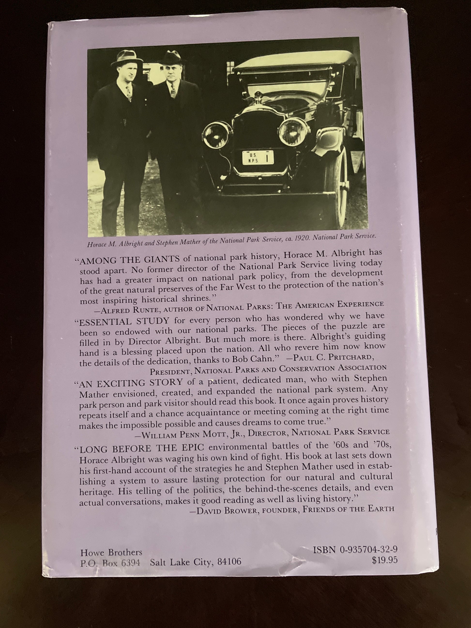 Clean, tight, unmarked; previous owner's stamp on ffep and half-title page; slight wear to lower back edge and inside corners of dust jacket; otherwise absolute minimal wear; appears unread; "Long before the epic environmental battles of the '60s and '70s, Horace Albright was waging his own kind of fight, His book sets down his first-hand account of the strategies he and Stephen Mather used in establishing a system to assure lasting protections for our natural and cultural heritage. His telling of the politics, the behind-the-scenes details, and even actual conversations, makes it good reading as well as living history." - David Brower