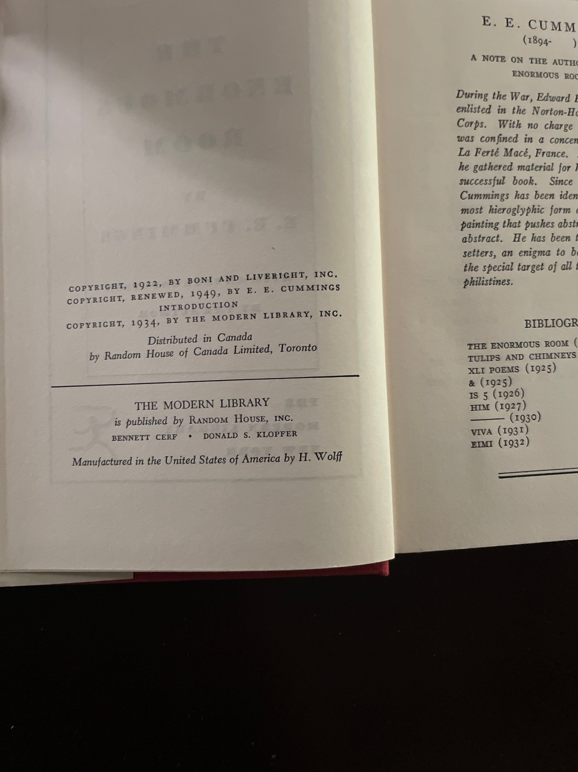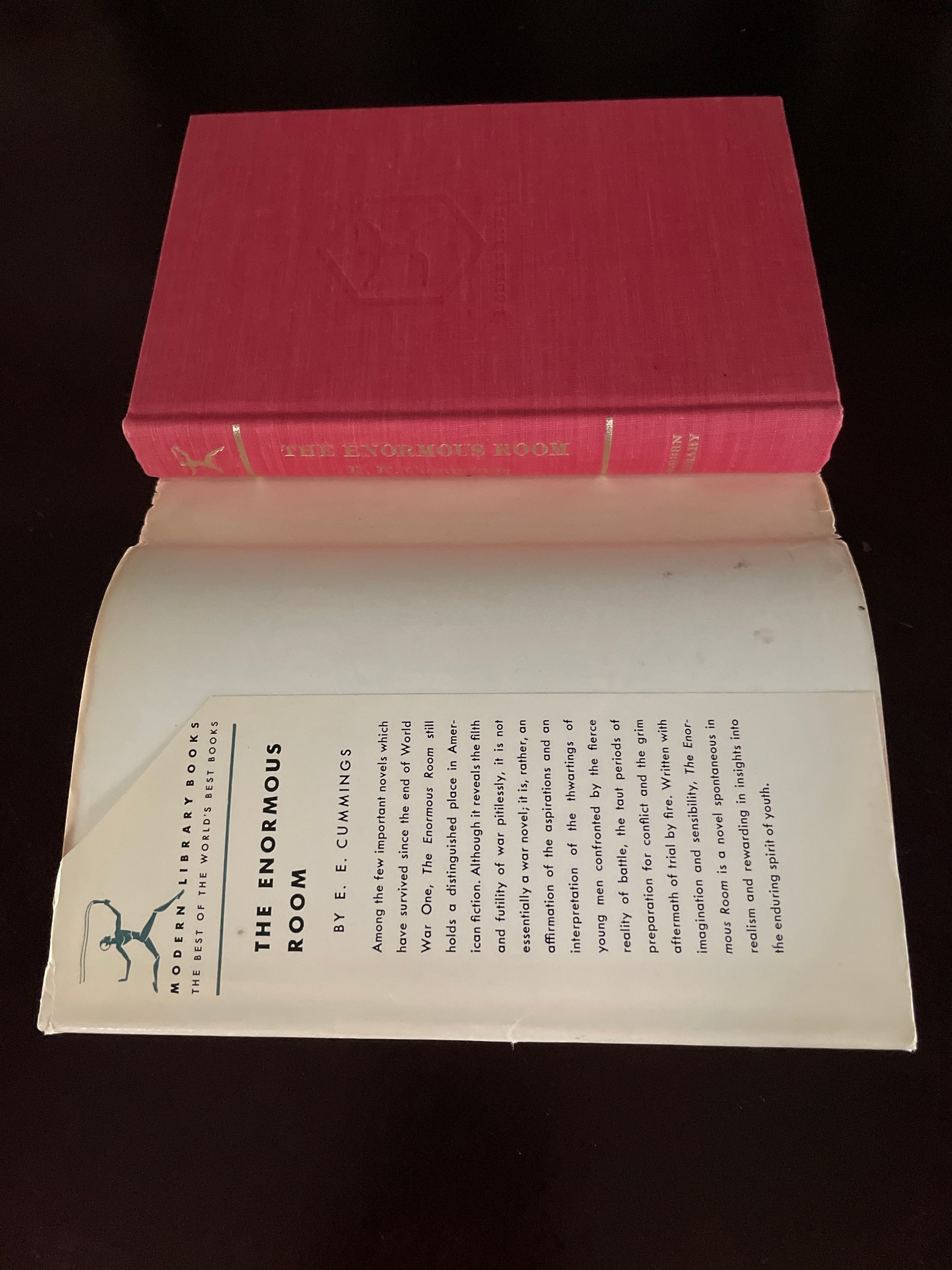 Clean, tight, unmarked; very light wear to edges of dust jacket - dj is lightly rubbed with a couple of very small stains on front cover - price clipped; red cloth covers with gilt titles on spine; very minimal wear; Among the few important novels which have survived since the end of WWI, The Enormous Room still hold a distinguished place in American fiction. Although it reveals the filth and futility of war pitilessly, it is not essentially a war novel; it is, rather an affirmation of the aspirations and an interpretation of the thwartings of young men confronted by the fierce reality of battle, the taut periods of preparation for conflict and the grim aftermath of trial by fire. Written with imagination and sensibility, this is a novel spontaneous in realism and rewarding in insights into the enduring spirit of youth.