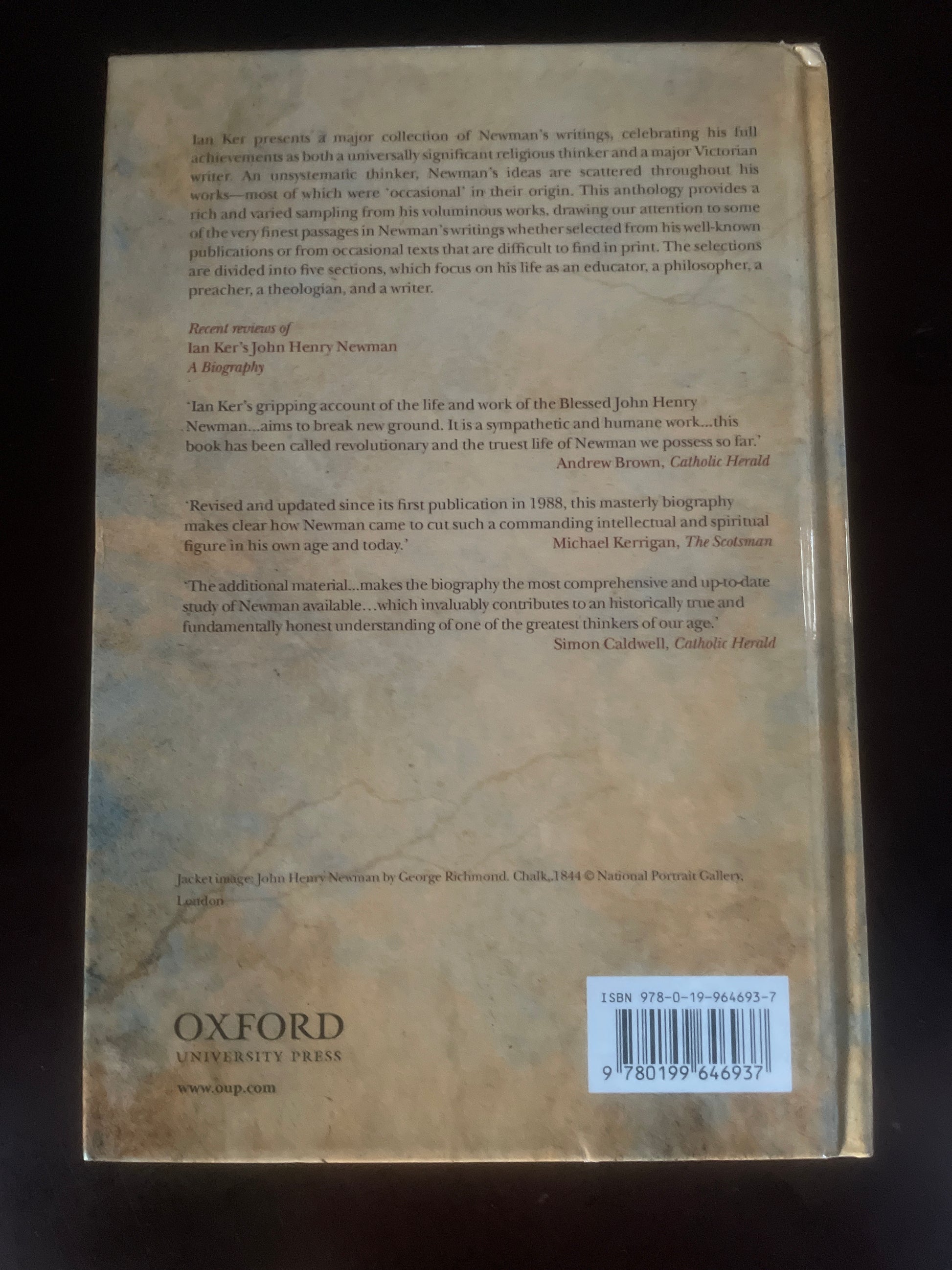 Clean, tight, unmarked; slightest of wear to corners and inside edge; otherwise absolute minimal wear; appears unread; Ian Ker presents a major collection of Newman's writings, celebrating his full achievements as both a universally significant religious thinker and a major Victorian writer. An unsystematic thinker, Newman's ideas are scattered throughout his works - most of which were 'occasional' in their origin. This anthology provides a rich and varied sampling from his voluminous works, drawing our attention to some of the very finest passages in Newman's writings whether selected from his well-known publications or from occasional texts that are difficult to find in print. The selections are divided into five sections which focus on his life as an educator, and philosopher, a preacher, a theologian, and a writer.