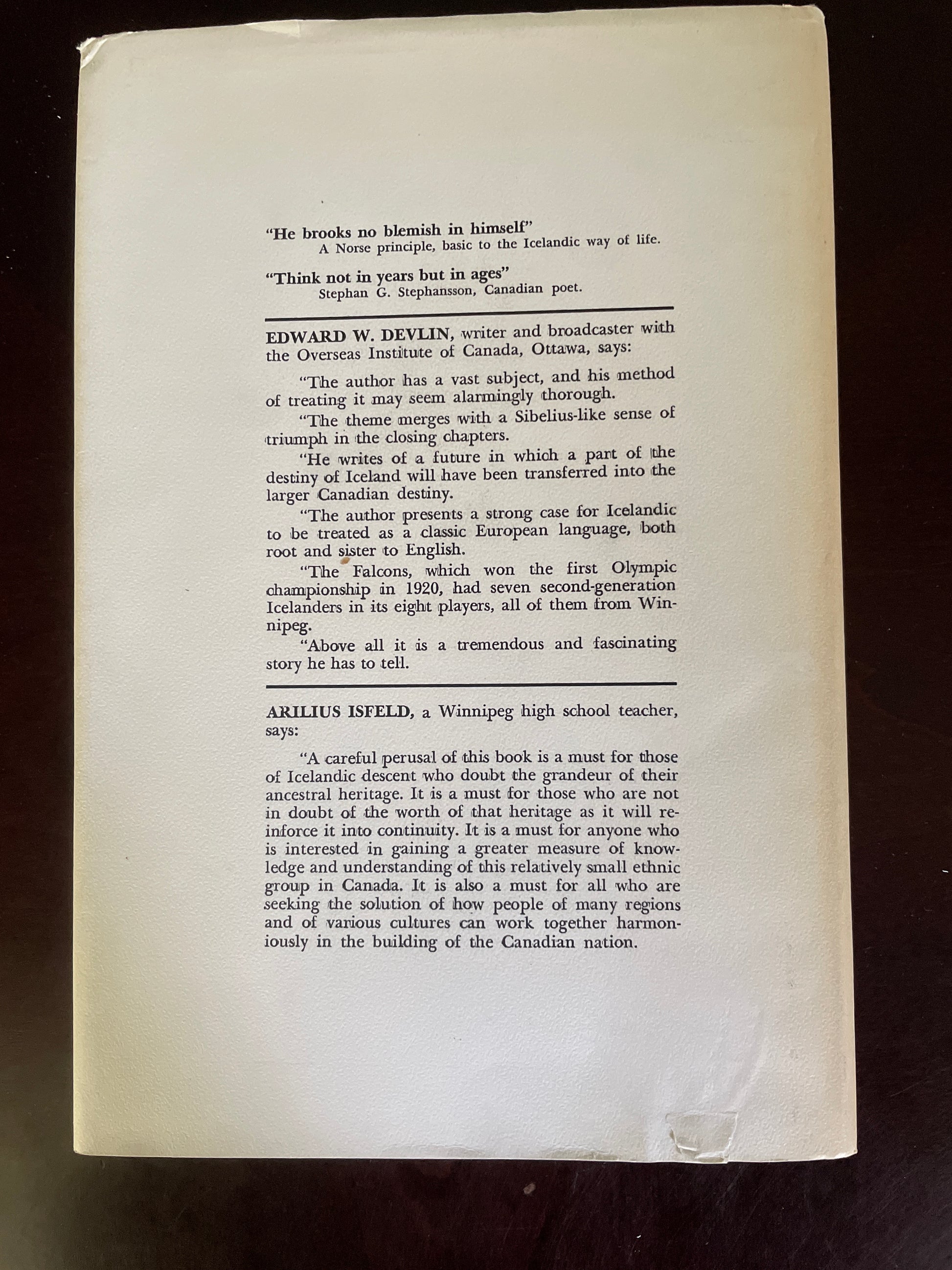 SIGNED BY W.J. LINDAL on ffep; Clean, tight, unmarked; very light edge wear to dust jacket; otherwise very minimal wear; The purpose of the book is to show that back in Iceland certain qualities of mind developed. Those qualities have been strengthened through the adversities of the Icelandic people have had to endure and they are the qualities which produced the Icelandic Canadian 'harvest' of achievement during the 90 odd years to the production of this book.