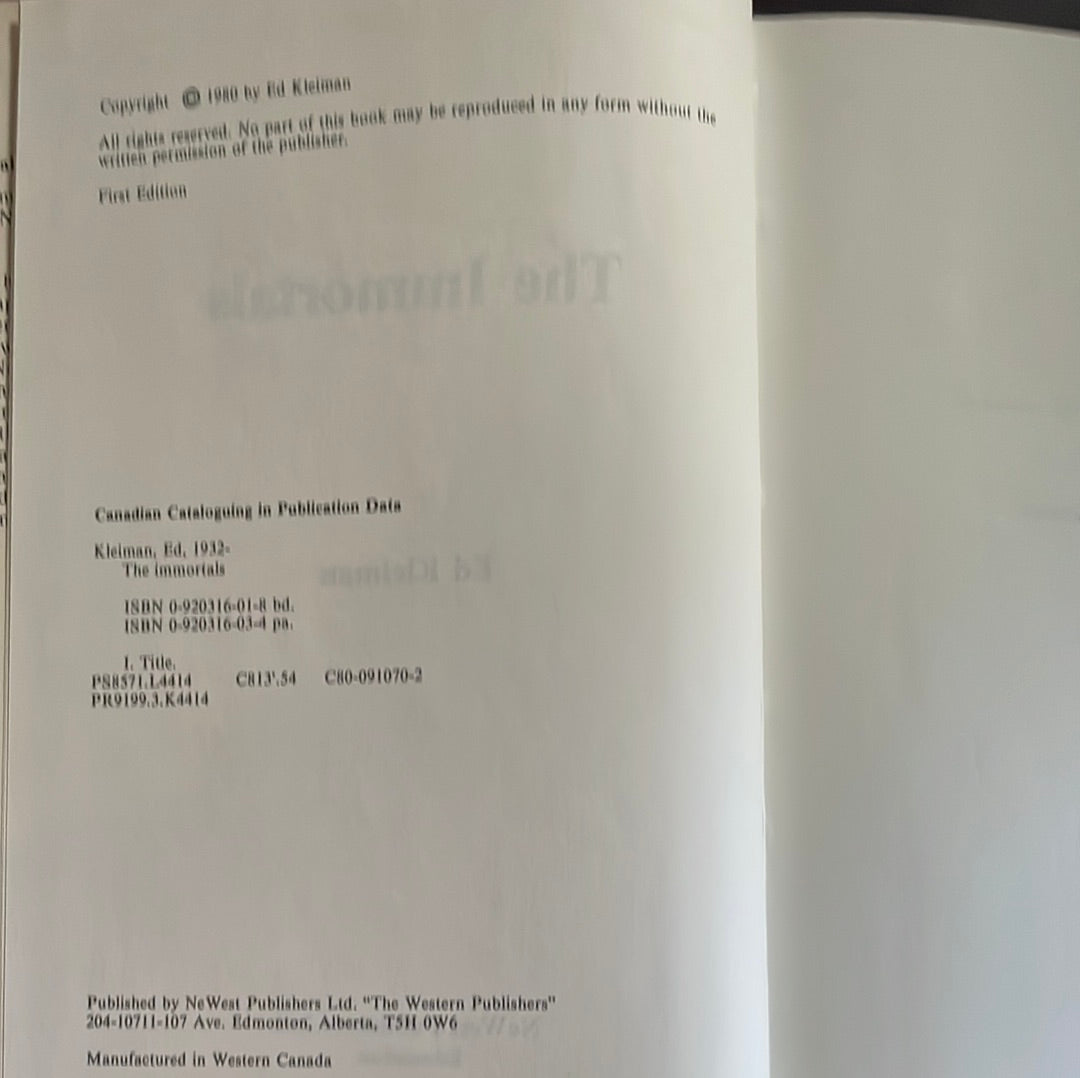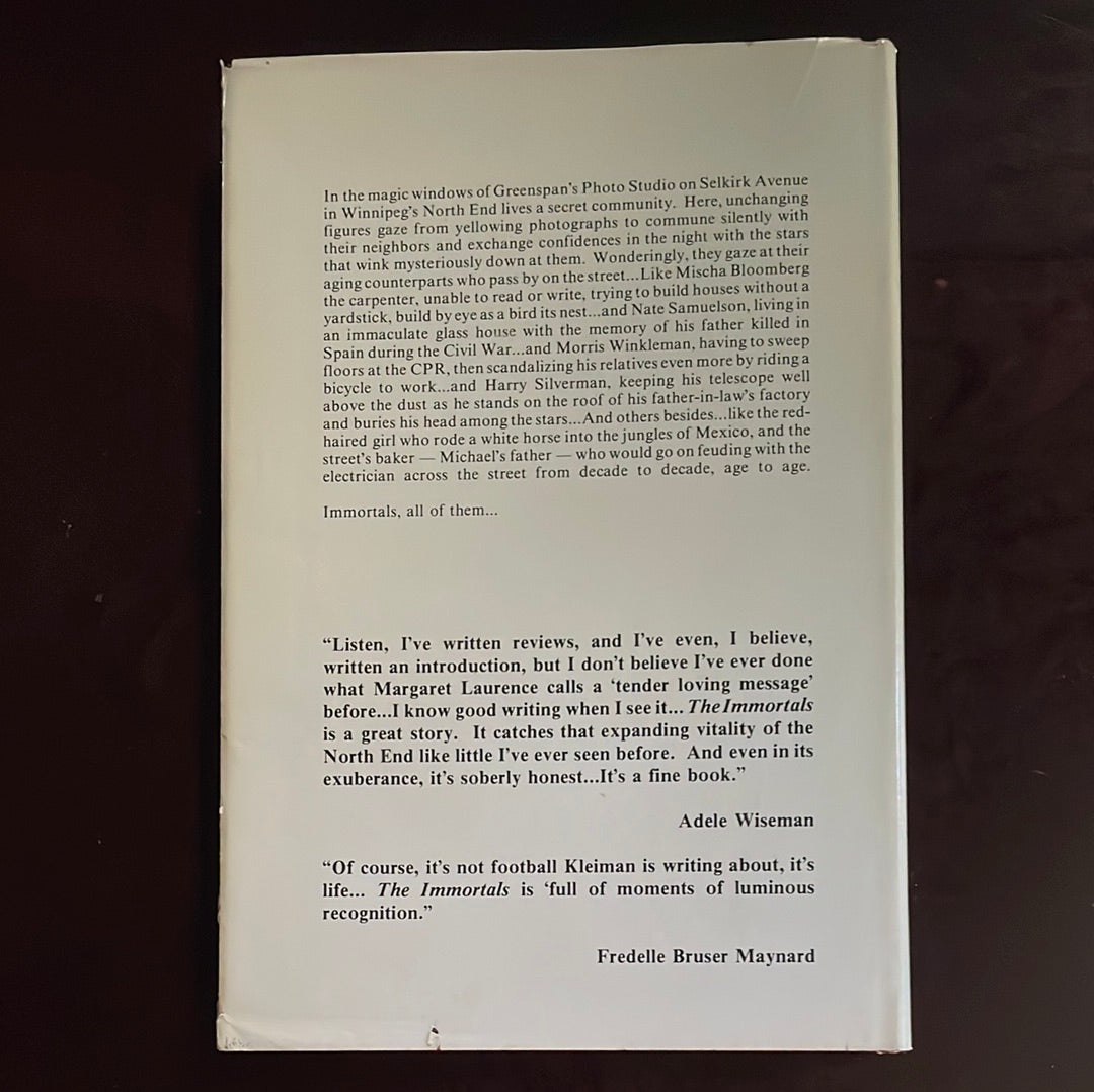 Clean, tight, unmarked; a few very small chips and tears to edges of dust jacket; otherwise bright, unfaded; very minimal wear; In the magic windows of Greenspan's Photo Studio on Selkirk Avenue in Winnipeg's North End lives a secret community. Here, unchanging figures gaze from yellowing photographs to commune silently with their neighbors and exchange confidences in the night with the stars that wink mysteriously down at them. Immortals, all of them... Ed Kleiman has a rare ability to capture the life and likeness of a place he knows well - Winnipeg's North End. Always touching, often humorous and sometimes tragic, the people of his stories are vividly alive with the unique energy of a distinctive Canadian community.