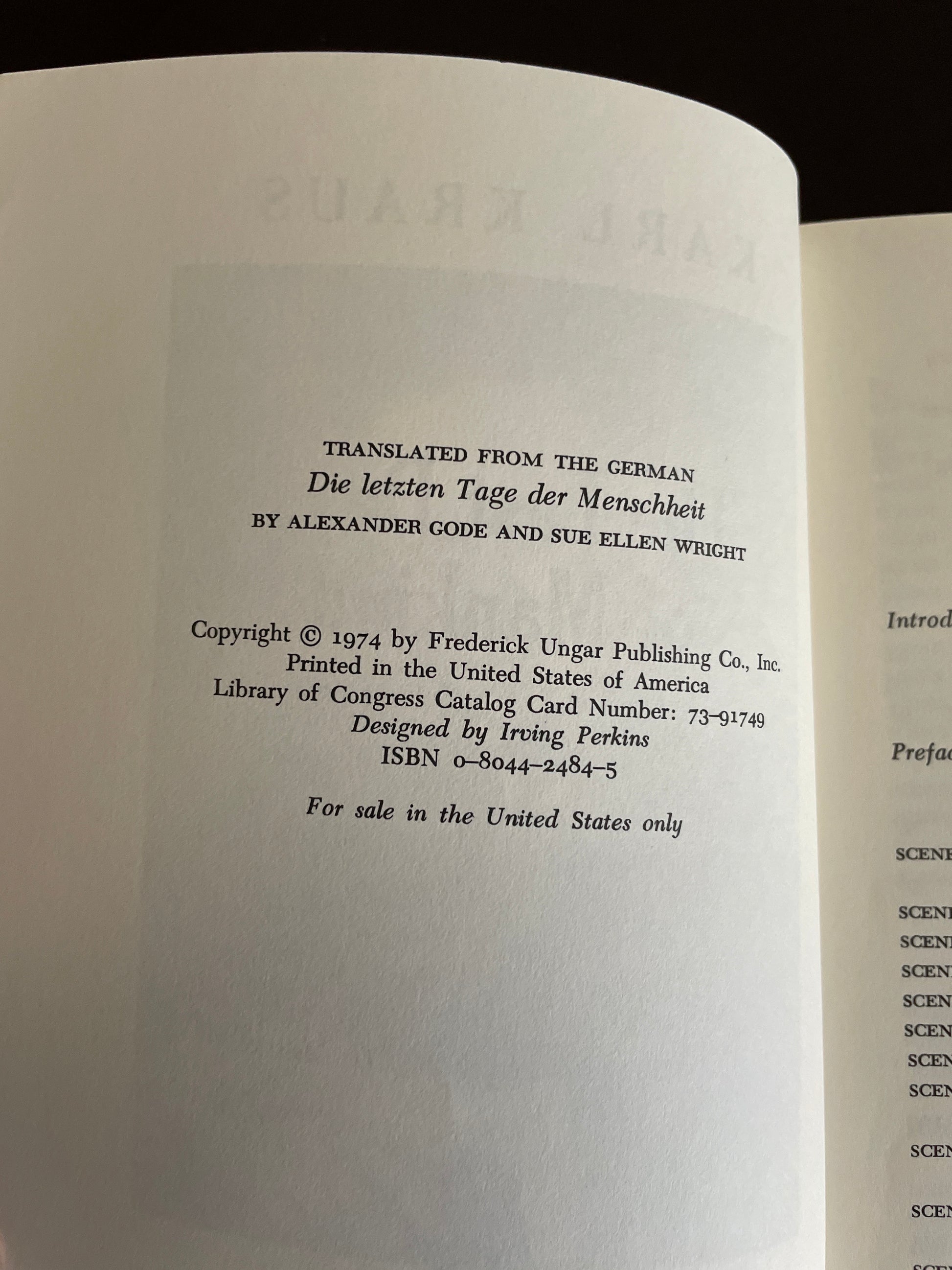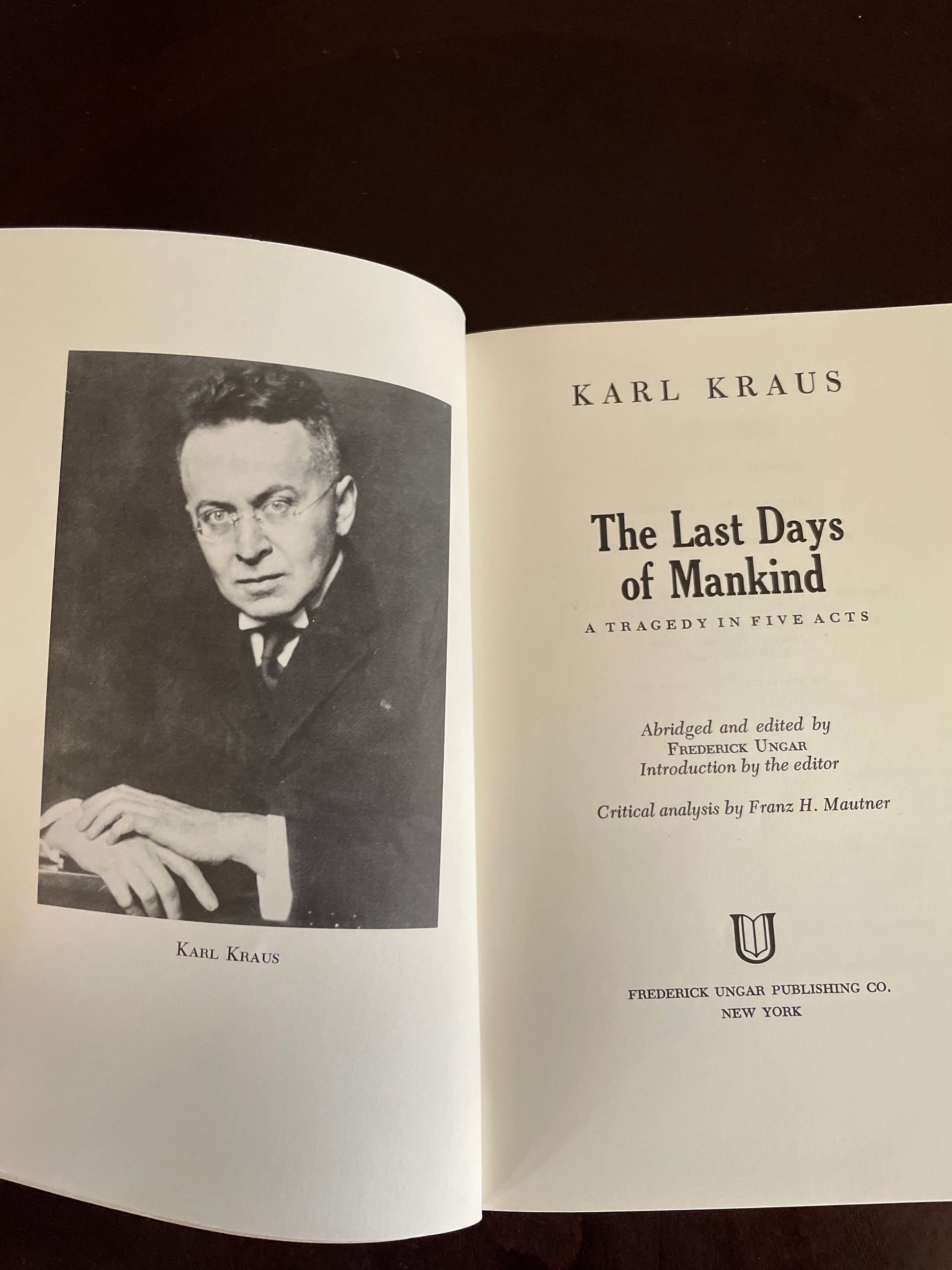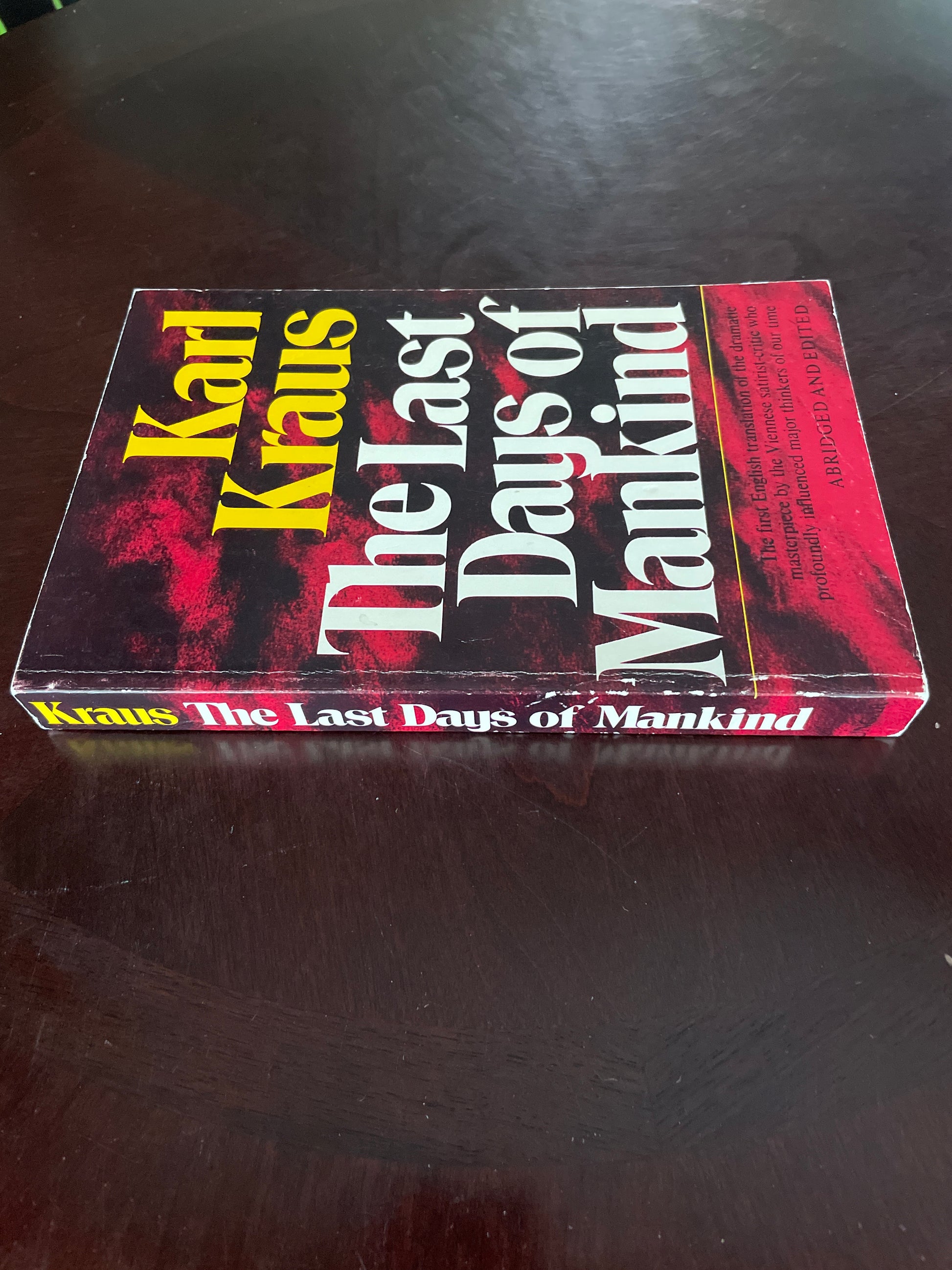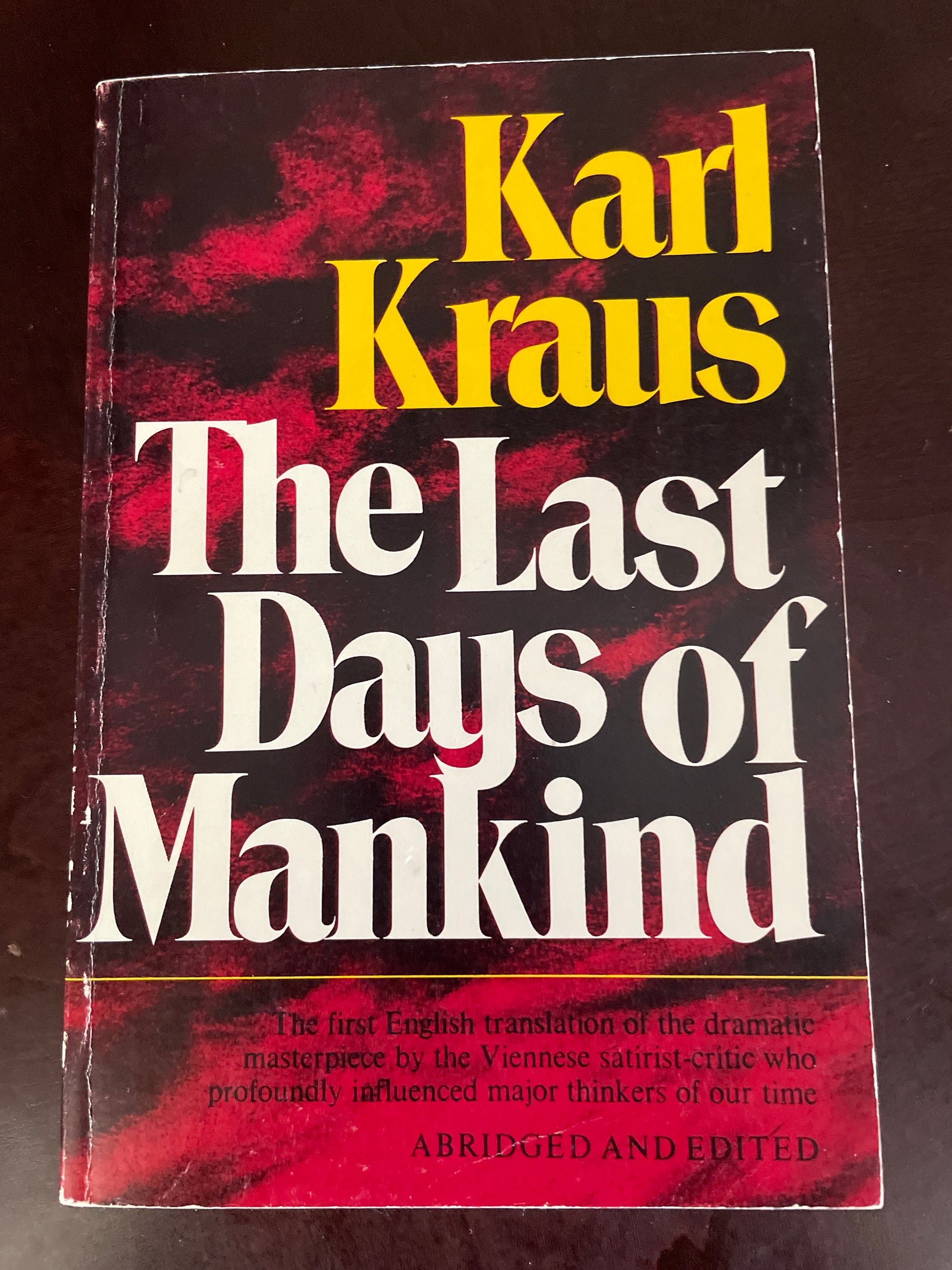 Clean, tight, unmarked; light wear to edges of covers; age tanned; otherwise spine straight and uncreased; very minimal wear; Translated from the German by Alexander Gode and Sue Ellen Wright; Kraus's iconic WWI drama is a satirical indictment of the glory of war. Presented here in English for the first time, in an abridged version that preserves the essence of the 800-page original. Its influence on Brecht, Ionesco, and other playwrights is acknowledged. Mingling actual quotations, news reports, and government orders with Kraus's own satiric dialogue, this immense drama (never meant to be performed) offers a vast fresco of events at the front and at home during, as it prophesied, the last days of the Austro-Hungarian Empire. Indeed, Kraus anticipated the development of atomic warfare and its threat to all mankind.