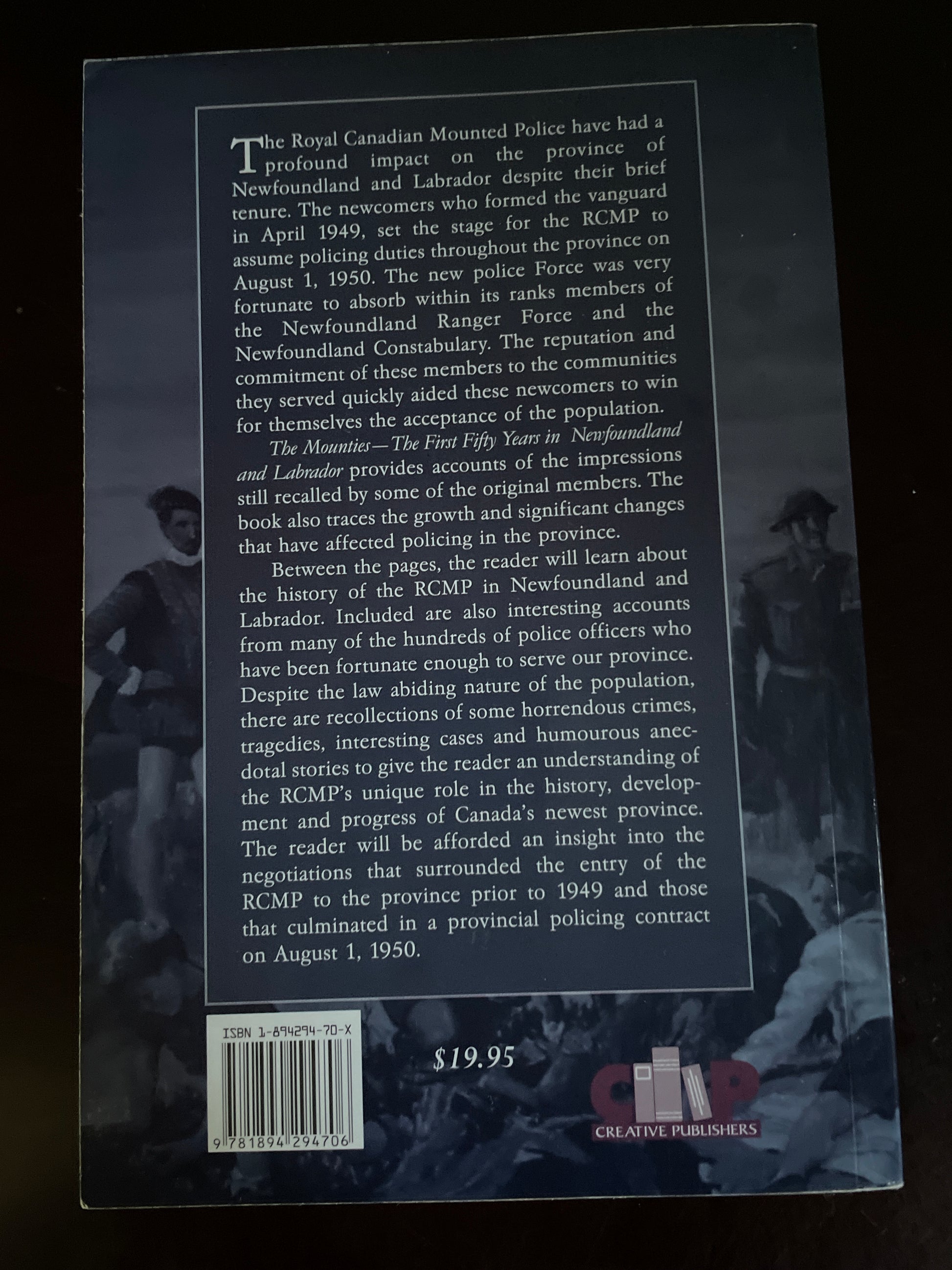Clean, tight, unmarked; absolute minimal wear; appears unread; The Mounties provides accounts of the impressions still recalled by some of the original members. The book also traces the growth and significant changes that have affected policing in the province. Between the pages, the reader will learn about the history of the RCMP in Newfoundland and Labrador. Included are also interesting accounts for many of the hundreds of police officers who have been fortunate enough to serve our province. Despite the law abiding nature of the population, there are recollections of some horrendous crimes, tragedies, interesting cases and humourous anecdotal stories to give the reader an understanding of the RCMP's unique role in the history, development and progress of Canada's newest province.