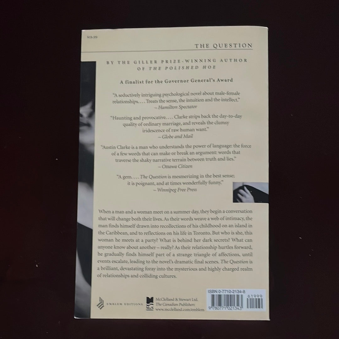 Clean, tight, unmarked; very minimal wear; appears unread; When a man and a women meet on a summer day, they begin a conversation that will change both their lives. As their words weave a web of intimacy, the man finds himself drawn into recollections of his childhood on an island in the Caribbean, and to reflections on his life in Toronto. But who is she, this woman he meets at a party? What is behind her dark secrets? What can anyone know about another - really? As their relationship hurtles forward, he gradually finds himself part of a strange triangle of affections, until events escalate, leading to the novel's dramatic final scenes. The Question is a brilliant, devastating foray into the mysterious and highly charged realm of relationships and colliding cultures.