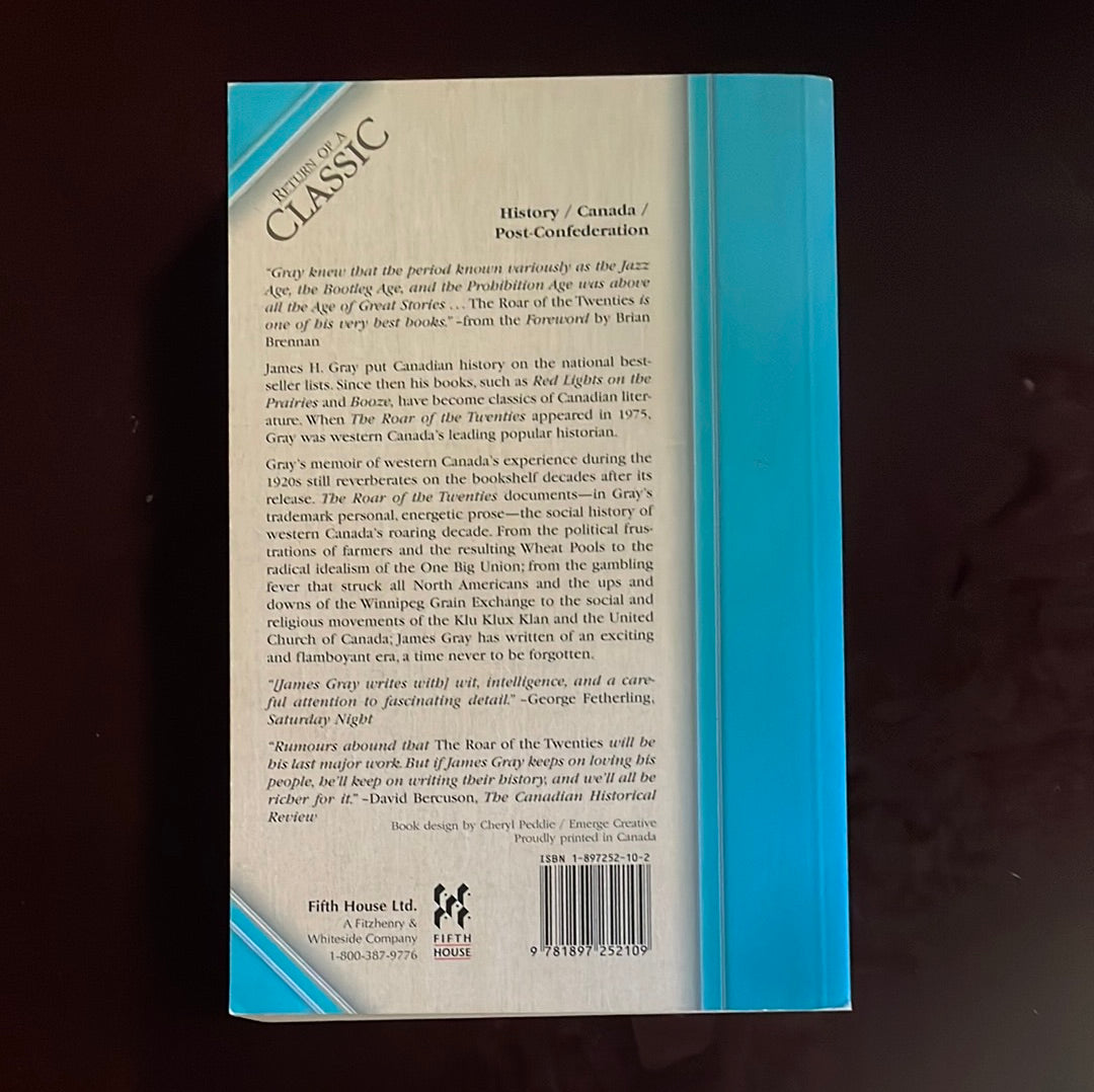 Clean, tight, unmarked; slight wear to inside corners; otherwise absolute minimal wear; appears unread; Gray's memoir of Western Canada's experience during the 1920s still reverberates on the bookshelf decades after its release. This book documents - in Gray's trademark personal energetic prose - the social history of western Canada's roaring decade. From the political frustrations of farmers and the resulting Wheat Pools to the radical idealism of the One Big Union; from the gambling fever that struck all North Americans and the ups and downs of the Winnipeg Grain Exchange to the social and religious movements of the Klu Klux Klan and the United Church of Canada; James Gray has written of an exciting and flamboyant era, a time never to be forgotten.