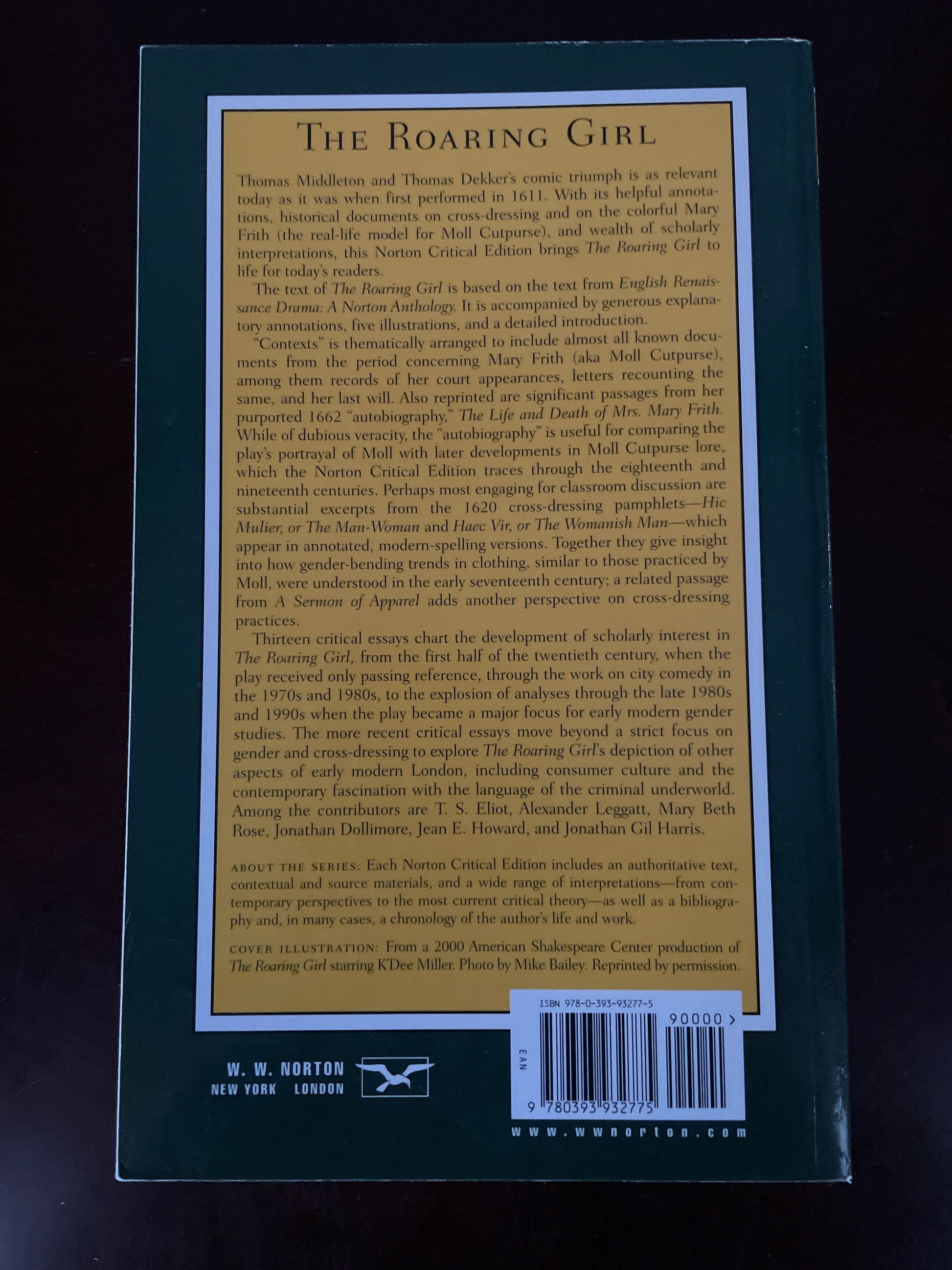 Clean, tight, unmarked; very minimal wear; spine straight and uncreased; appears unread; As relevant today as it was when first performed in 1611. With its helpful annotations, historical documents on cross-dressing and on the colorful Mary Frith, and wealth of scholarly interpretations, this Norton Critical Edition brings this dramatic play to life for today's readers. It is accompanied by generous explanatory annotations, five illustrations, and a detailed introduction. Perhaps most engaging for classroom discussion are substantial excerpts from the 1620 cross-dressing pamphlets which appear in annotated, modern-spelling versions. Together they give insight into how gender-bending trends in clothing, similar to those practiced by Moss, were understood in the early 17th century...