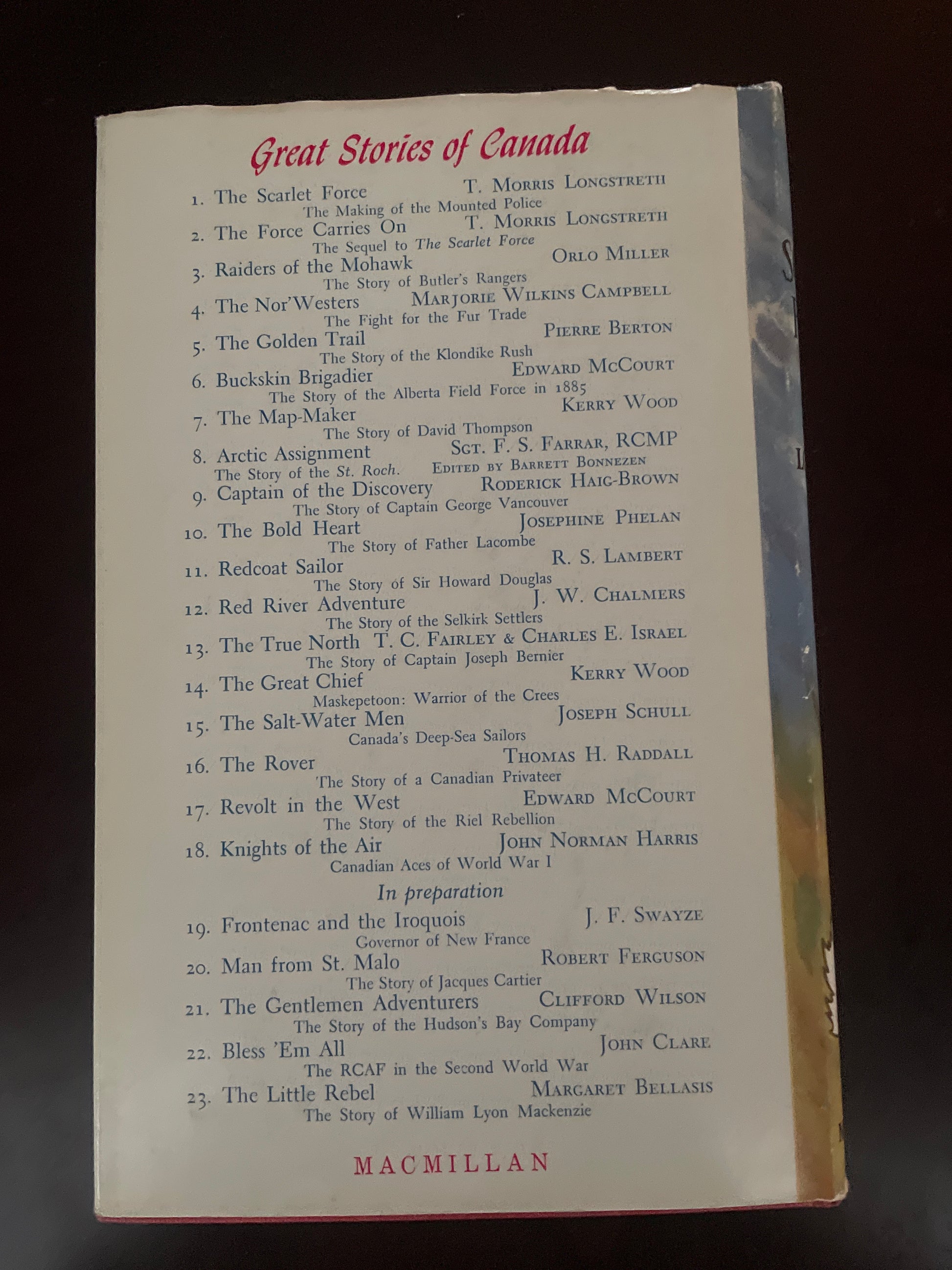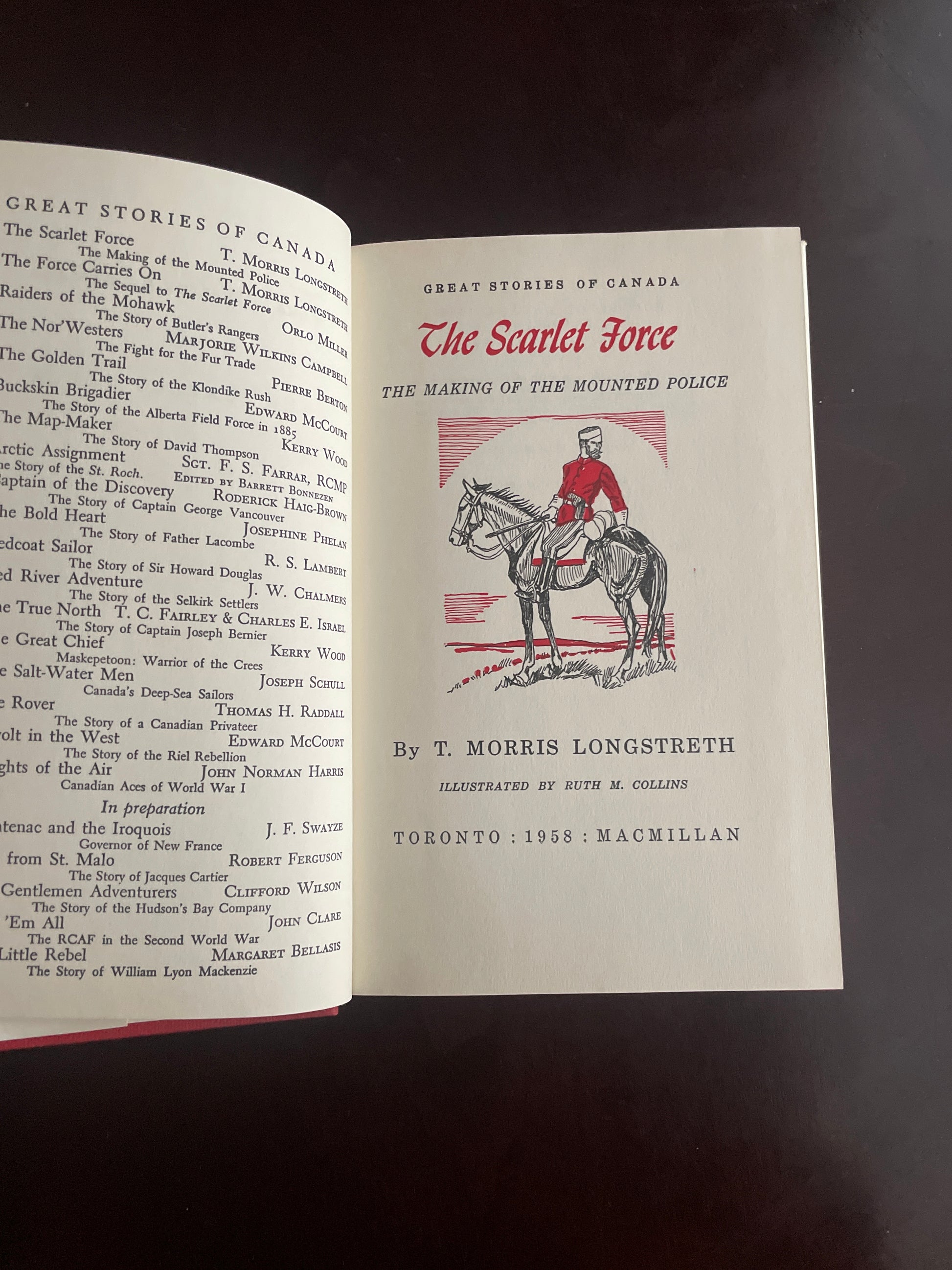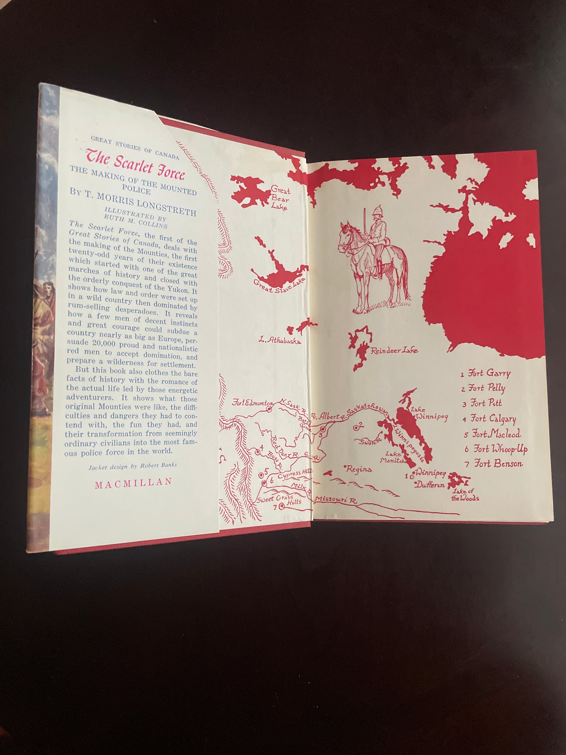 Clean, tight, unmarked; slight wear to edges of dust jacket; price clipped; otherwise very minimal wear; dust jacket is bright and unfaded; red covers with navy and dark yellow titles and design; This book deals with the making of the Mounties, the first twenty-odd years of their existence which started with one of the great marches of history and closed with the orderly conquest of the Yukon. It shows how law and order were set up in a wild country then dominated by rum-selling desperadoes. But this book also clothes the bare facts of history with the romance of the actual life led by those energetic adventurers. It shows what those original Mounties were like, the difficulties and dangers they had to contend with, the fun they had, and their transformation from seemingly ordinary civilians into the most famous police force in the world. - from the cover and with a 1958 perspective