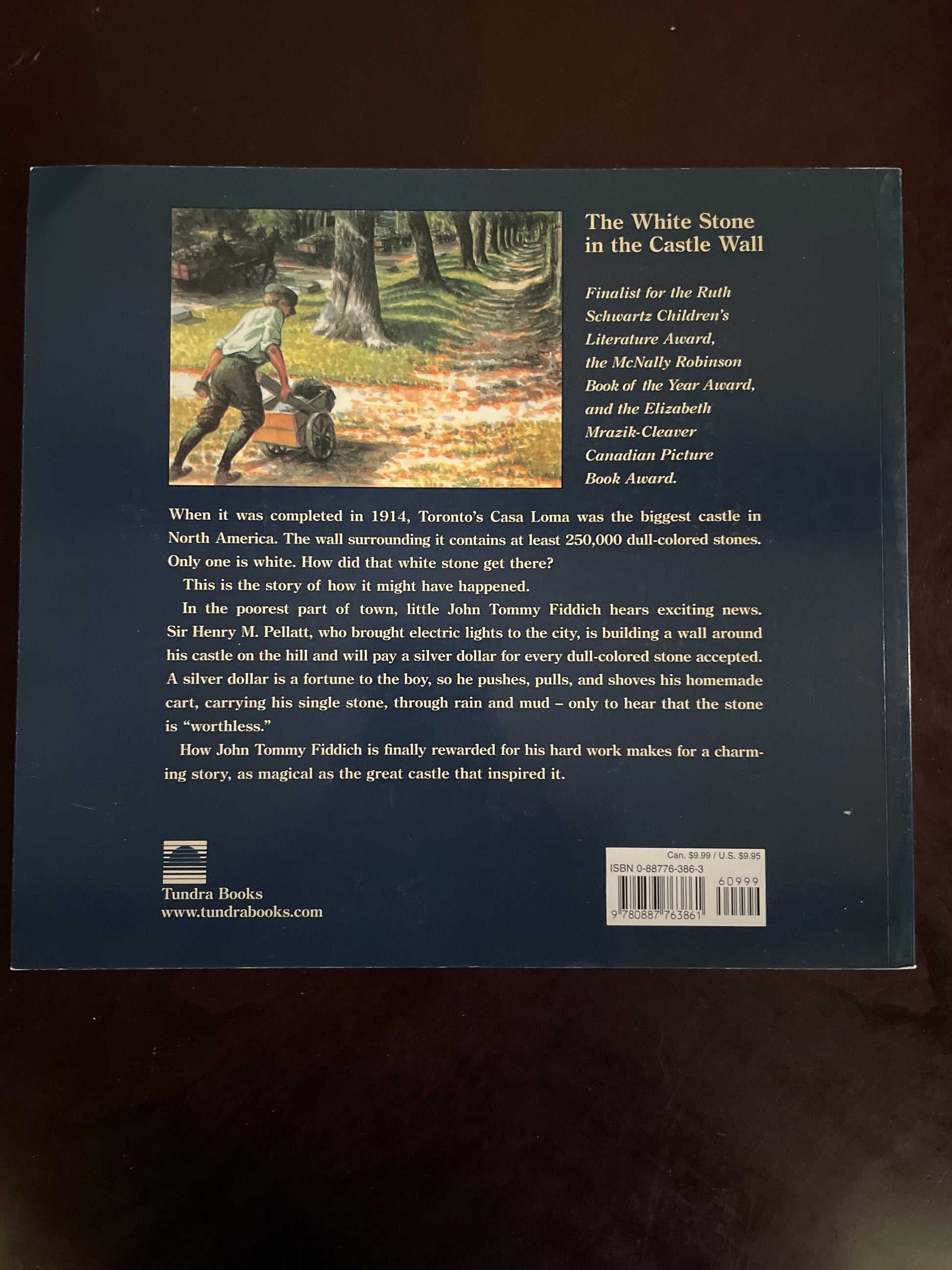 Clean, tight, unmarked; slight wear to upper inside corner; otherwise absolute minimal wear; appears unread; When it was completed in 1914, Toronto's Casa Loma was the biggest castle in North Amerca. The wall surrounding it contains as least 250.000 dull-colored stones. Only one is white. How did that white stone get there? This is the story of how it might have happened. In the poorest part of town, little John Tommy Fiddich hears exciting news. Sir Henry M. Pellatt, who brought electric lights to the city, is building a wall around his castle on the hill and will pay a silver dollar for every dull-colored stone accepted. A silver dollar is a fortune to the boy, so he pushes, pulls, and shoves his homemade cart, carrying his single stone, through rain and mud - only to hear that the stone is "worthless." How John Tommy Fiddich is finally rewarded for his hard work makes for a charming story, as magical as the great castle that inspired it.