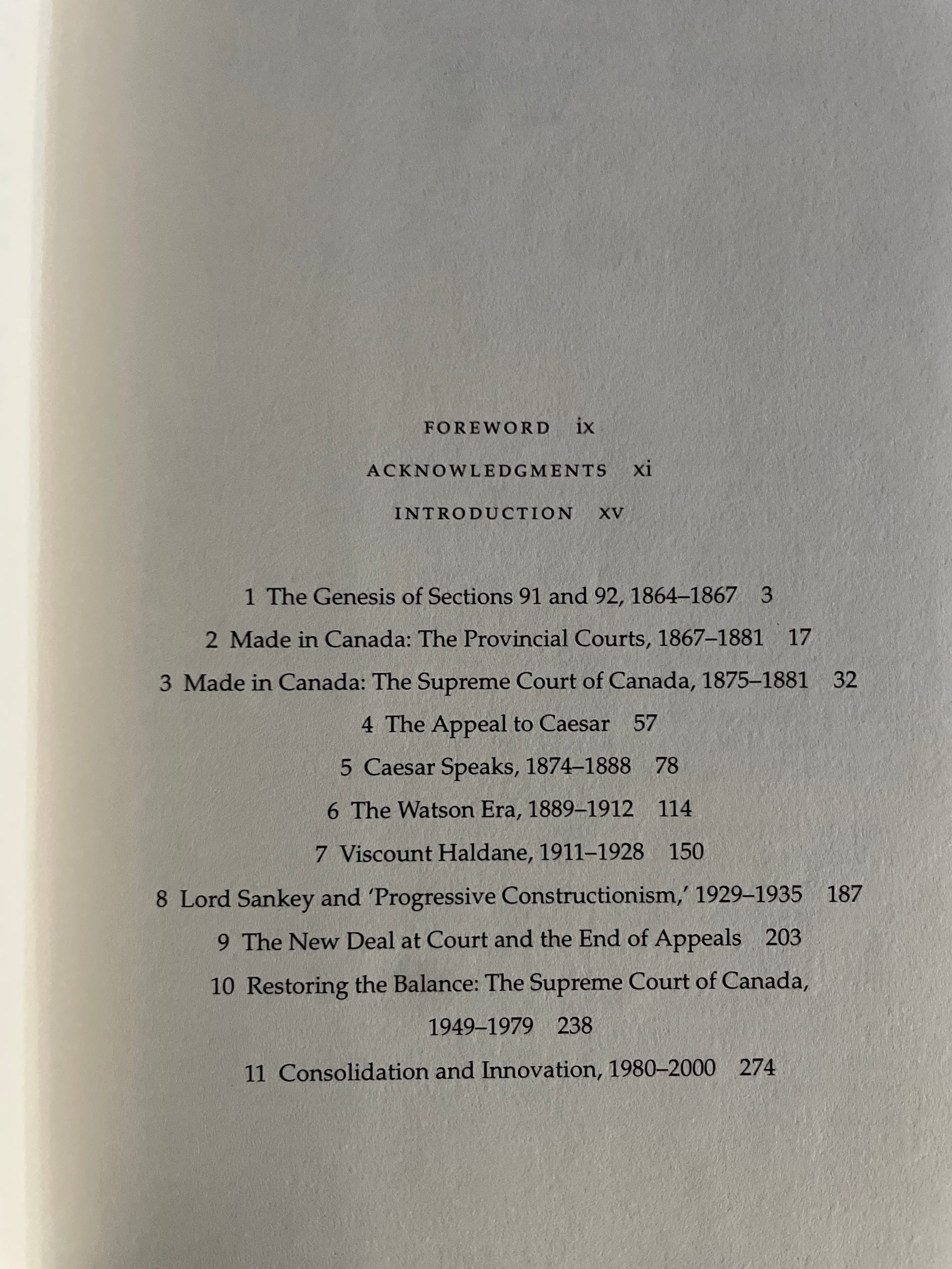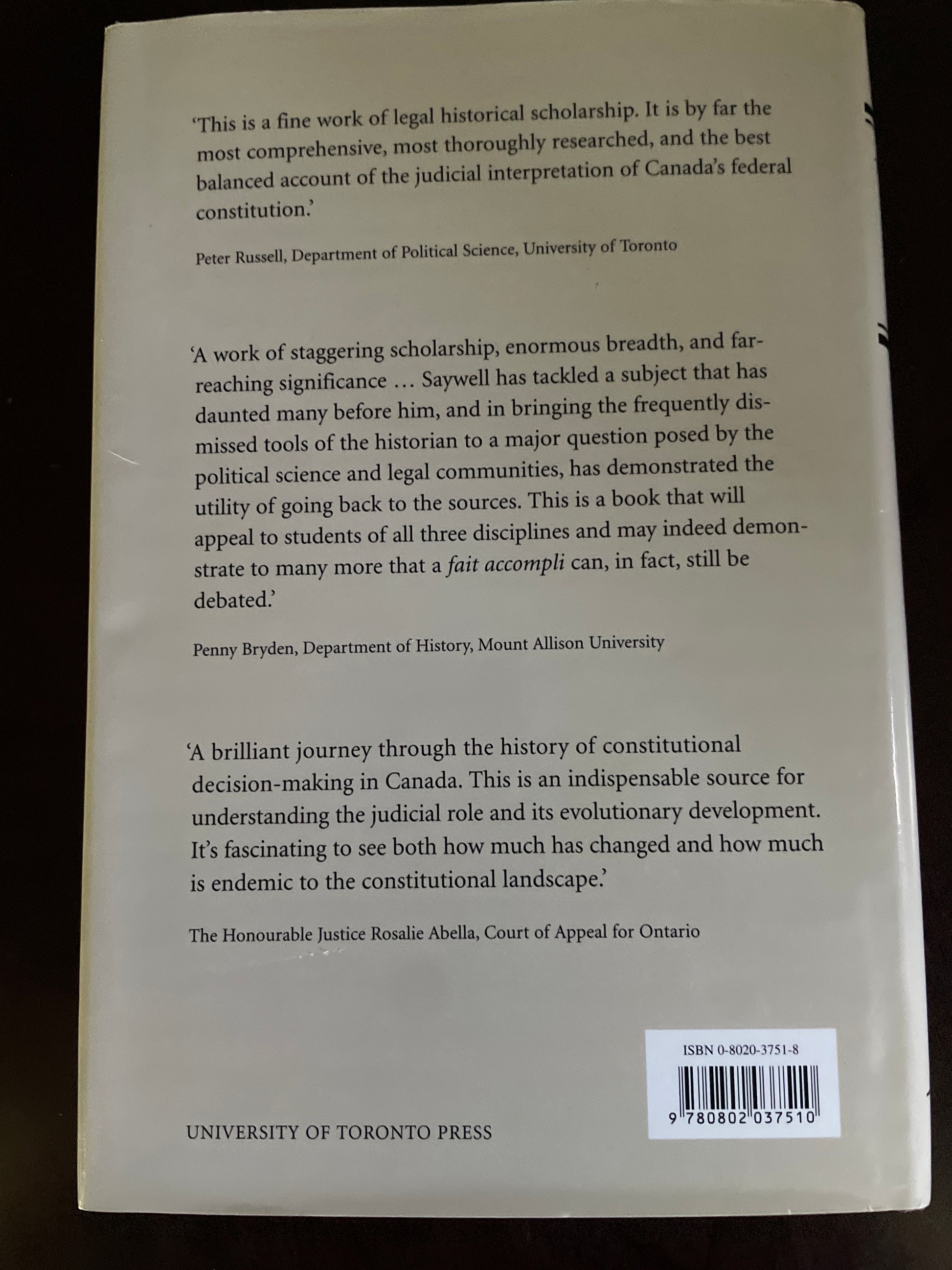 Clean, tight, unmarked; slight wear to upper spine extreme; burgundy covers with gilt titles; absolute minimal wear; As written, the British North America Act of 1867 should have provided the authoritative guide to the law governing the division of powers between the national and provincial governments of Canada, but by the 1940s the federal constitution was a very different document from that composed originally by John A. Macdonald and his colleagues. In this thorough and engaging examination of the critical role of the courts - the Judicial Committee of the Privy Council and the Supreme Court of Canada - in shaping Canadian federalism, John Saywell argues that the courts always have and still do 'make law' - law that can be largely subjective and that often bears little relationship to the text or purposes of the Canadian constitution.