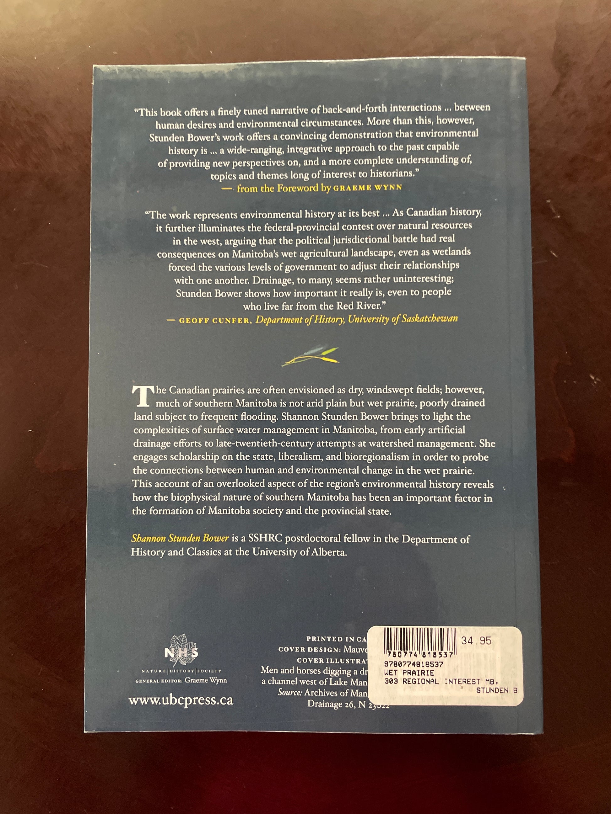 Clean, tight, unmarked; absolute minimal wear; appears unread; The Canadian prairies are often envisioned as dry, windswept fields; however, much of southern Manitoba is not arid plain but wet prairie, poorly drained land subject to frequent flooding. Shannon Stunden Bower brings to light the complexities of surface water management in Manitoba, from early artificial drainage efforts to late 20th century attempts at watershed management. She engages scholarship on the state, liberalism, and bioregionalism in order to probe the connections between human and environmental change in the wet prairie. This account of an overlooked aspect of the region's environmental history reveals how the biophysical nature of southern Manitoba has been an important factor in the formation of Manitoba society and the provincial state.