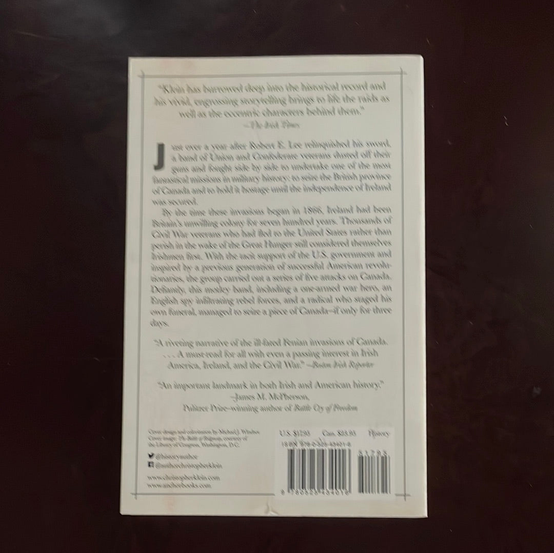 Clean, tight, unmarked; remainder mark to bottom edge; very small tear to bottom center edge of back cover; otherwise absolute minimal wear; spine straight and uncreased; appears unread; Just over a year after Robert E. Lee reliquished his sword, a band of Union and Confederate veterans dusted off their guns. But these former foes had no intention of reigniting the Civil War. Instead, they fought side by side to undertake one of the most fantastical missions in military history: to seize the British province of Canada and hold it hostage until the independence of Ireland was secured. This is the untold tale of a band of fiercely patriotic Irish Americans and their chapter in Ireland's centuries-long fight for independence. Inspiring, lively, and often undeniably comic, this is the story of fighting for what's right in the face of impossible odds.