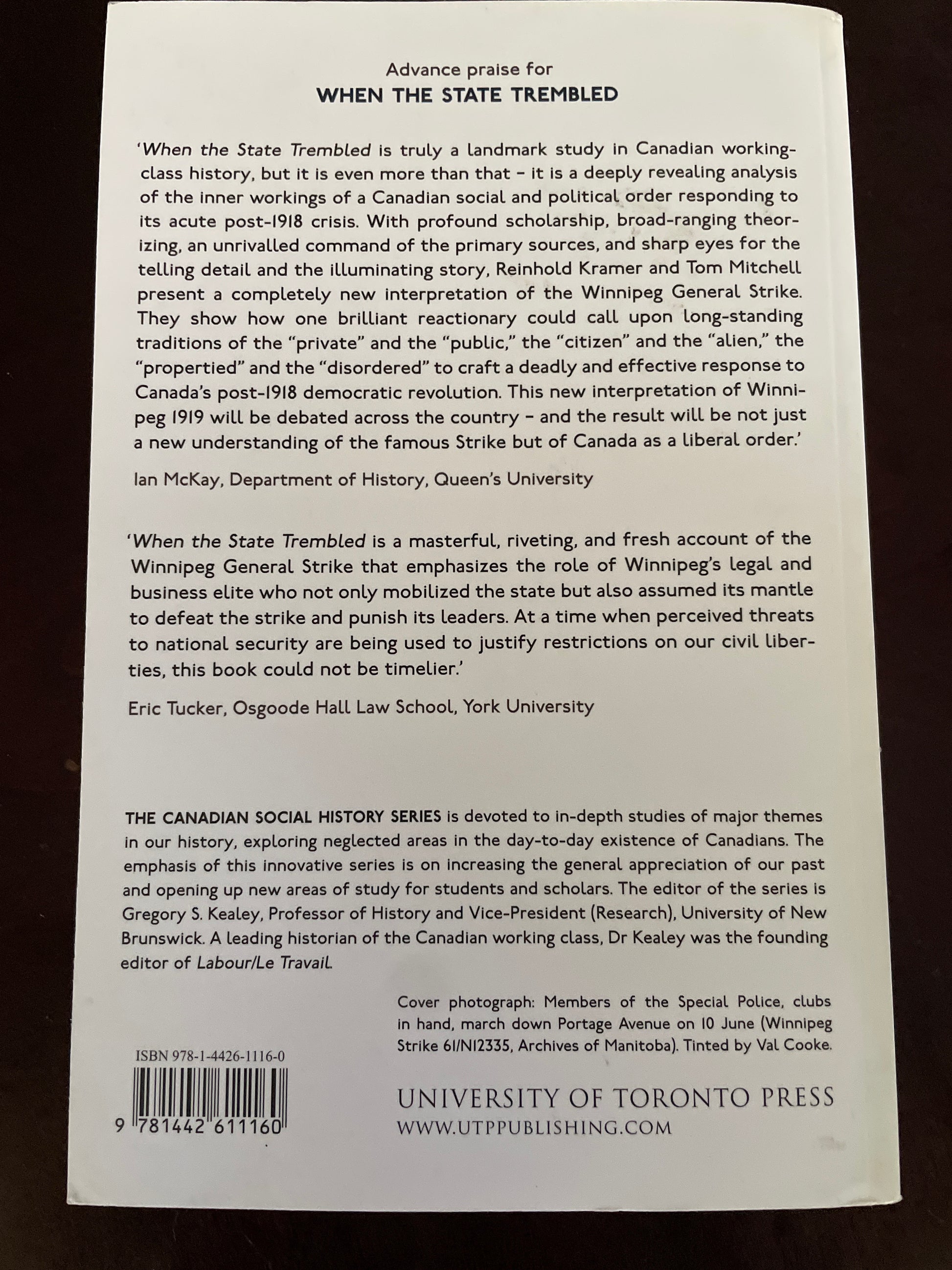 Clean, tight, unmarked; bump to upper back spine extreme; otherwise absolute general wear; appears unread; (This book) "is a masterful, riveting, and fresh account of the Winnipeg General Strike that emphasizes the role of Winnipeg legal and business elite who not only mobilized the state but also assumed its mantle to defeat the strike and punish its leaders. At a time when perceived threats to national security are being used to justify restrictions on our civil liberties, this book could not be timelier." - Eric Tucker