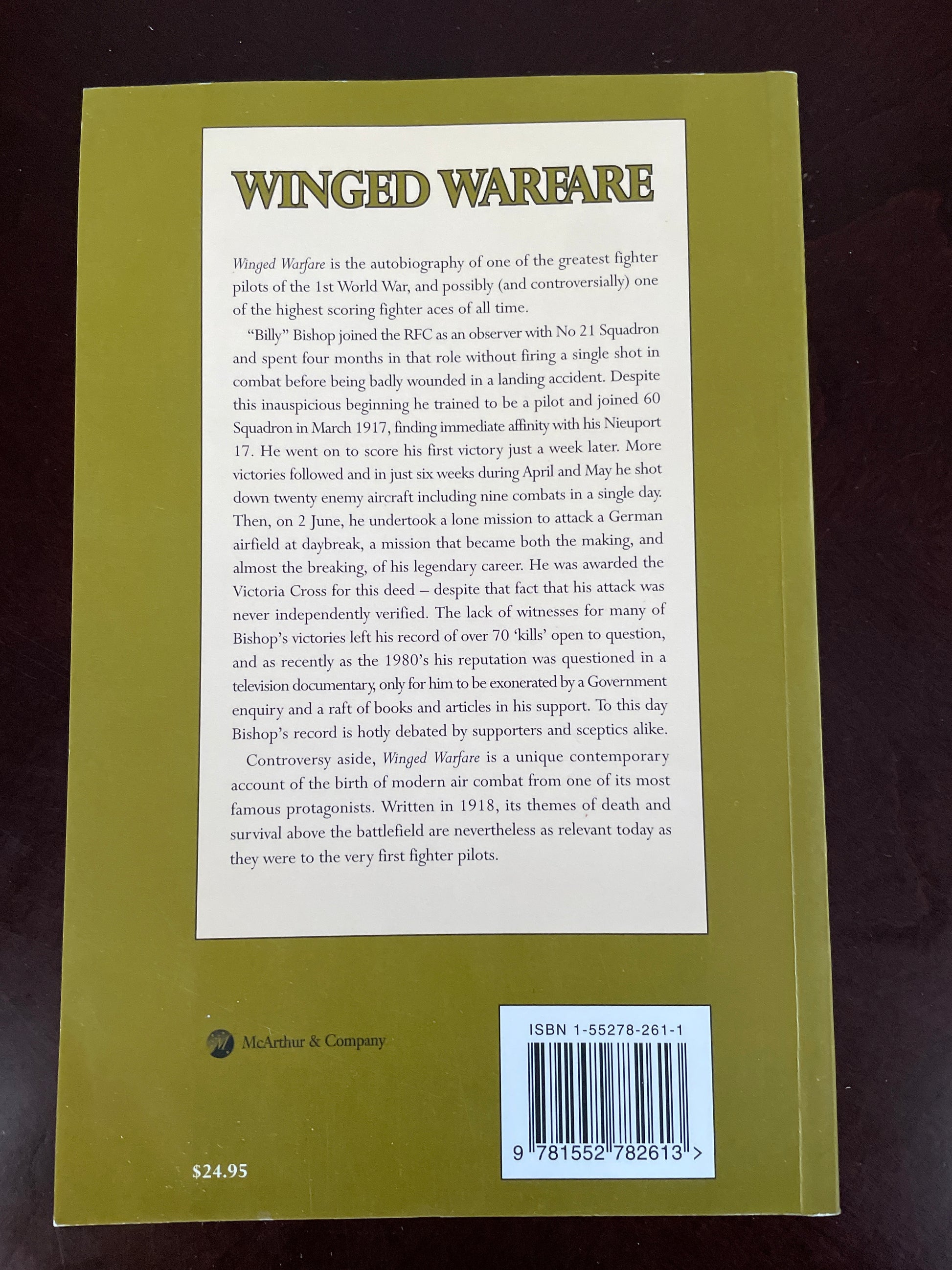 Clean, tight, unmarked; slightest of wear to bottom back corner; otherwise absolute minimal wear; appears unread; Winged Warfare is the autobiography of one of the greatest fighter pilots of WWI, and possibly (and controversially) one of the highest scoring fighter aces of all time. Controversy aside, Winged Warfare is a unique contemporary account of the birth of modern air combat from one of its most famous protagonists. Written 1918, its themes of death and survival above the battlefield are nevertheless as relevant today as they were to the very first fighter pilots.