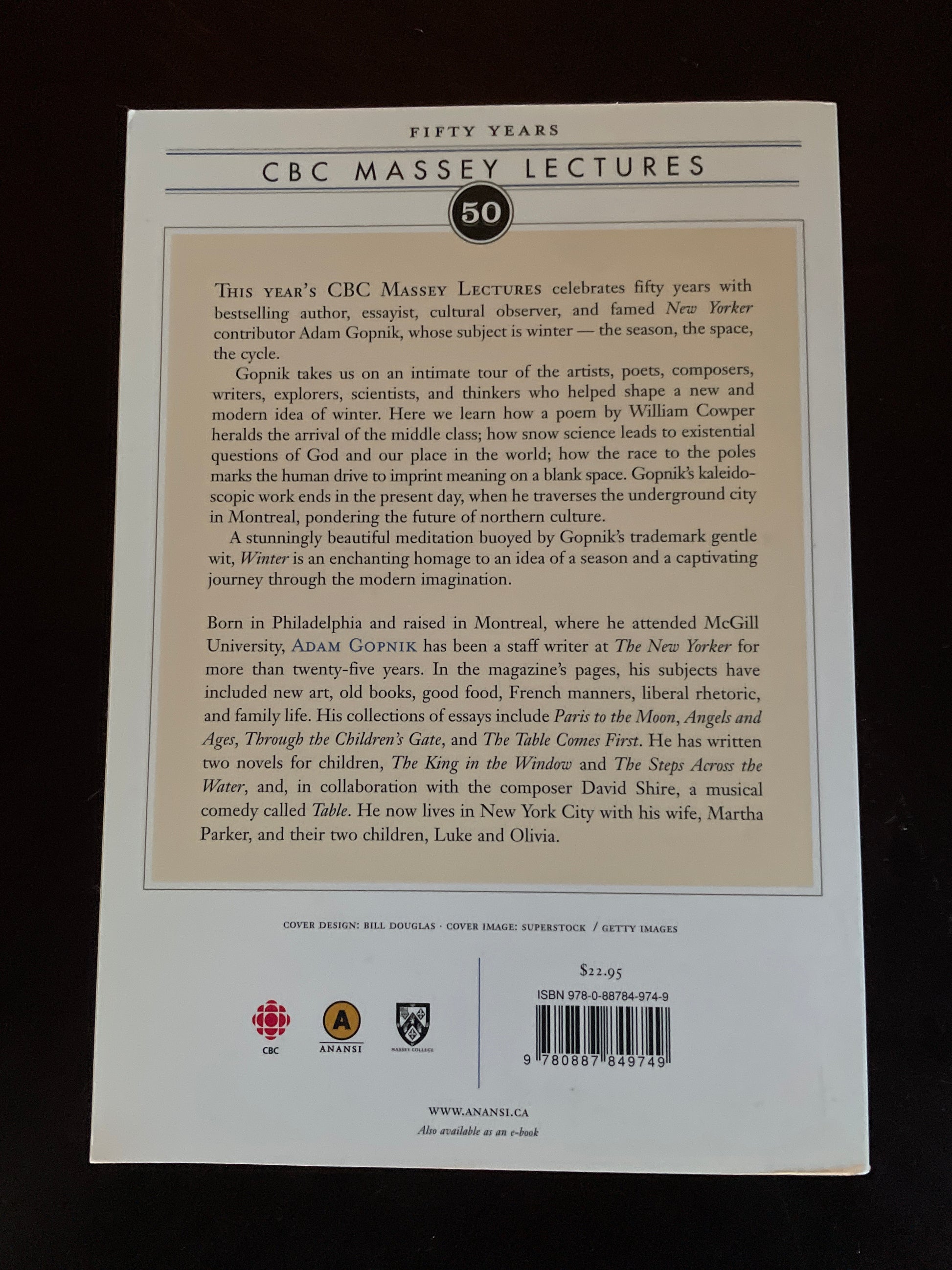 Clean, tight, unmarked; absolute minimal wear; appears unread; CBC Massey Lectures celebrates Adam Gopnik, whose subject is winter - the season, the space, the cycle. Gopnik takes us on an intimate tour of the artists, poets, composers, writers, explorers, scientists, and thinkers who helped shape a new and modern idea of winter. Here we learn how a poem by William Cowper heralds the arrival of the middle class; how snow science leads to existential questions of God and our place in the world; how the race to the poles marks the human drive to imprint meaning on a blank space. Gopnik's kaleidoscopic work ends in the present day, when he traverses the underground city in Montreal, pondering the future of northern culture.
